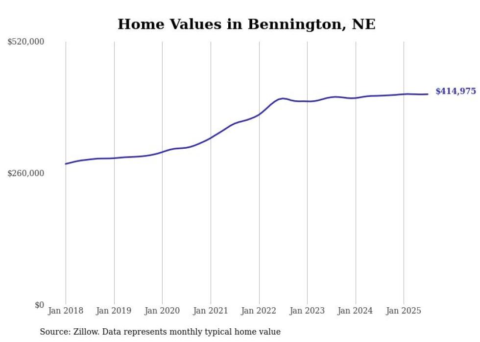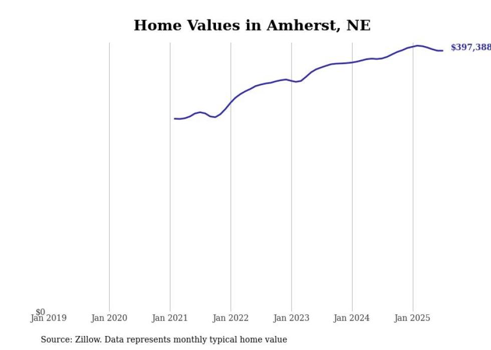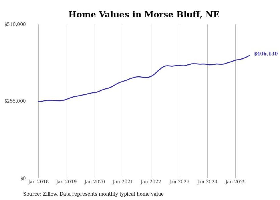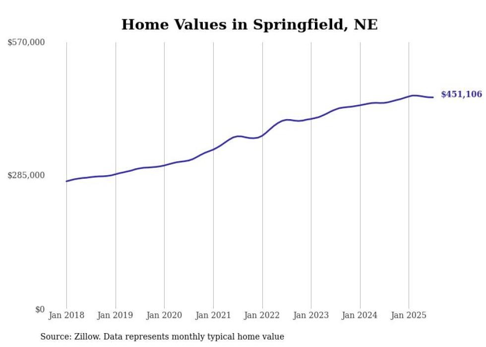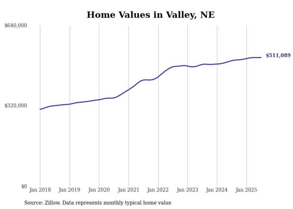 Stacker compiled a list of cities with the most expensive homes in Nebraska using data from Zillow. Cities are ranked by the Zillow Home Values Index for all homes as of July 2025. The charts in this story were created automatically using Matplotlib.