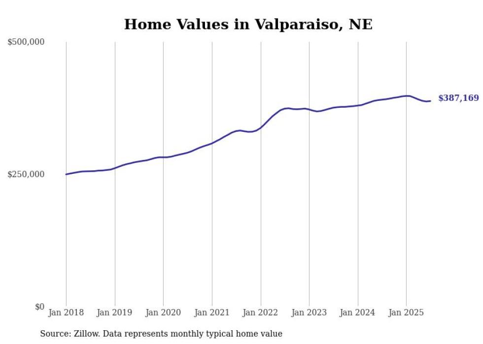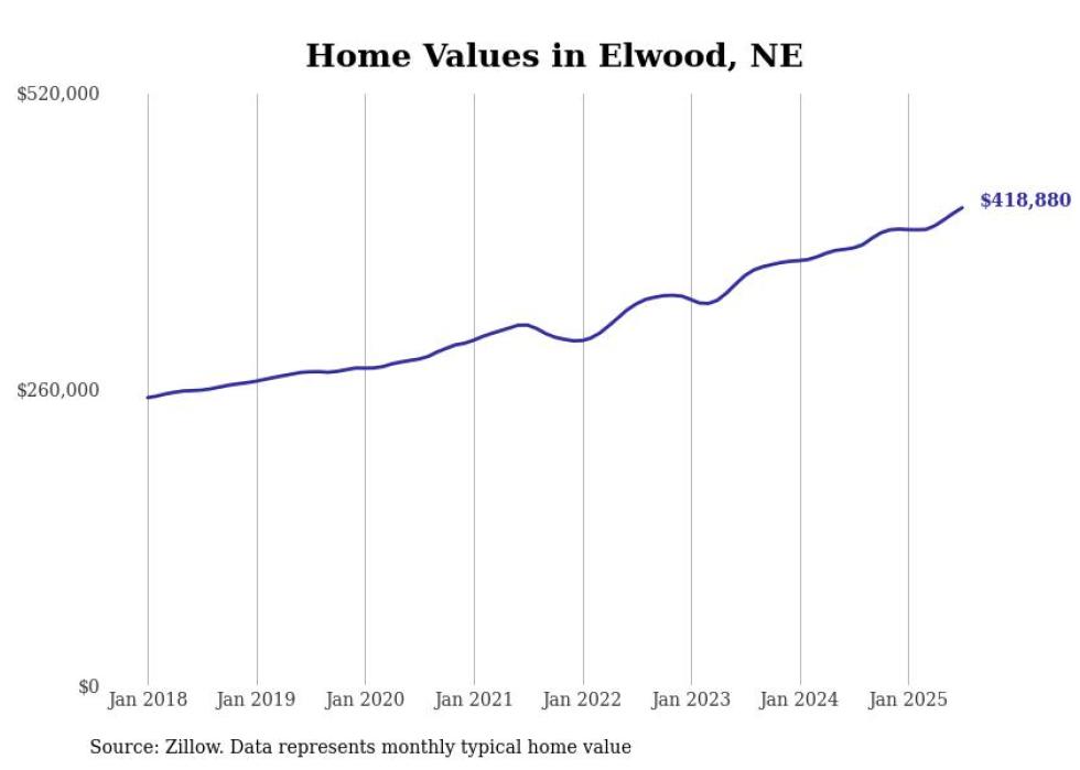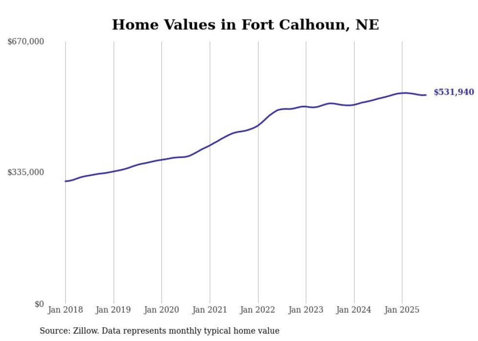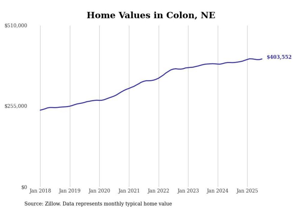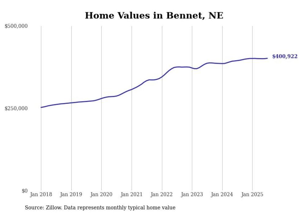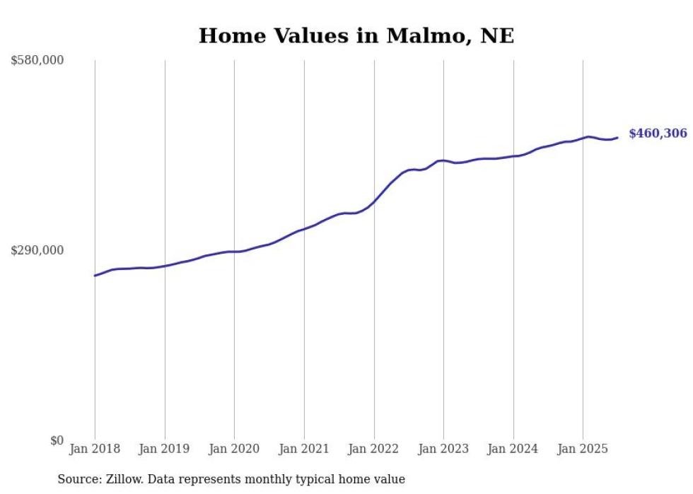 Stacker compiled a list of cities with the most expensive homes in Nebraska using data from Zillow. Cities are ranked by the Zillow Home Values Index for all homes as of July 2025. The charts in this story were created automatically using Matplotlib.
