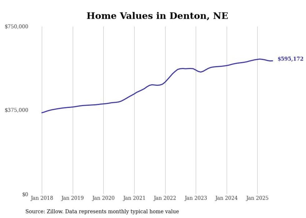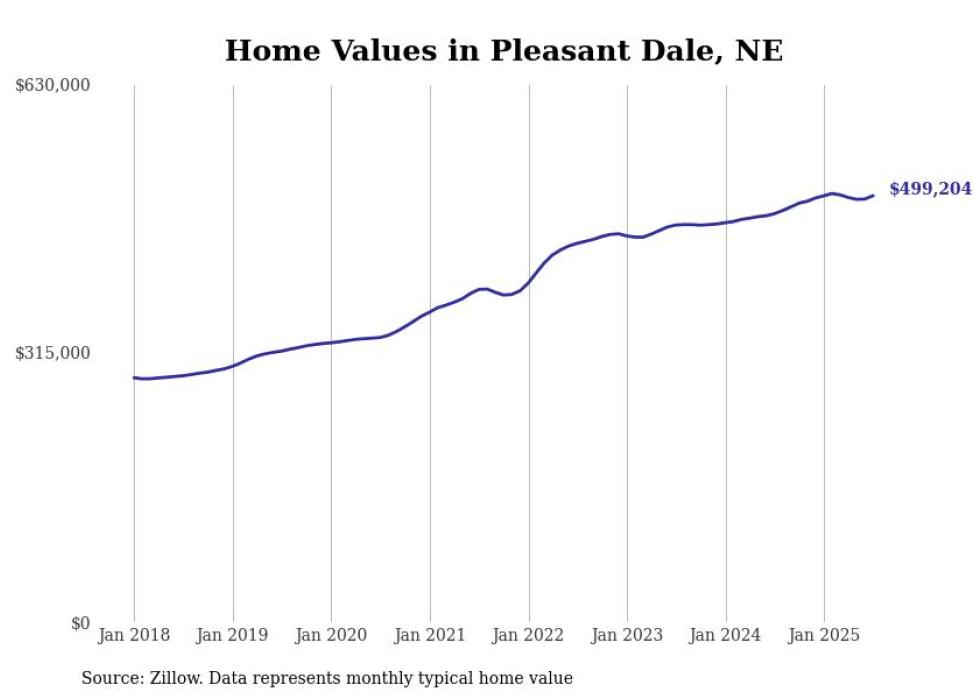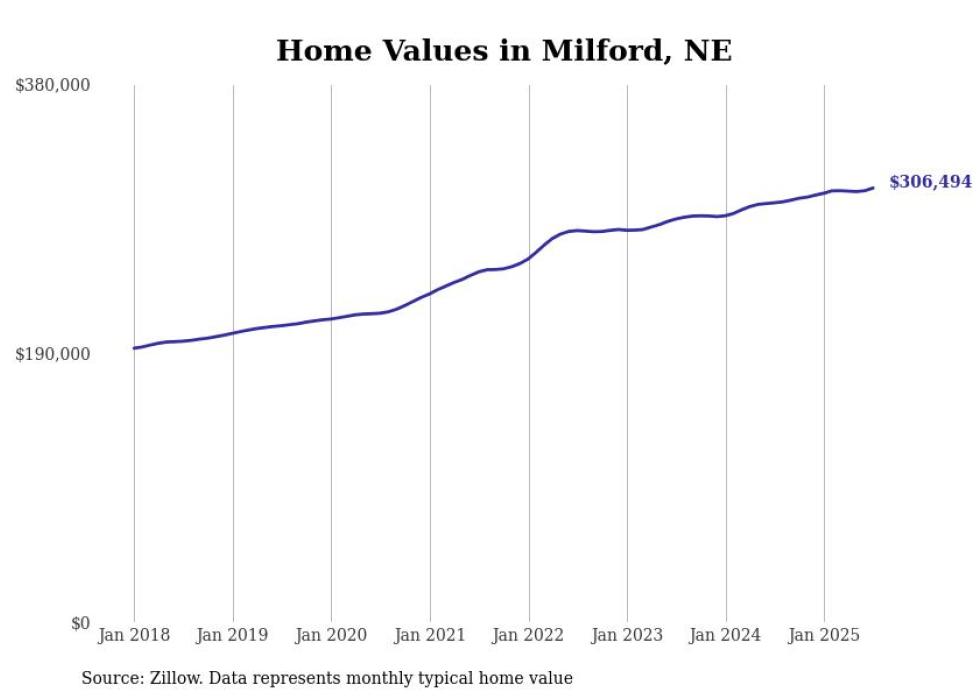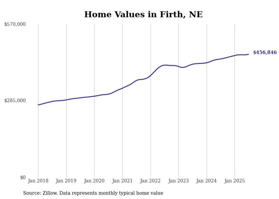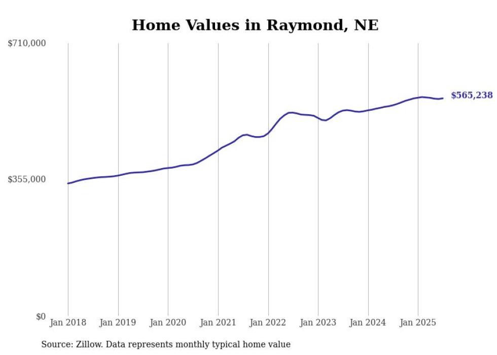 Stacker compiled a list of cities with the most expensive homes in the Lincoln metro area using data from Zillow. Charts show the monthly typical home value since January 2018. All 25 cities and towns with data available were included in the list.