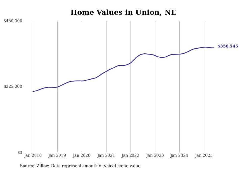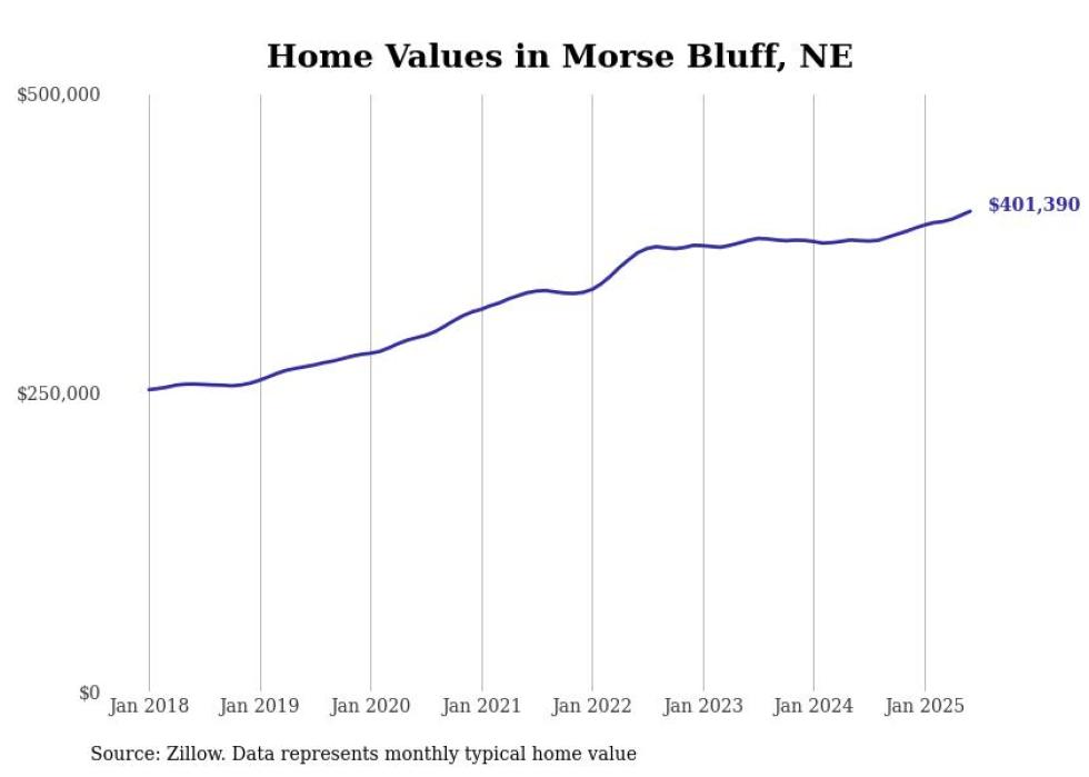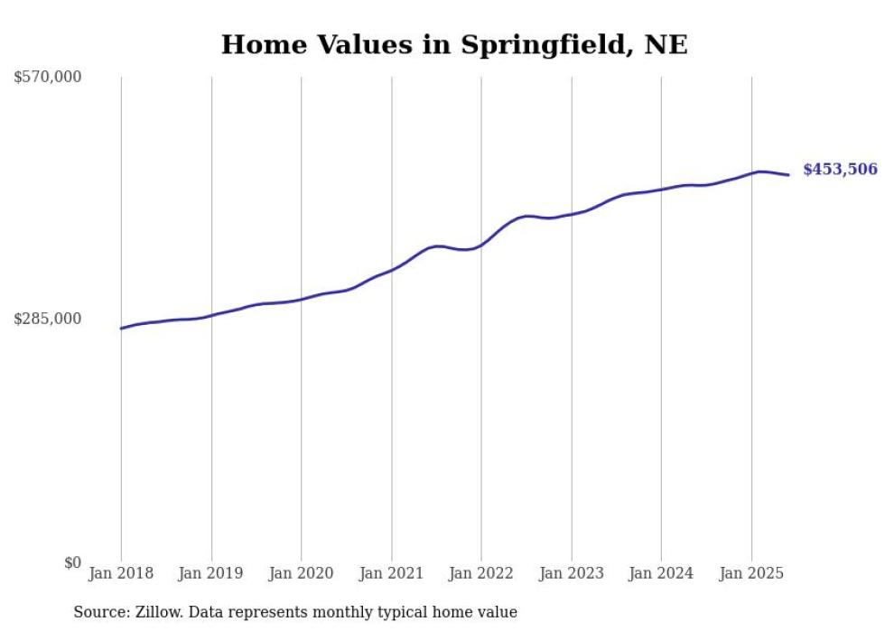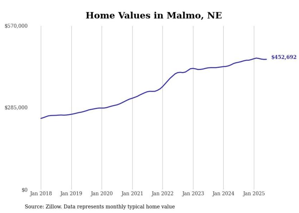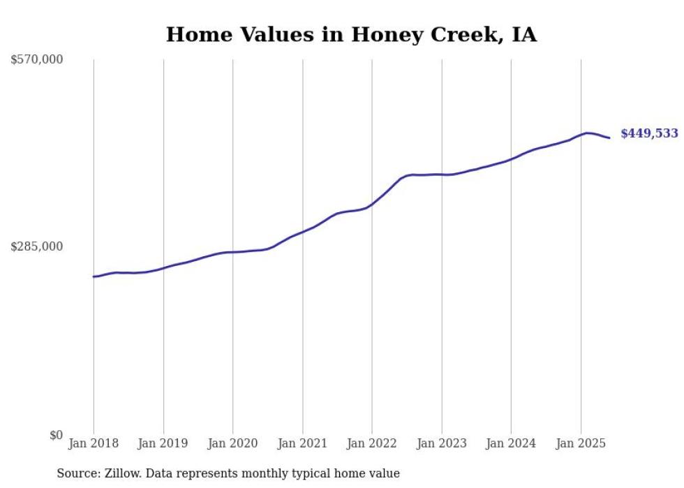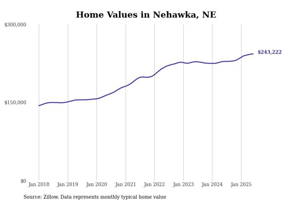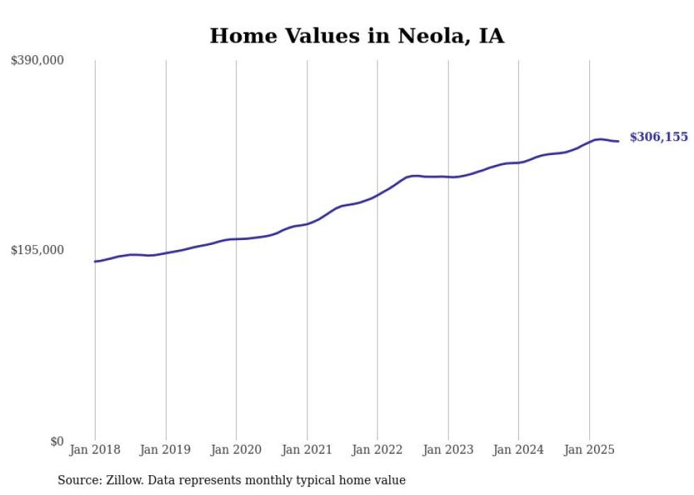 Stacker compiled a list of cities with the most expensive homes in the Omaha-Council Bluffs, NE-IA metro area using data from Zillow. Charts show the monthly typical home value since January 2018.