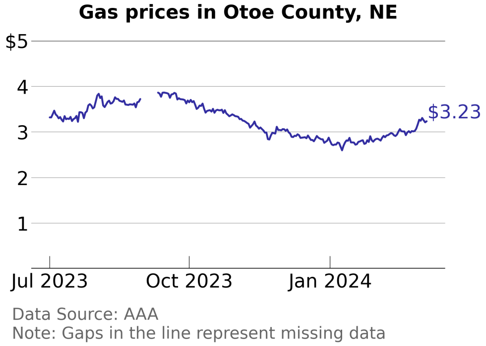 How gas prices have changed in Otoe County, Nebraska in the last week