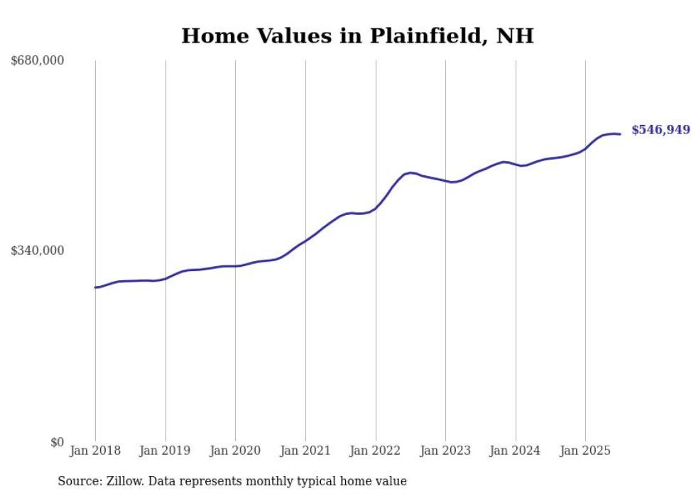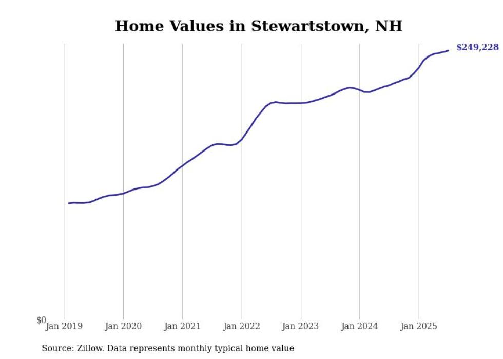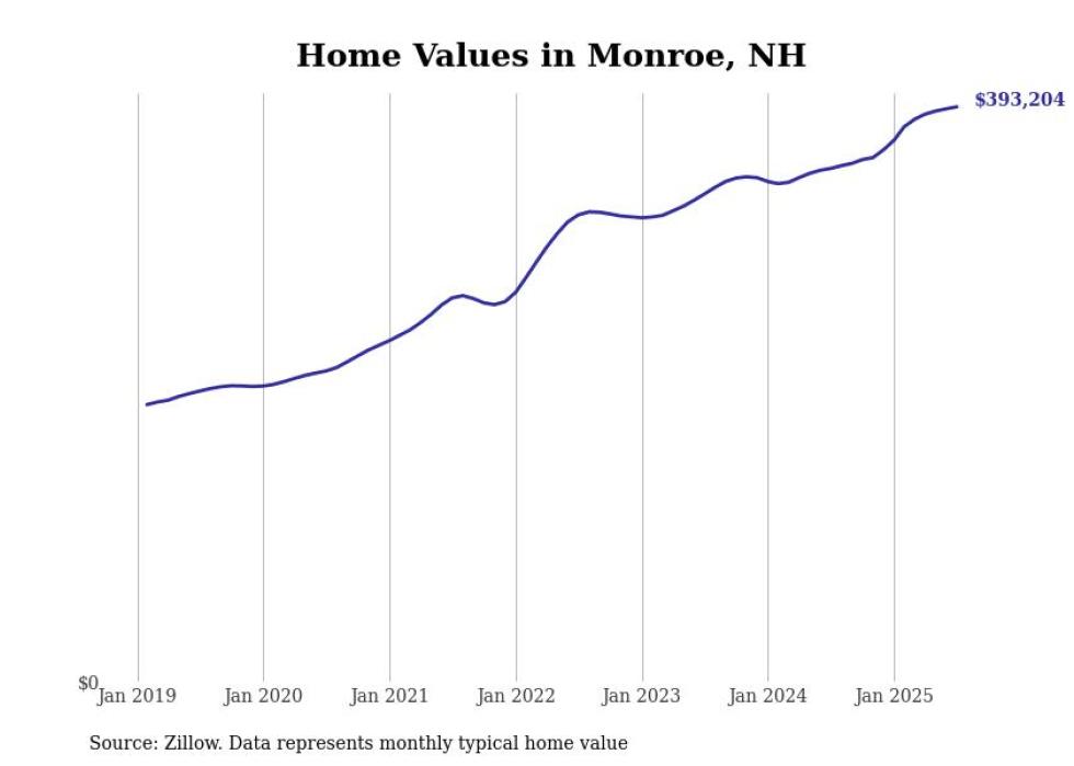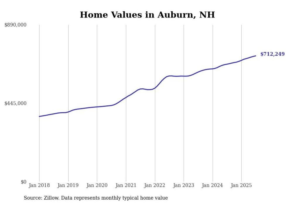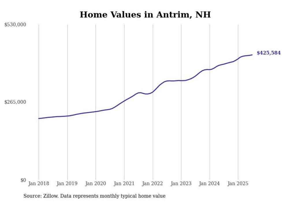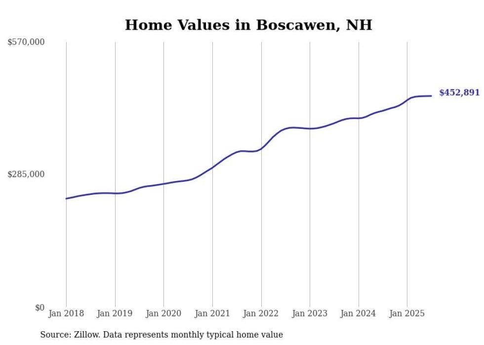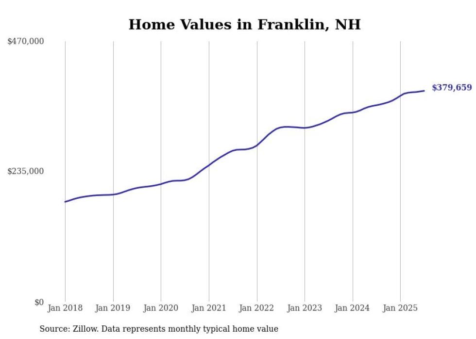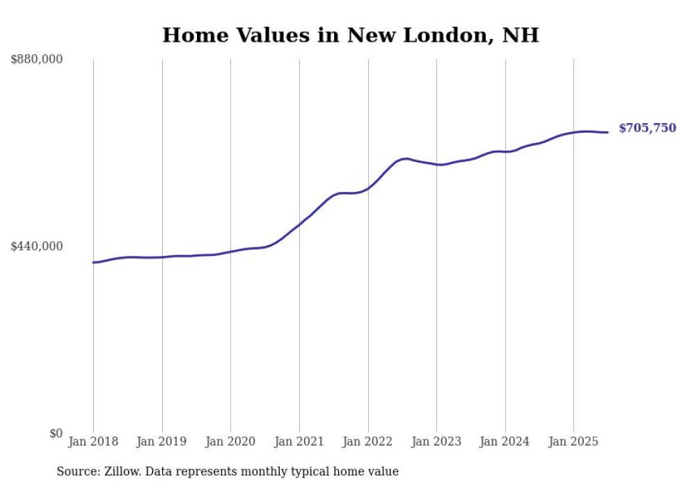 Stacker compiled a list of cities with the fastest-growing home prices in New Hampshire using data from Zillow. Cities are ranked by the dollar change in the Zillow Home Values Index for all homes from the 12 months ending July 2025. The charts in this story were created automatically using Matplotlib. Data was available for 50 cities and towns in New Hampshire.