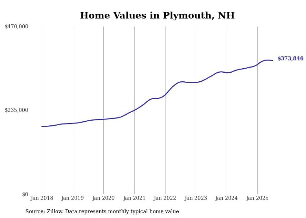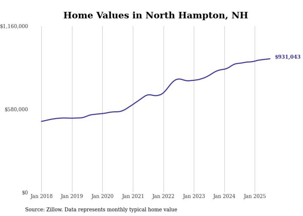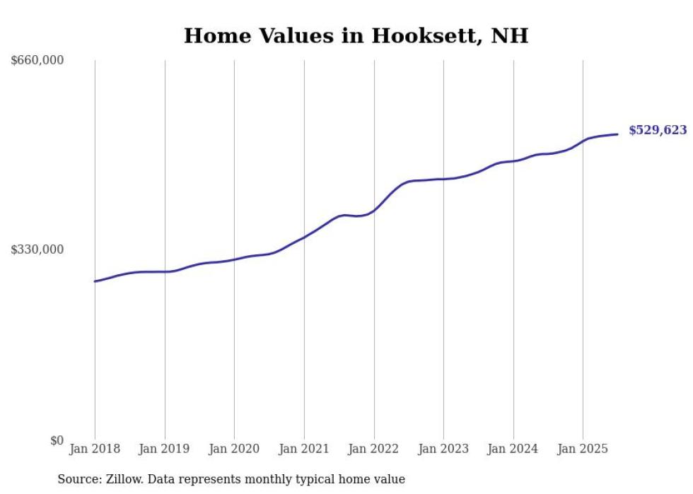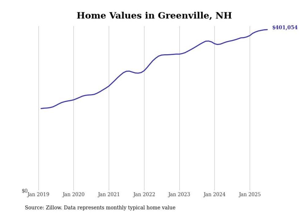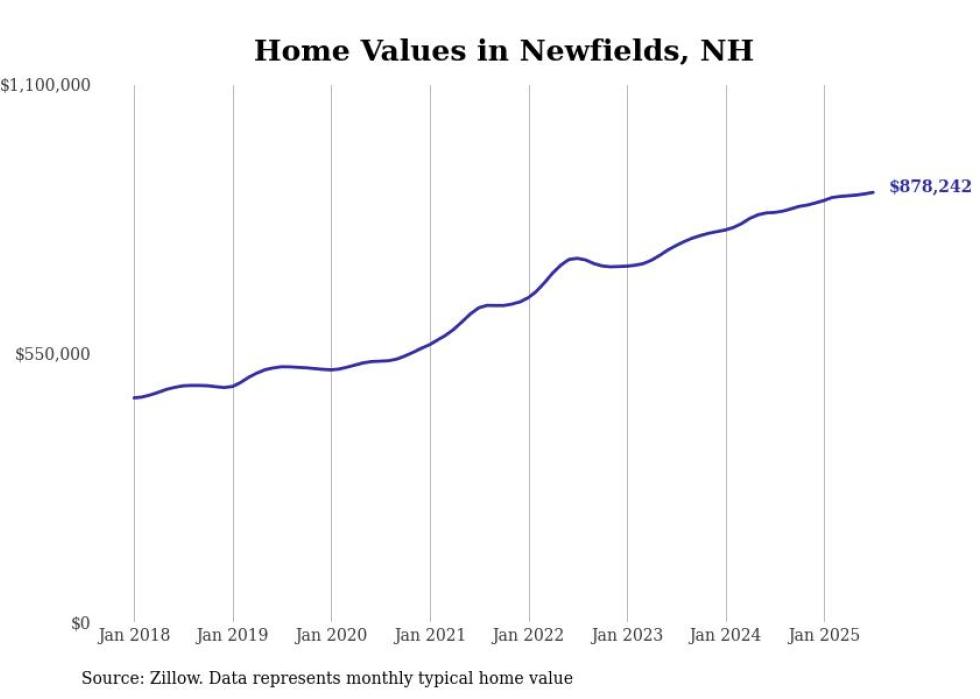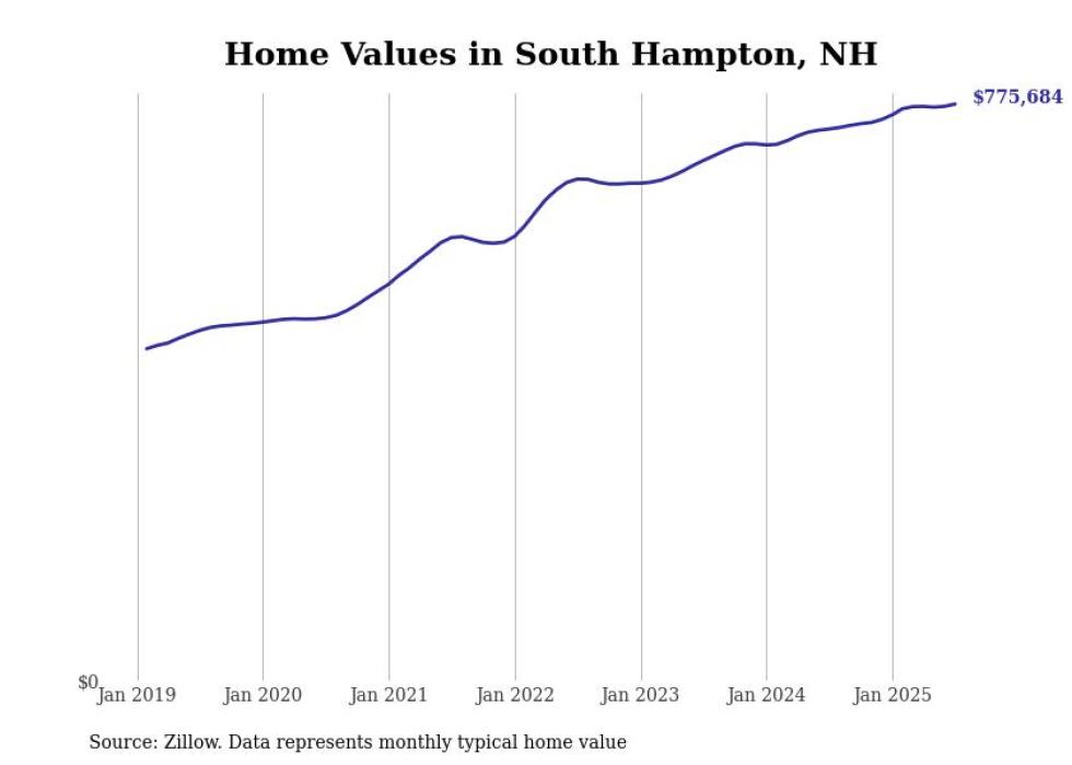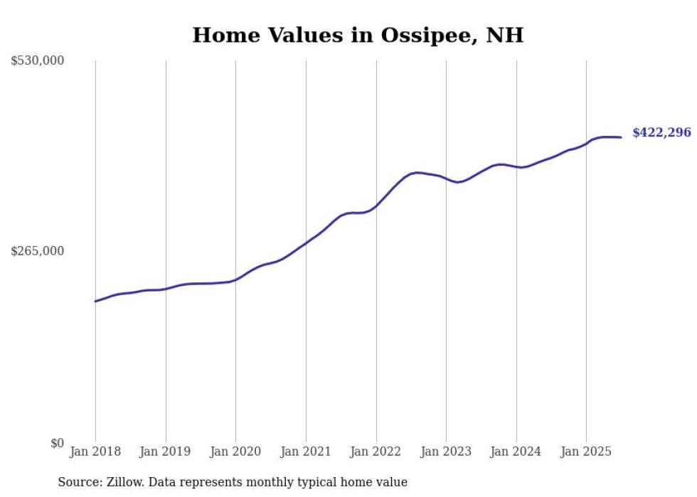 Stacker compiled a list of cities with the fastest-growing home prices in New Hampshire using data from Zillow. Cities are ranked by the dollar change in the Zillow Home Values Index for all homes from the 12 months ending July 2025. The charts in this story were created automatically using Matplotlib. Data was available for 50 cities and towns in New Hampshire.