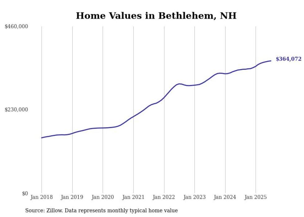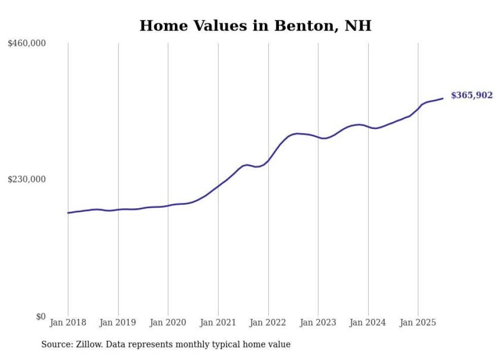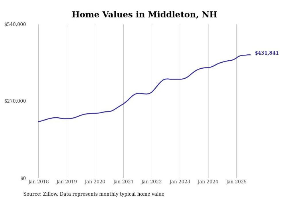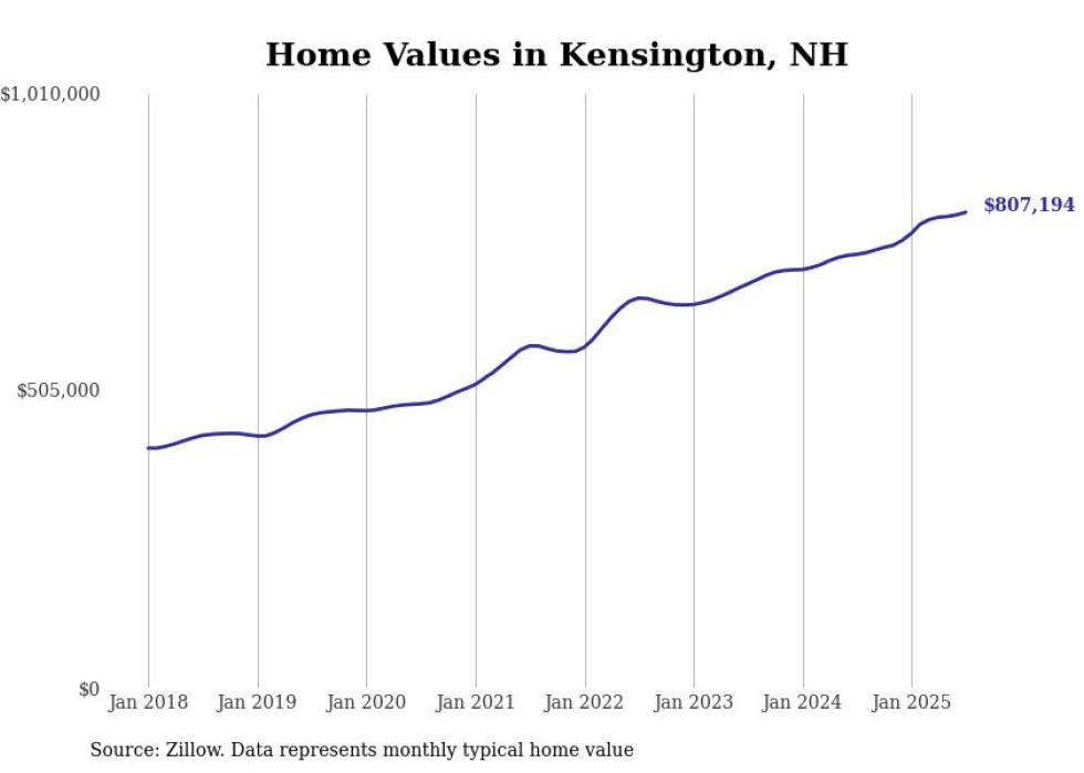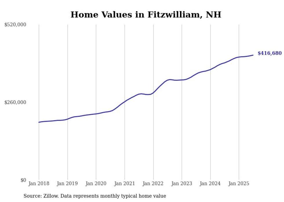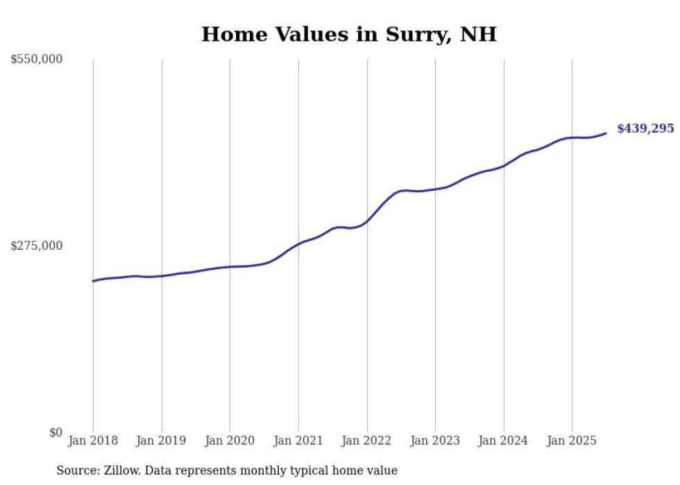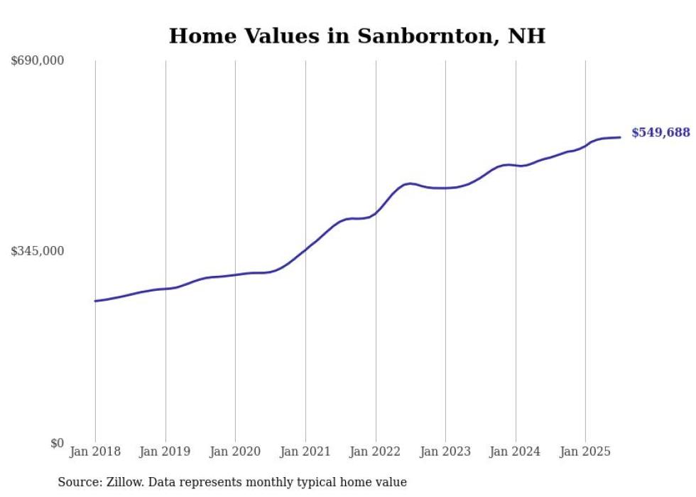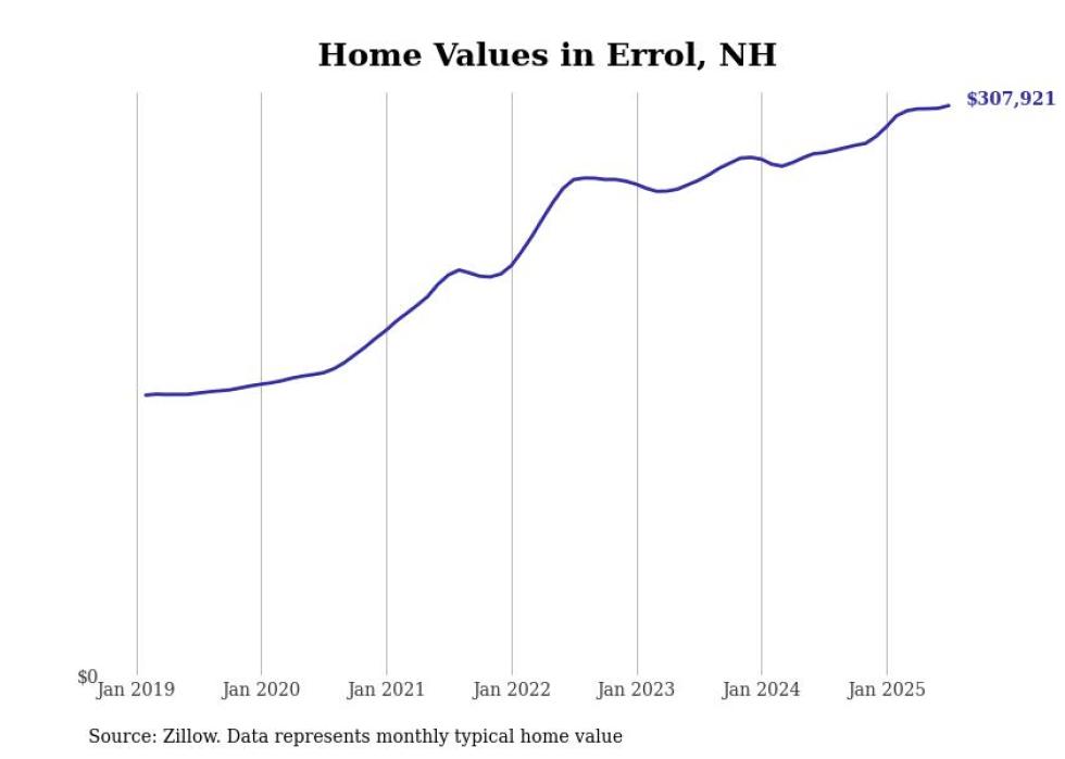 Stacker compiled a list of cities with the fastest-growing home prices in New Hampshire using data from Zillow. Cities are ranked by the dollar change in the Zillow Home Values Index for all homes from the 12 months ending July 2025. The charts in this story were created automatically using Matplotlib. Data was available for 50 cities and towns in New Hampshire.