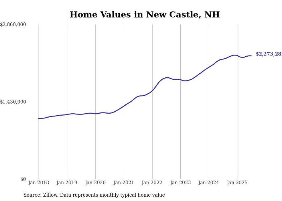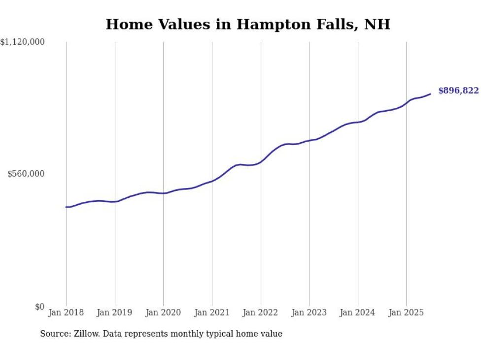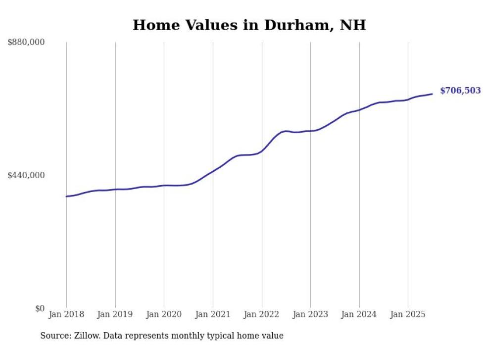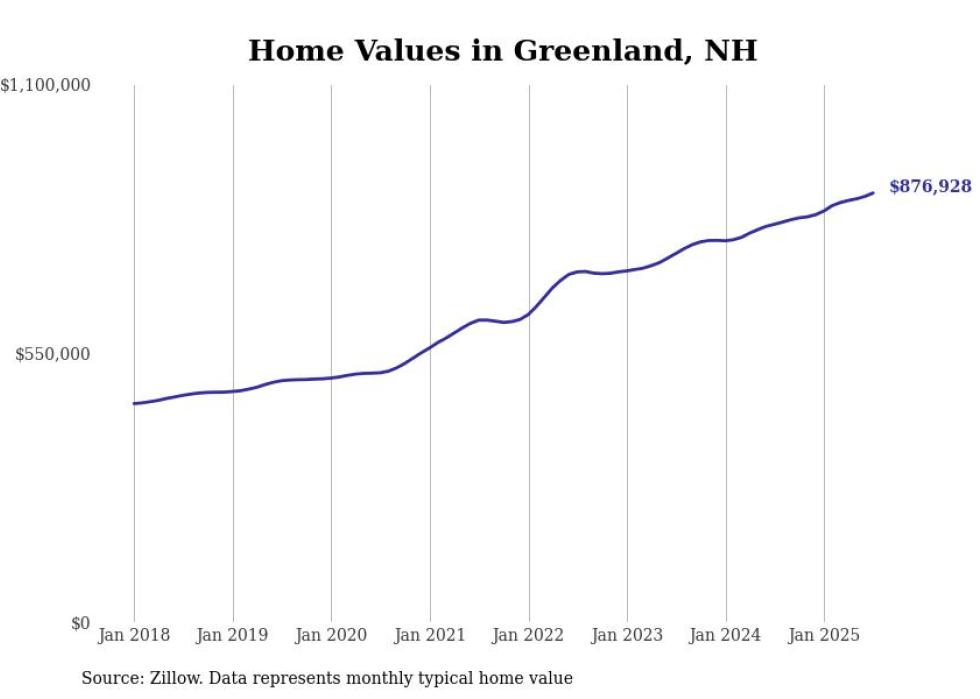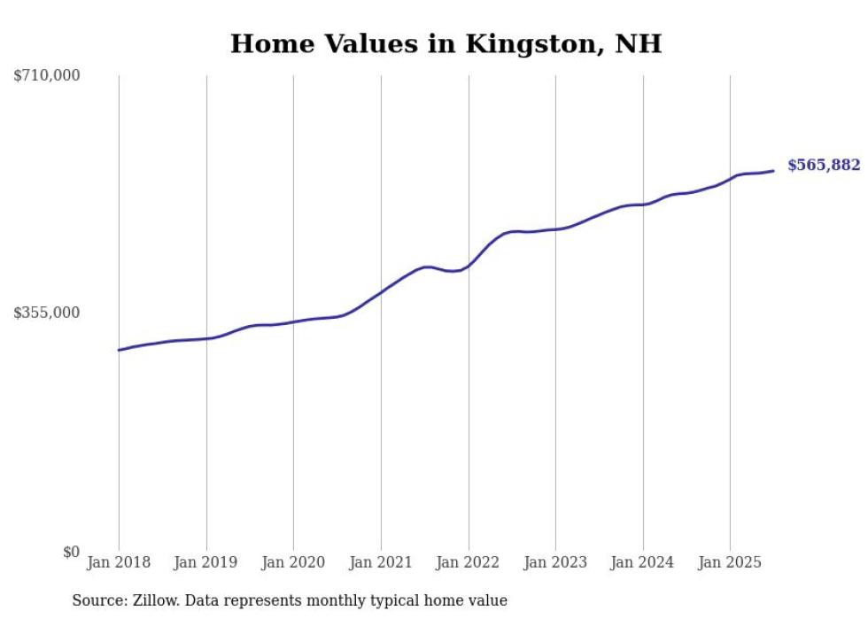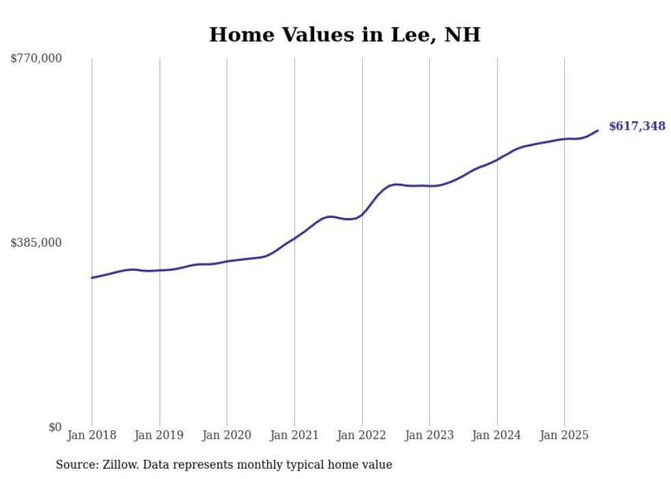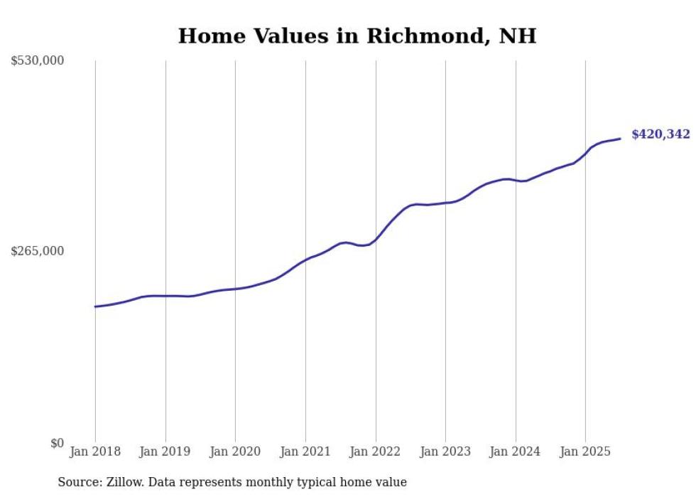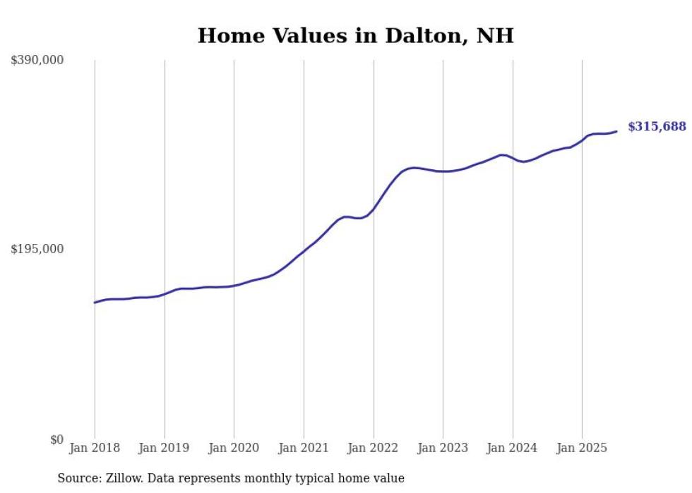 Stacker compiled a list of cities with the fastest-growing home prices in New Hampshire using data from Zillow. Cities are ranked by the dollar change in the Zillow Home Values Index for all homes from the 12 months ending July 2025. The charts in this story were created automatically using Matplotlib. Data was available for 50 cities and towns in New Hampshire.