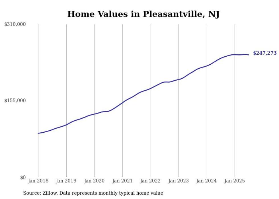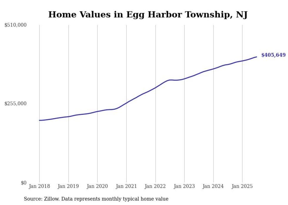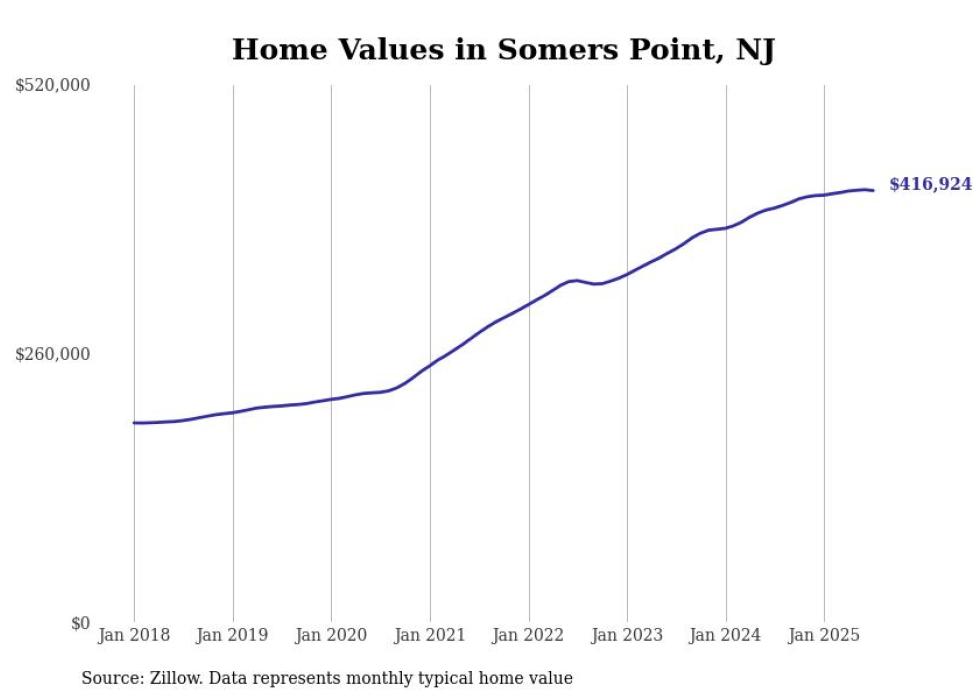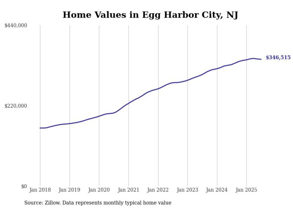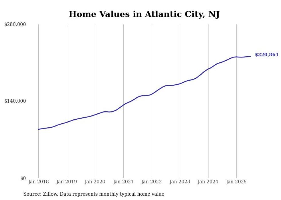 Stacker compiled a list of cities with the most expensive homes in the Atlantic City metro area using data from Zillow. Charts show the monthly typical home value since January 2018. All 18 cities and towns with data available were included in the list.