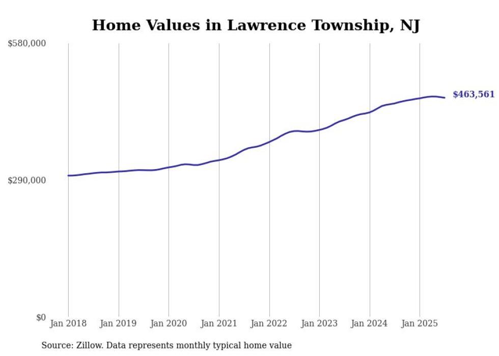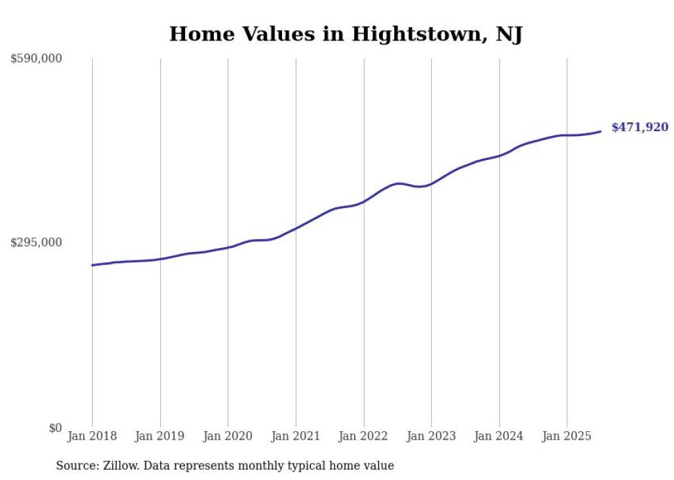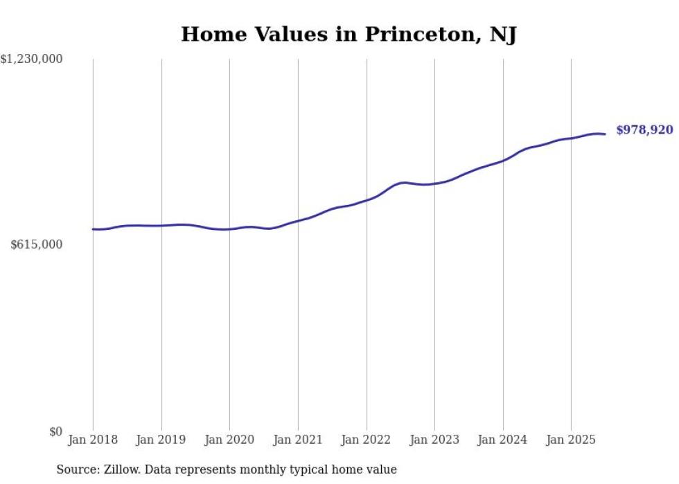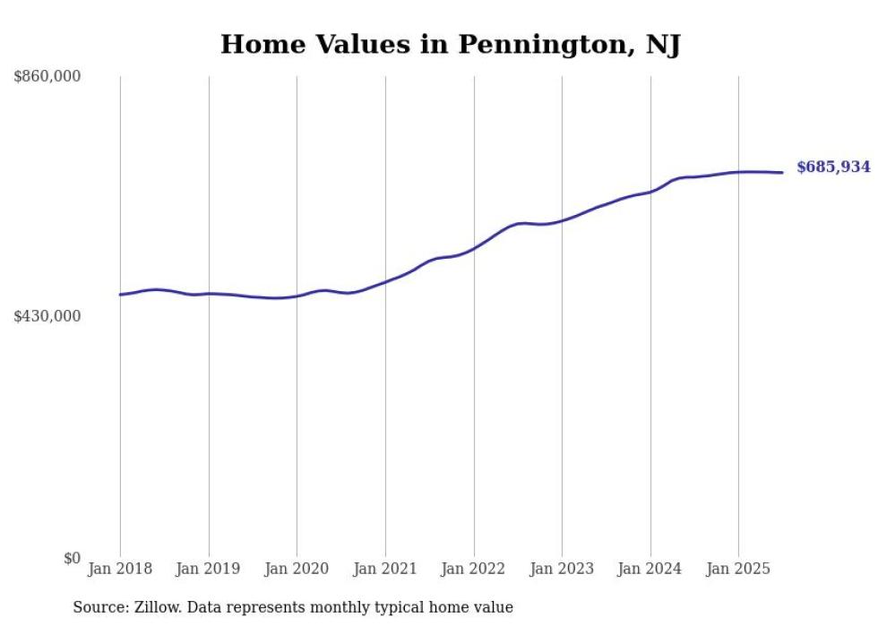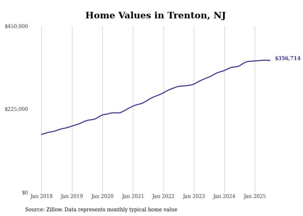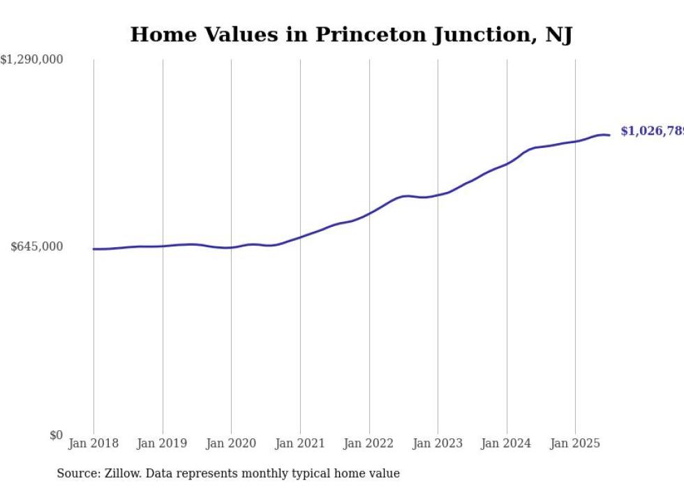 Stacker compiled a list of cities with the most expensive homes in the Trenton metro area using data from Zillow. Charts show the monthly typical home value since January 2018. All 7 cities and towns with data available were included in the list.