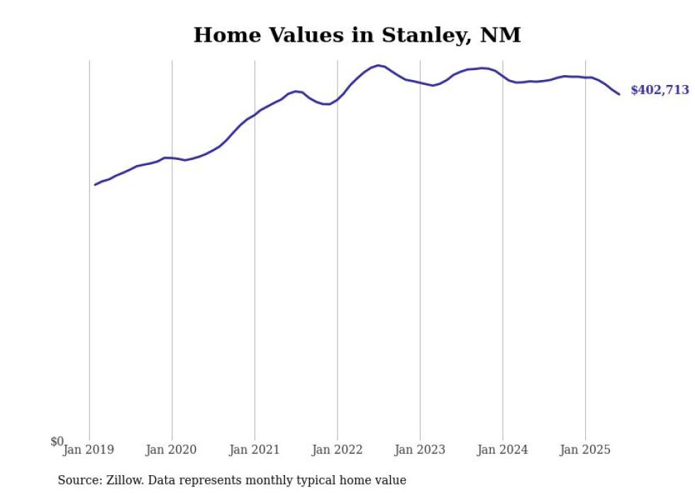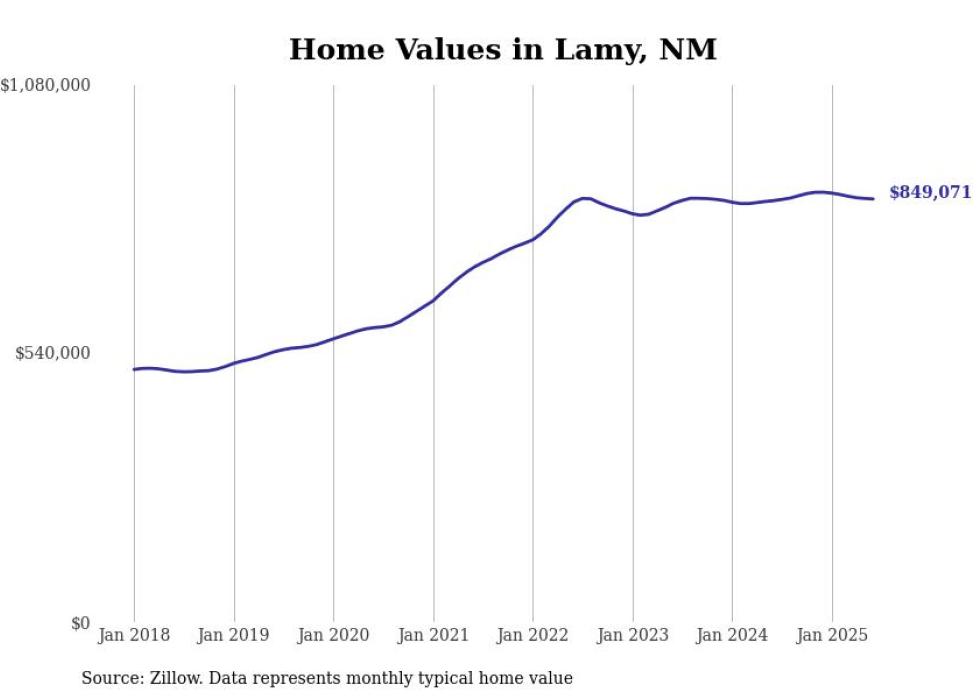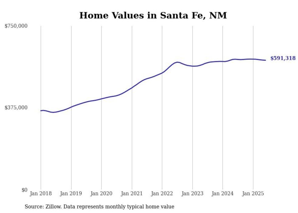 Stacker compiled a list of cities with the most expensive homes in the Santa Fe, NM metro area using data from Zillow. Charts show the monthly typical home value since January 2018.