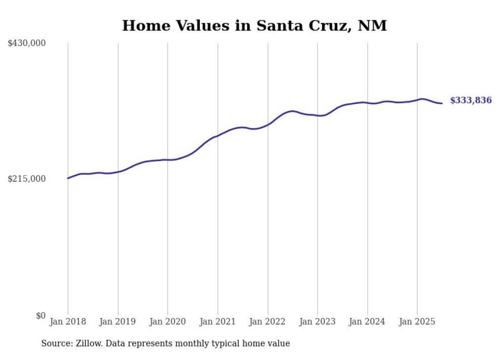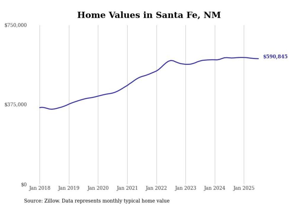 Stacker compiled a list of cities with the most expensive homes in the Santa Fe metro area using data from Zillow. Charts show the monthly typical home value since January 2018. All 7 cities and towns with data available were included in the list.