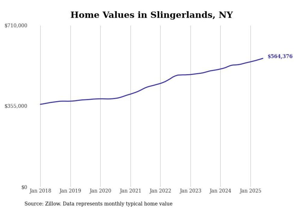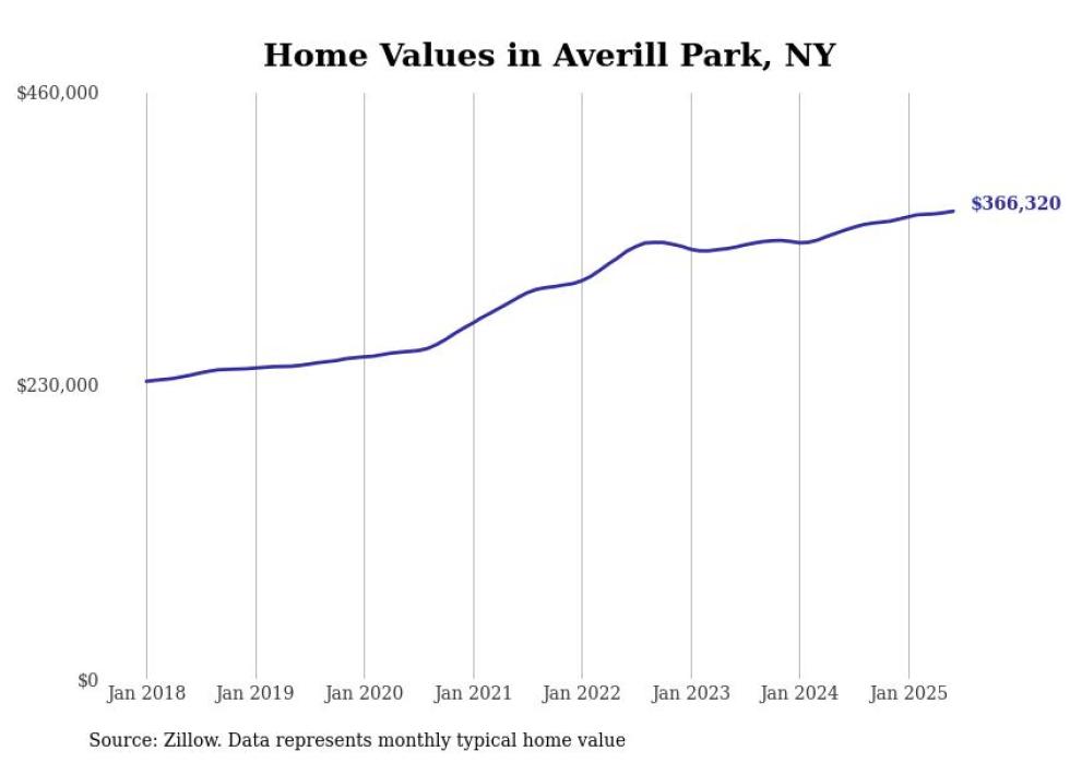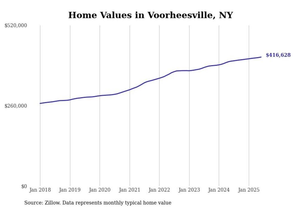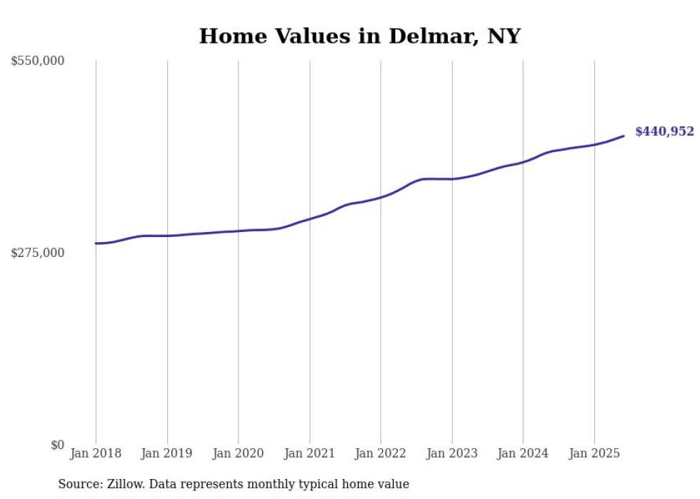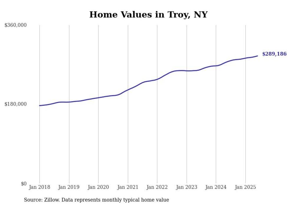 Stacker compiled a list of cities with the most expensive homes in the Albany-Schenectady-Troy, NY metro area using data from Zillow. Charts show the monthly typical home value since January 2018.