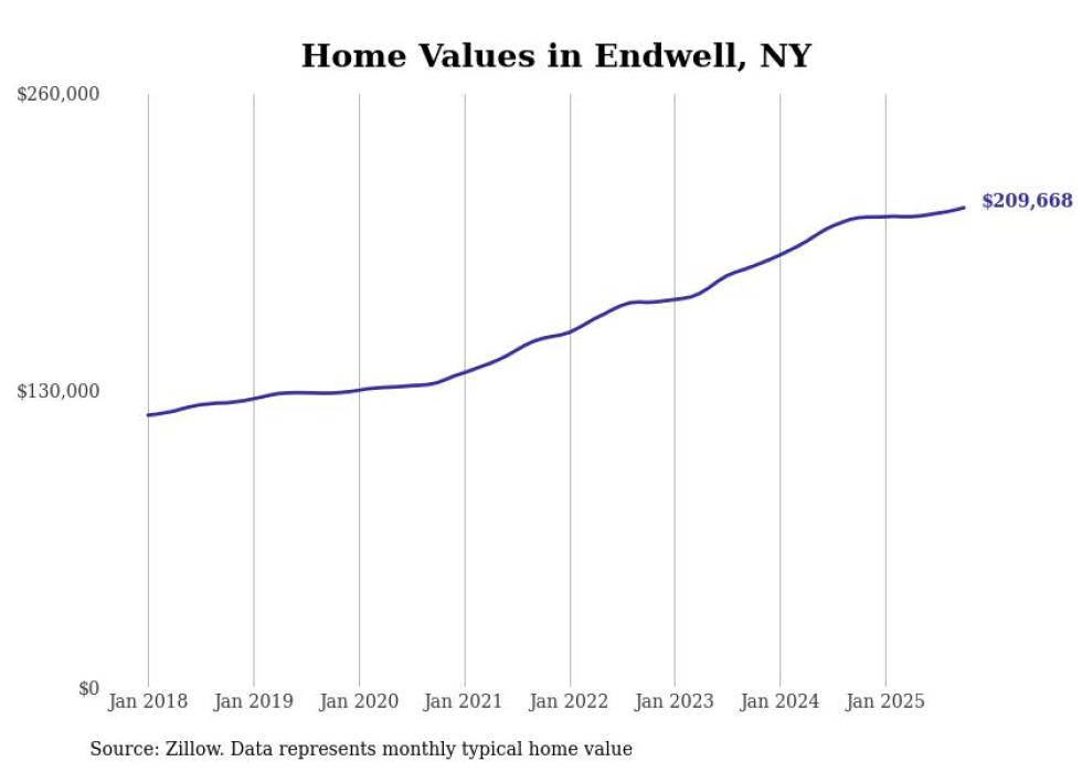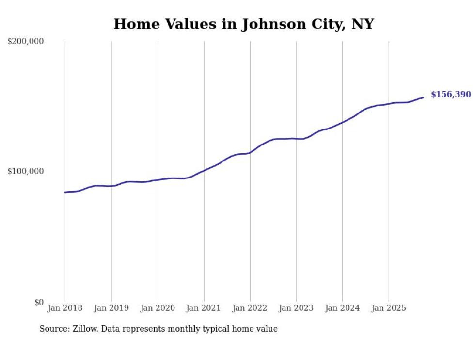 Stacker compiled a list of cities with the most expensive homes in the Binghamton metro area using data from Zillow. Charts show the monthly typical home value since January 2018. All 6 cities and towns with data available were included in the list.