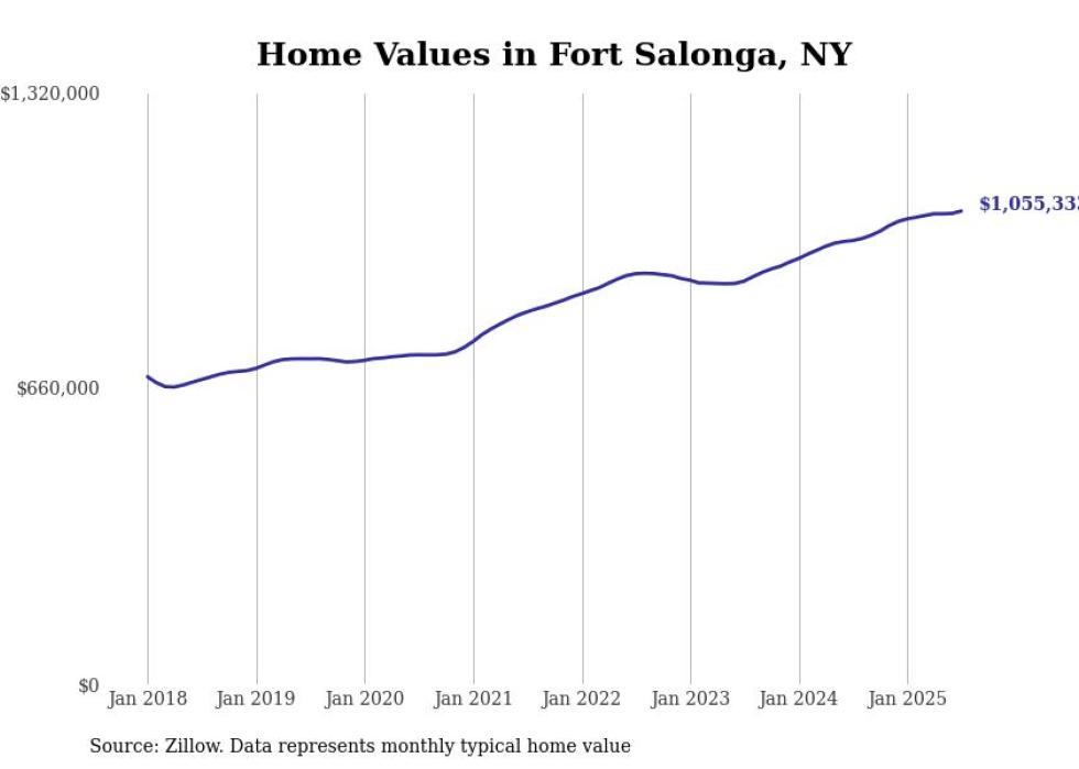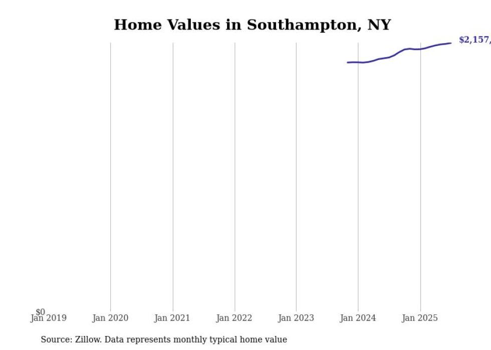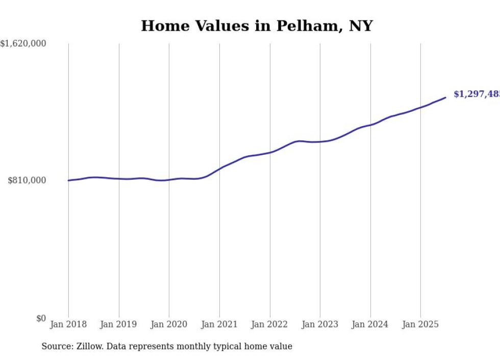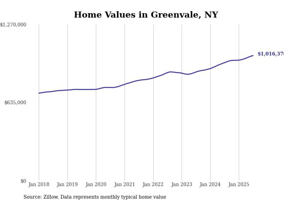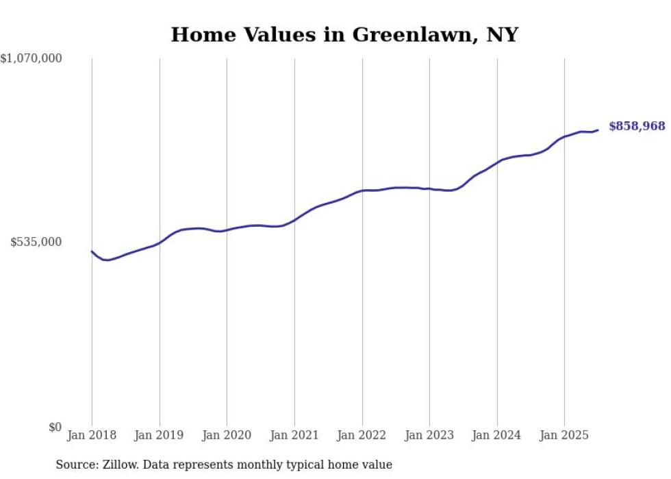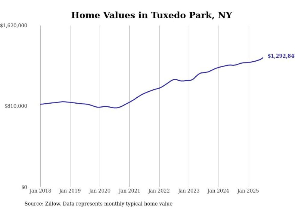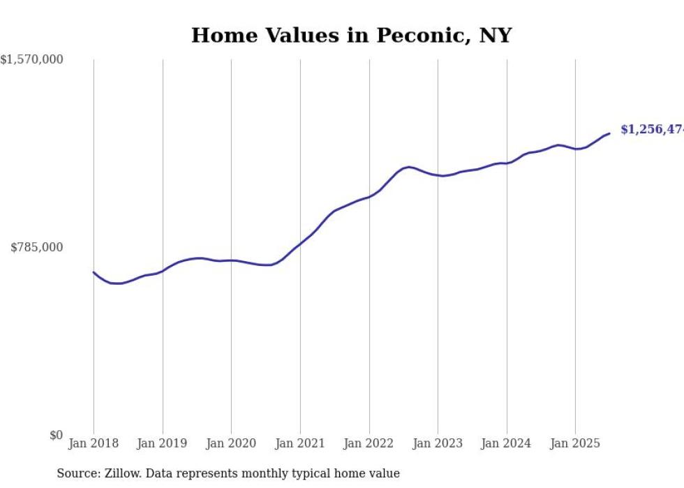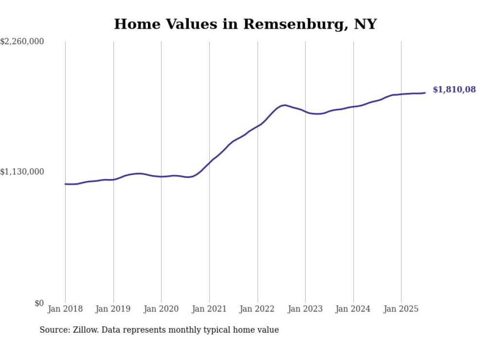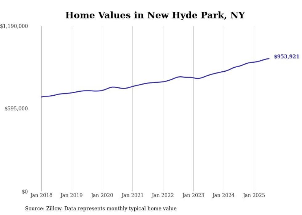 Stacker compiled a list of cities with the fastest-growing home prices in New York using data from Zillow. Cities are ranked by the dollar change in the Zillow Home Values Index for all homes from the 12 months ending July 2025. The charts in this story were created automatically using Matplotlib. Data was available for 50 cities and towns in New York.