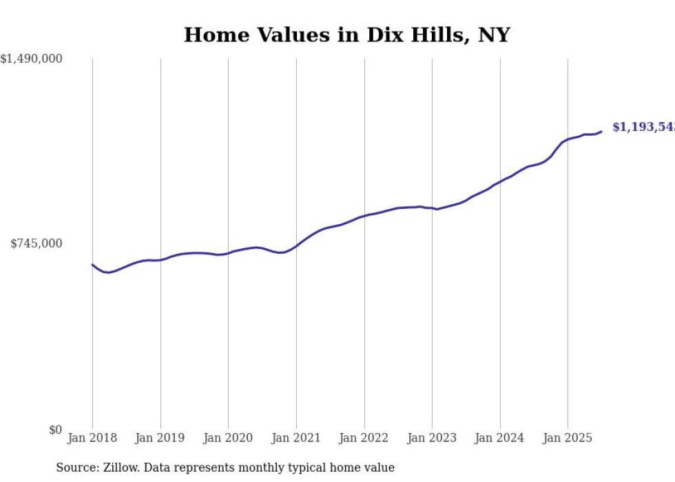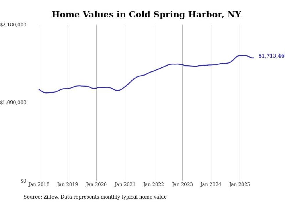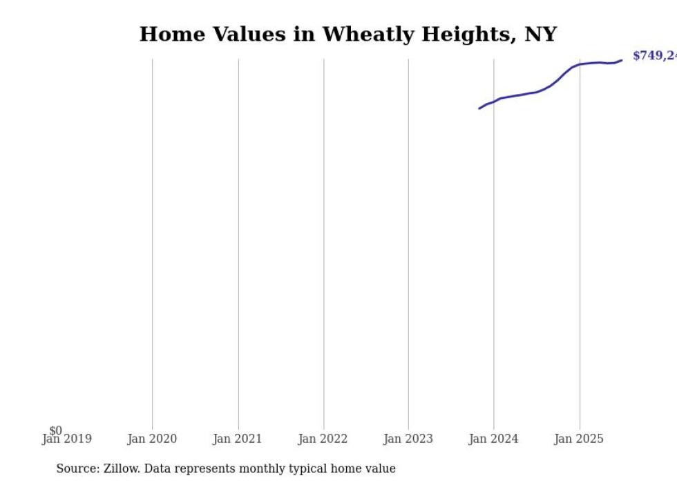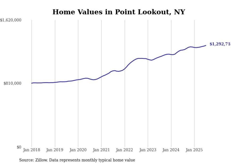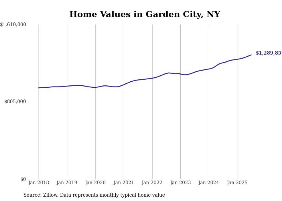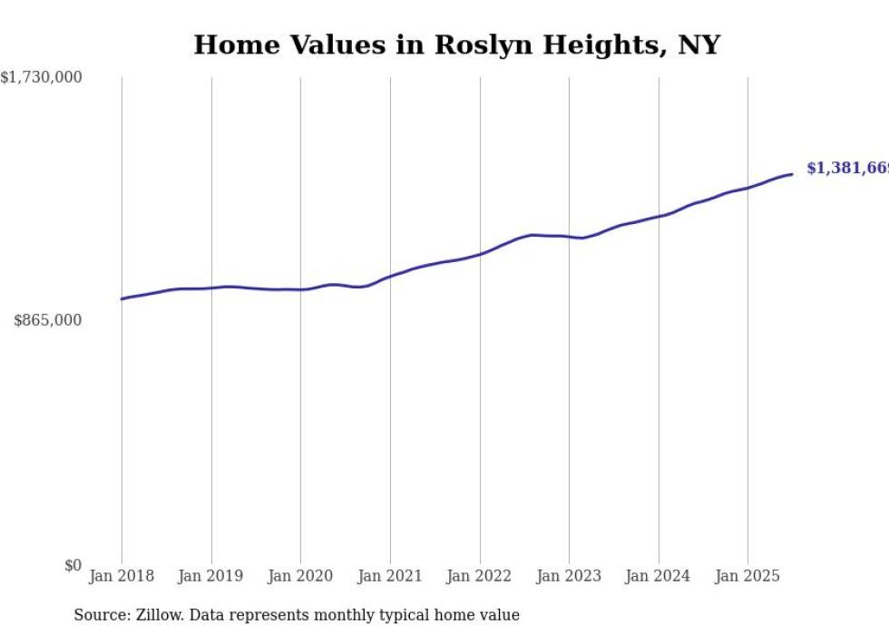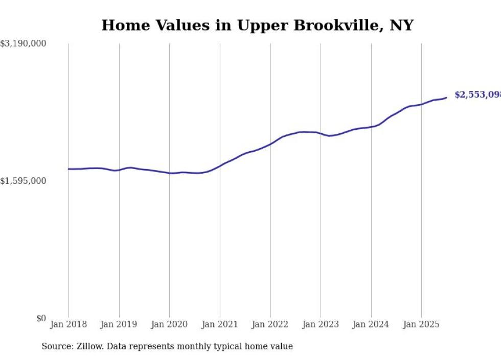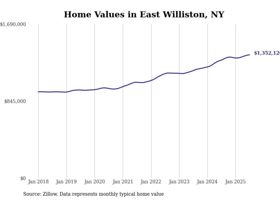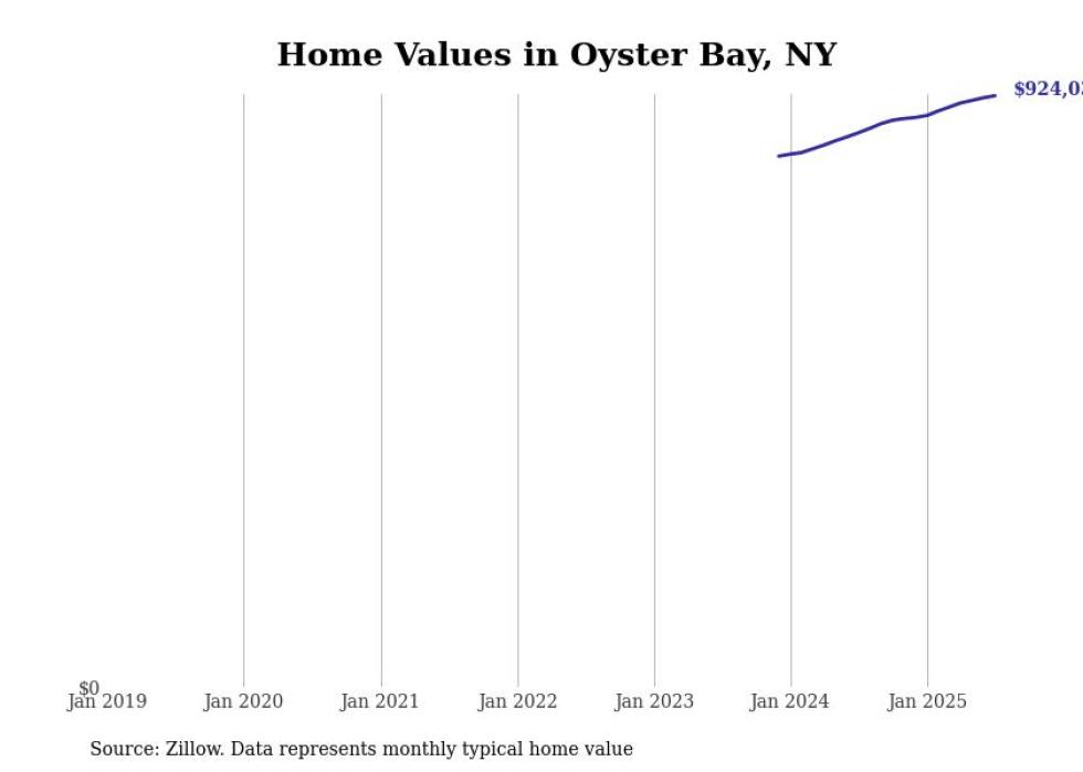 Stacker compiled a list of cities with the fastest-growing home prices in New York using data from Zillow. Cities are ranked by the dollar change in the Zillow Home Values Index for all homes from the 12 months ending July 2025. The charts in this story were created automatically using Matplotlib. Data was available for 50 cities and towns in New York.
