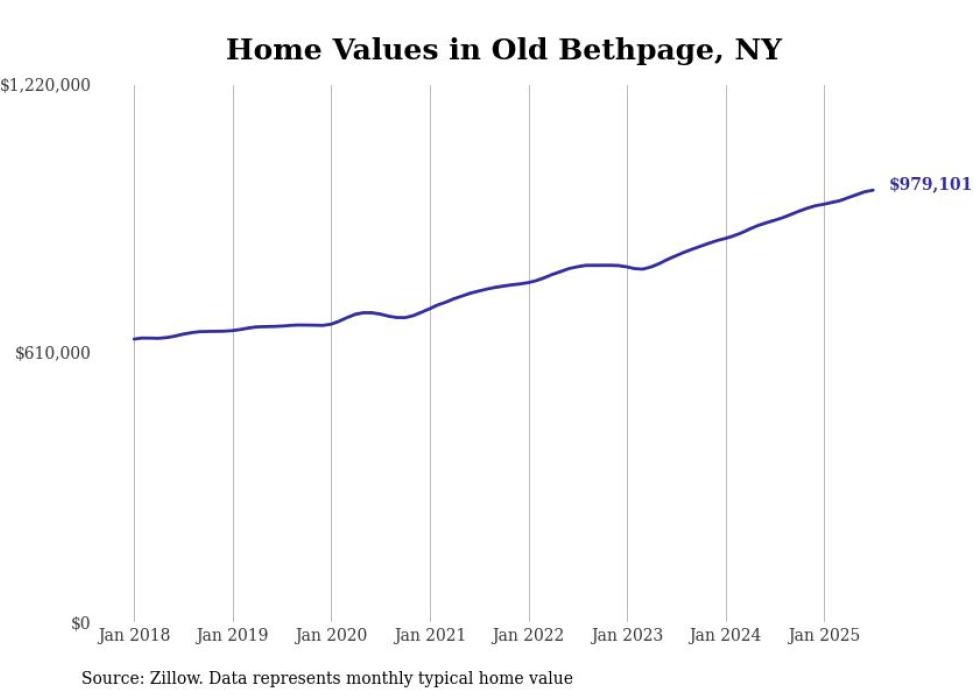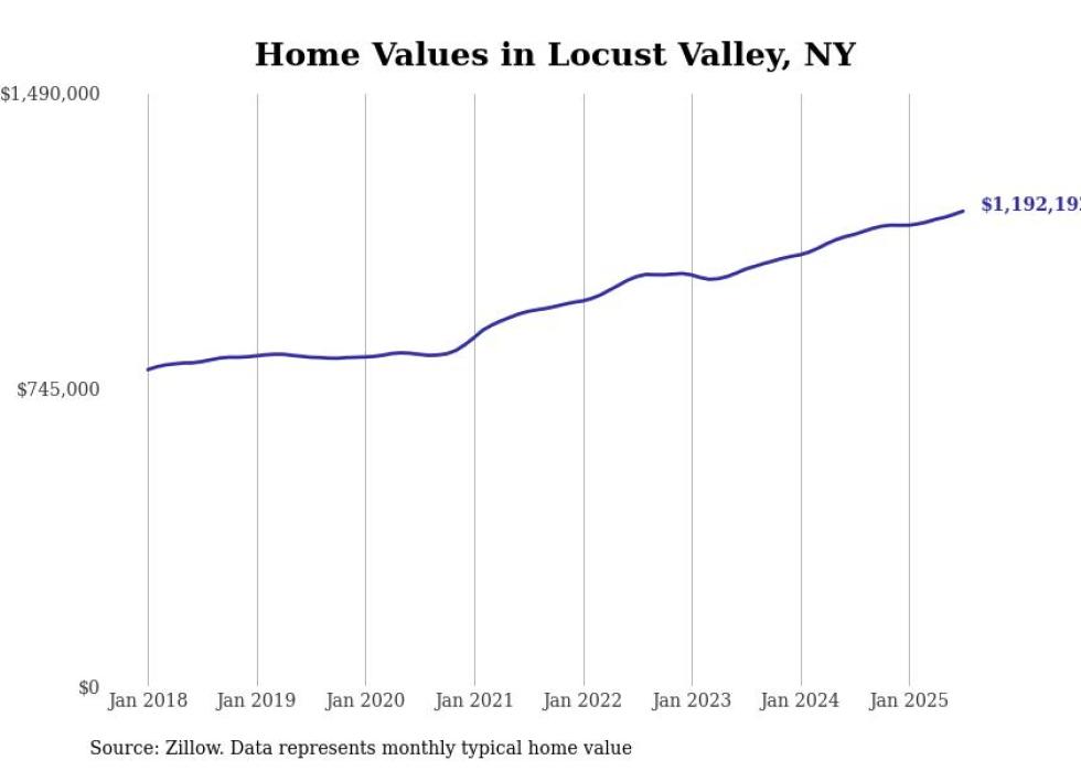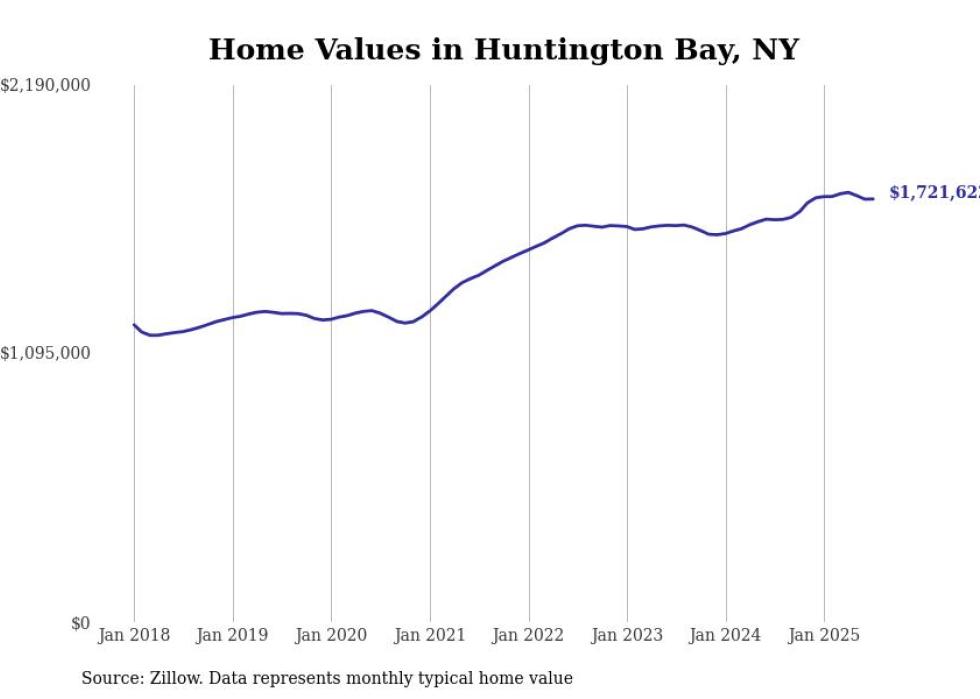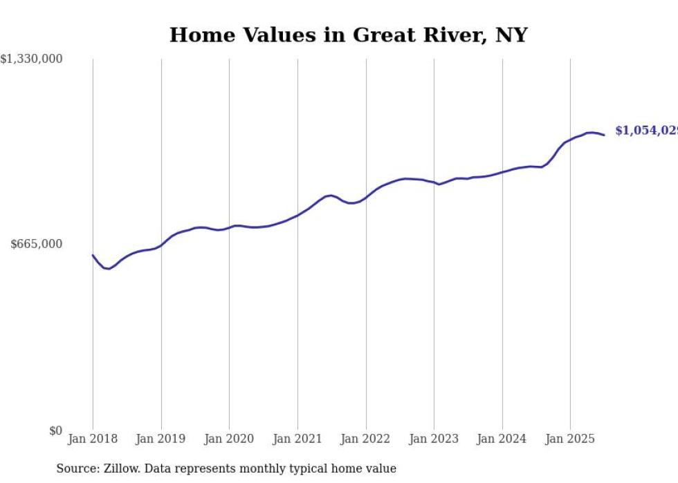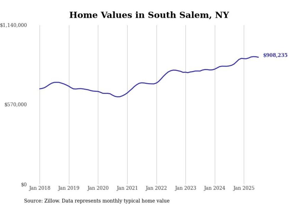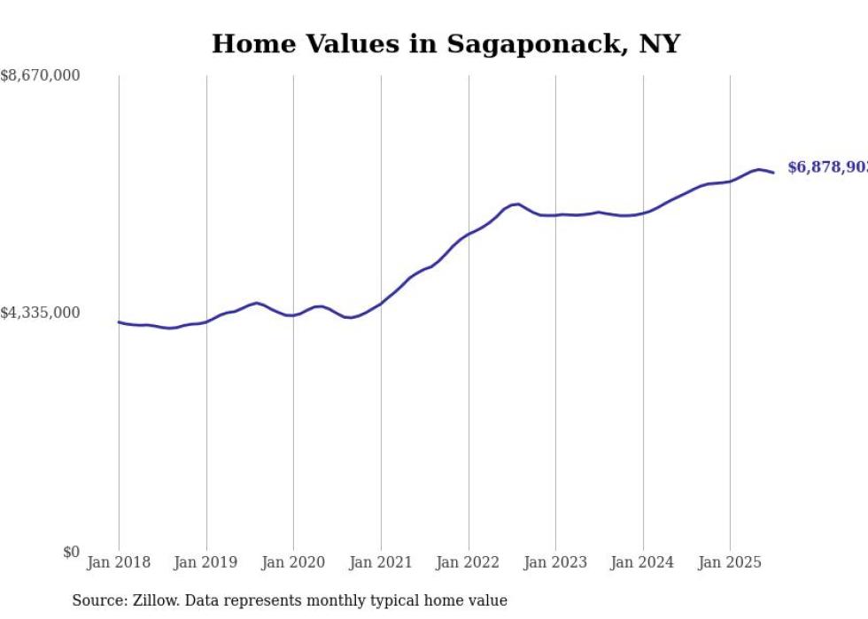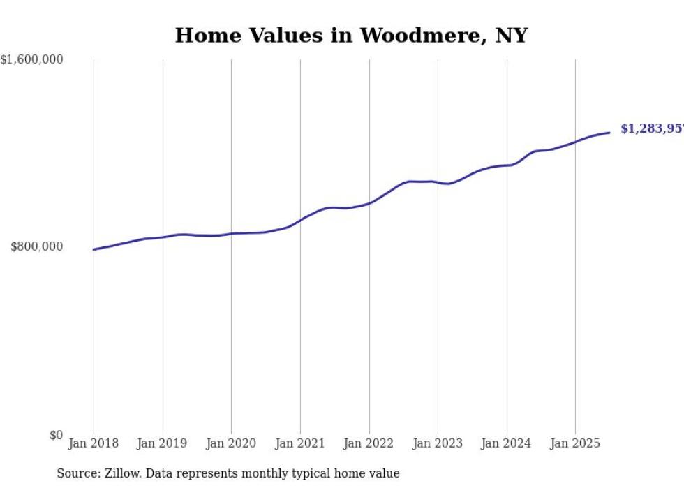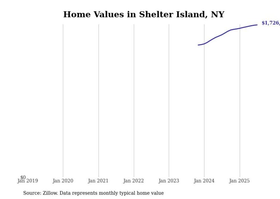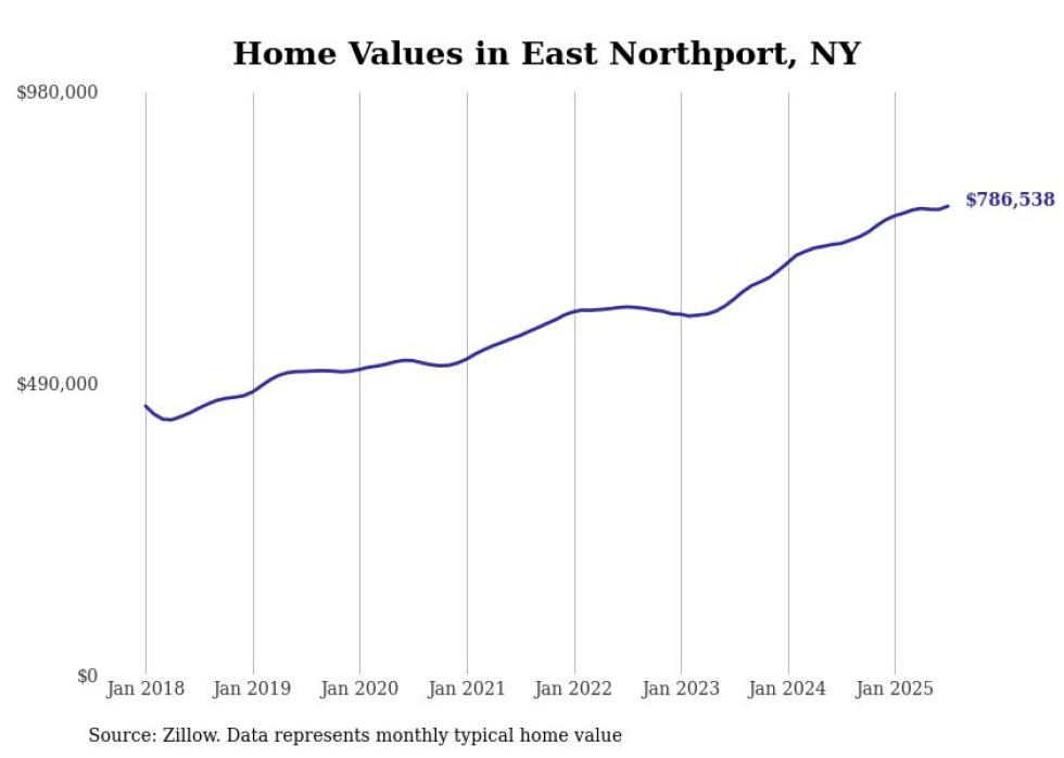 Stacker compiled a list of cities with the fastest-growing home prices in New York using data from Zillow. Cities are ranked by the dollar change in the Zillow Home Values Index for all homes from the 12 months ending July 2025. The charts in this story were created automatically using Matplotlib. Data was available for 50 cities and towns in New York.