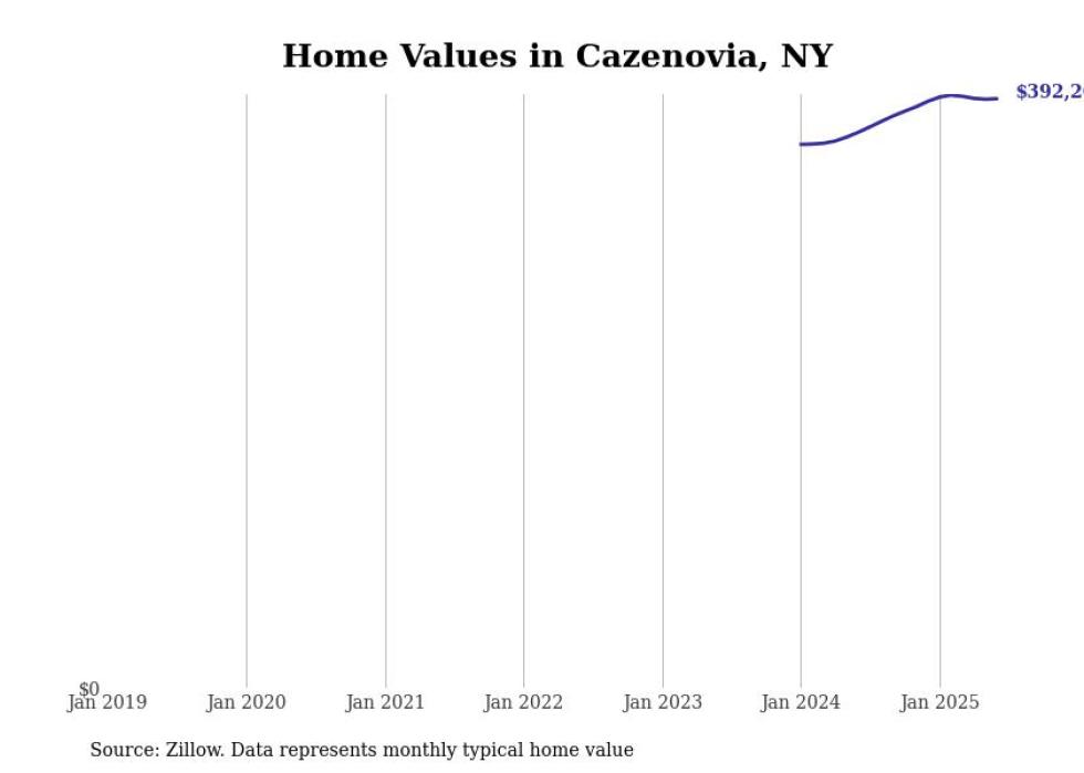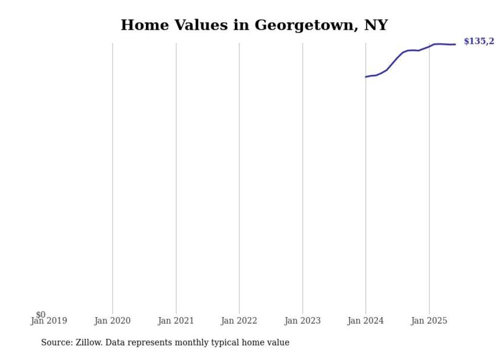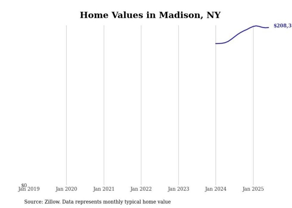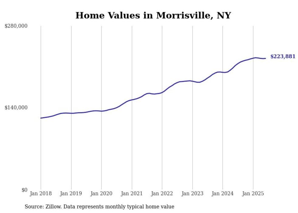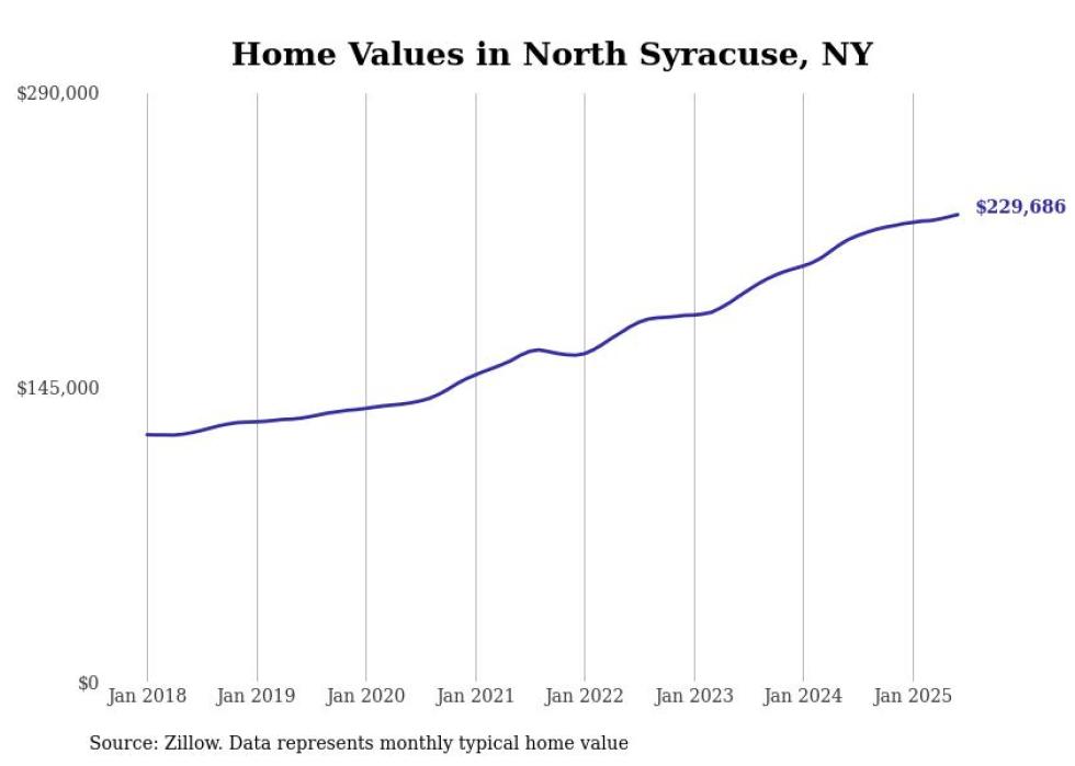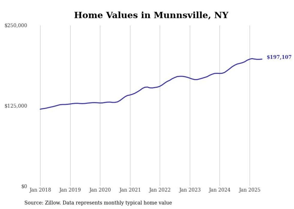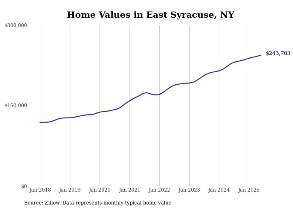 Stacker compiled a list of cities with the most expensive homes in the Syracuse, NY metro area using data from Zillow. Charts show the monthly typical home value since January 2018.