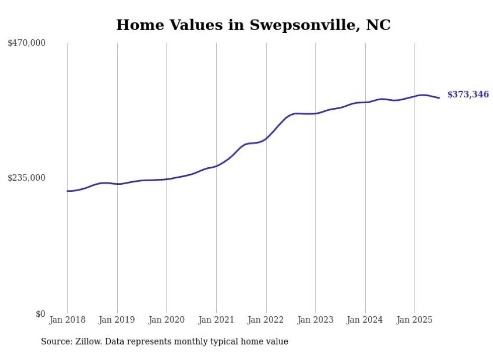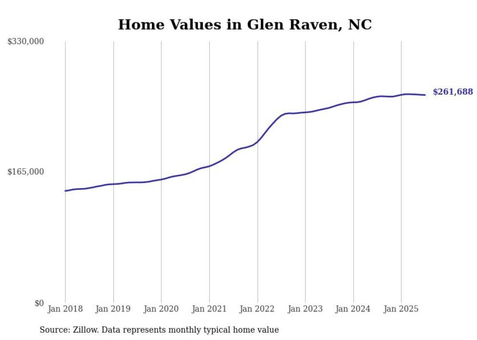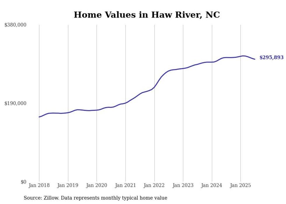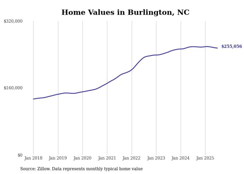 Stacker compiled a list of cities with the most expensive homes in the Burlington, North Carolina metro area using data from Zillow. Charts show the monthly typical home value since January 2018. All 8 cities and towns with data available were included in the list.