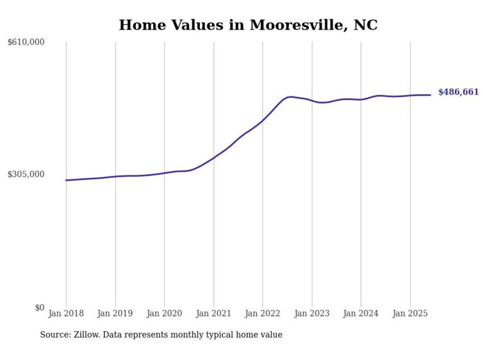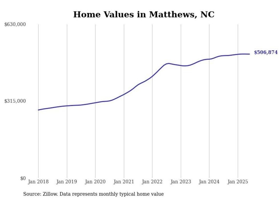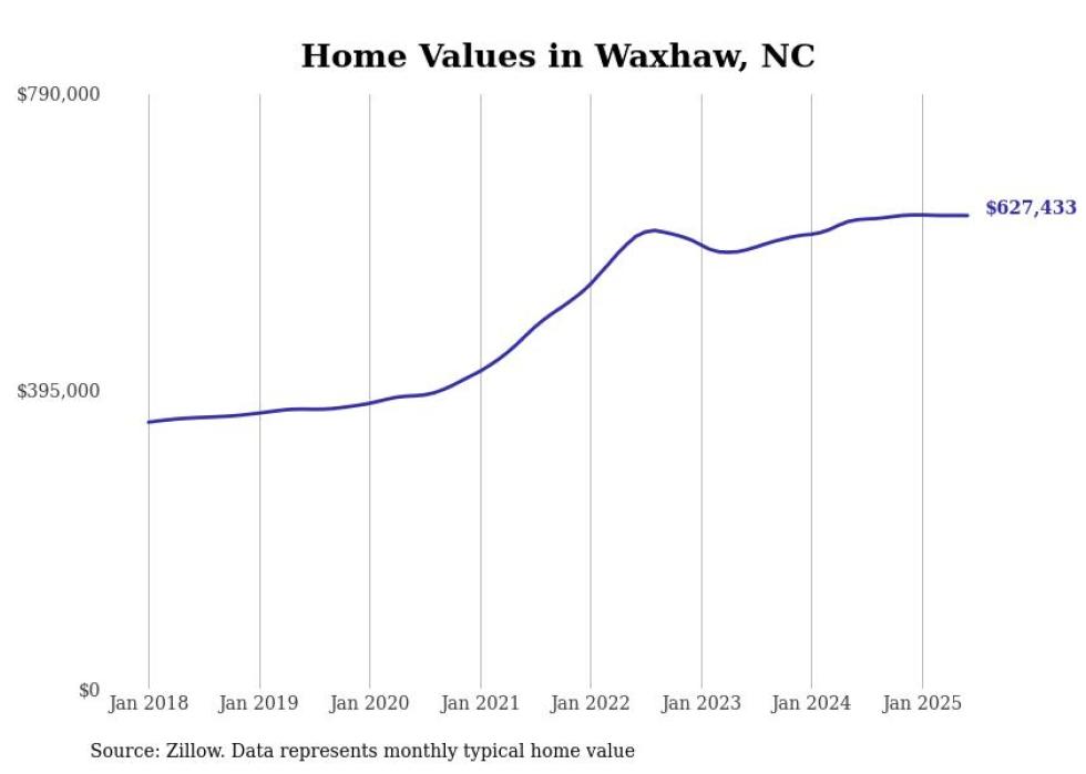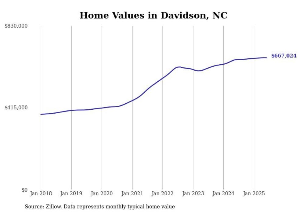 Stacker compiled a list of cities with the most expensive homes in the Charlotte-Concord-Gastonia, NC-SC metro area using data from Zillow. Charts show the monthly typical home value since January 2018.