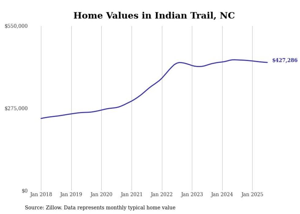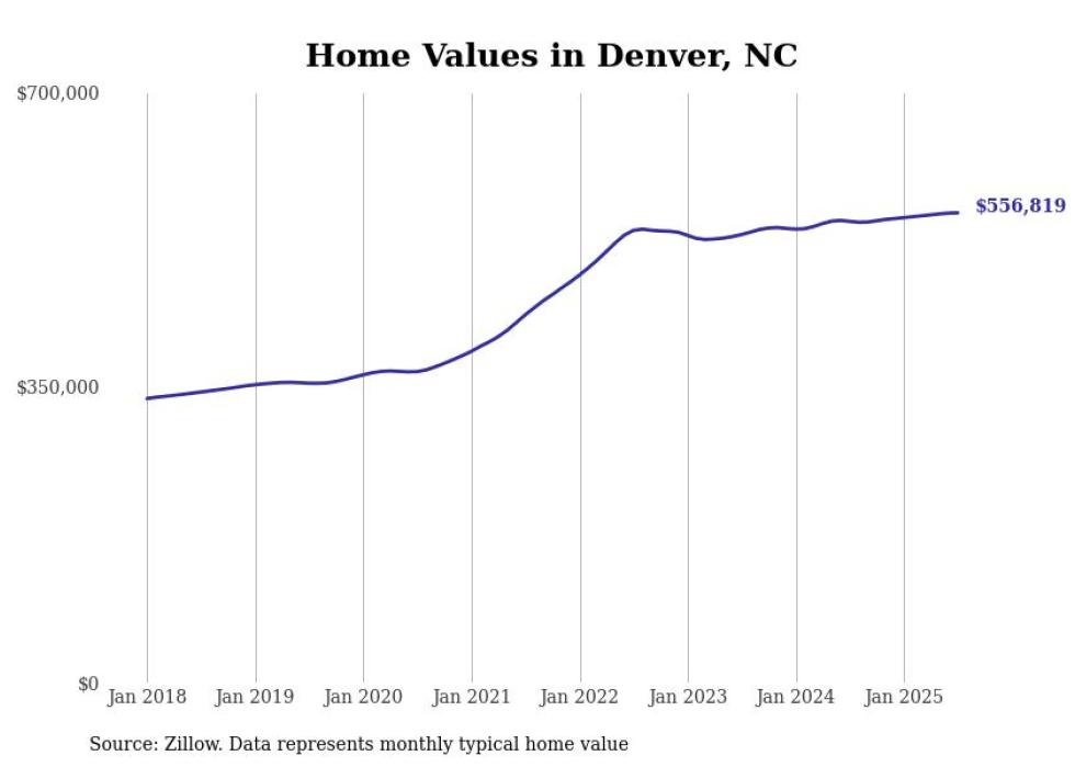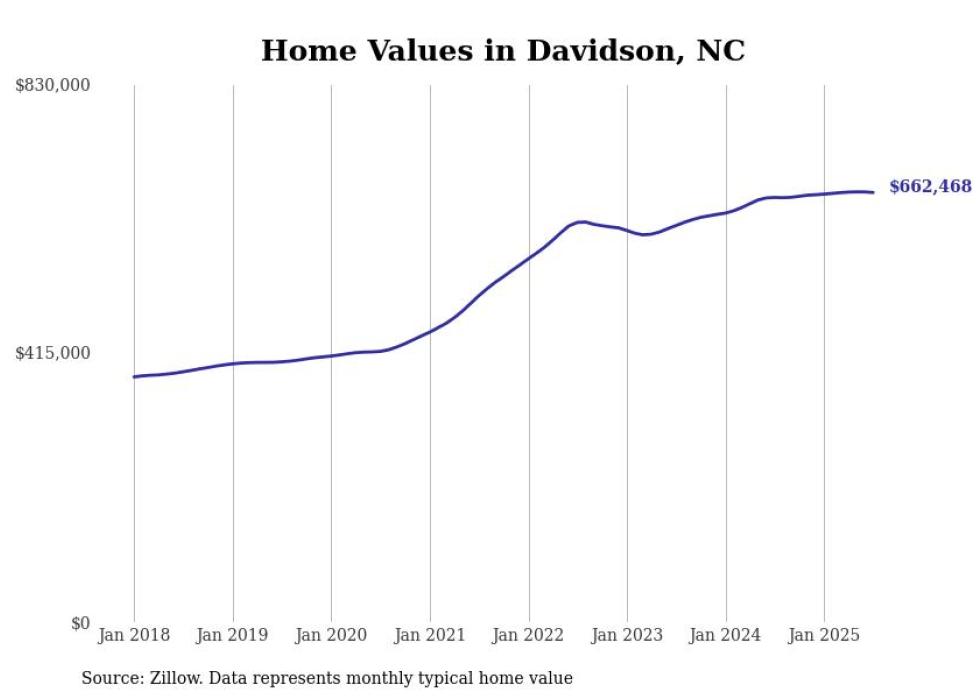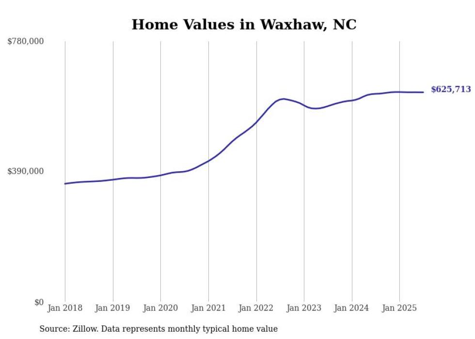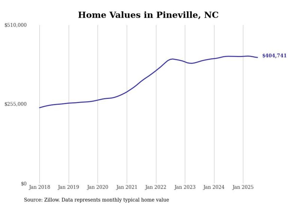 Stacker compiled a list of cities with the most expensive homes in the Charlotte metro area using data from Zillow. Charts show the monthly typical home value since January 2018. Data was available for 86 cities and towns.