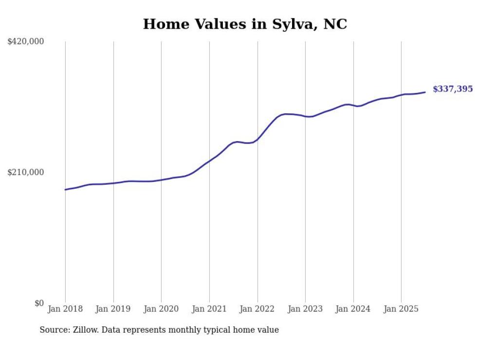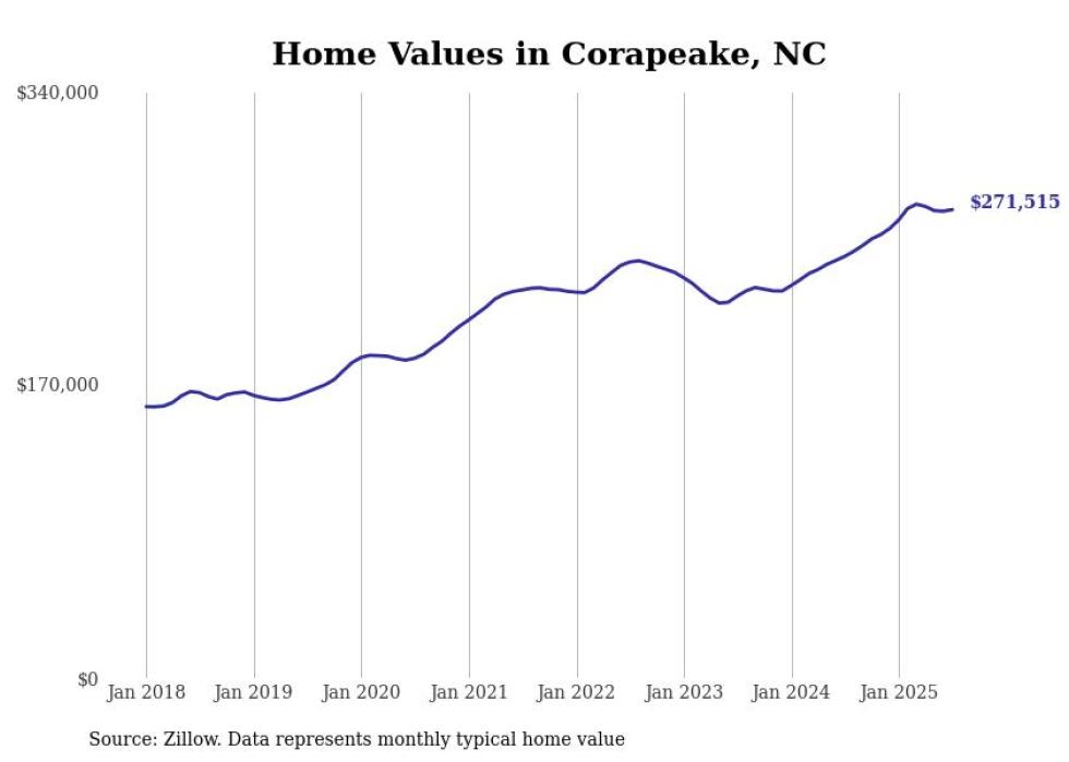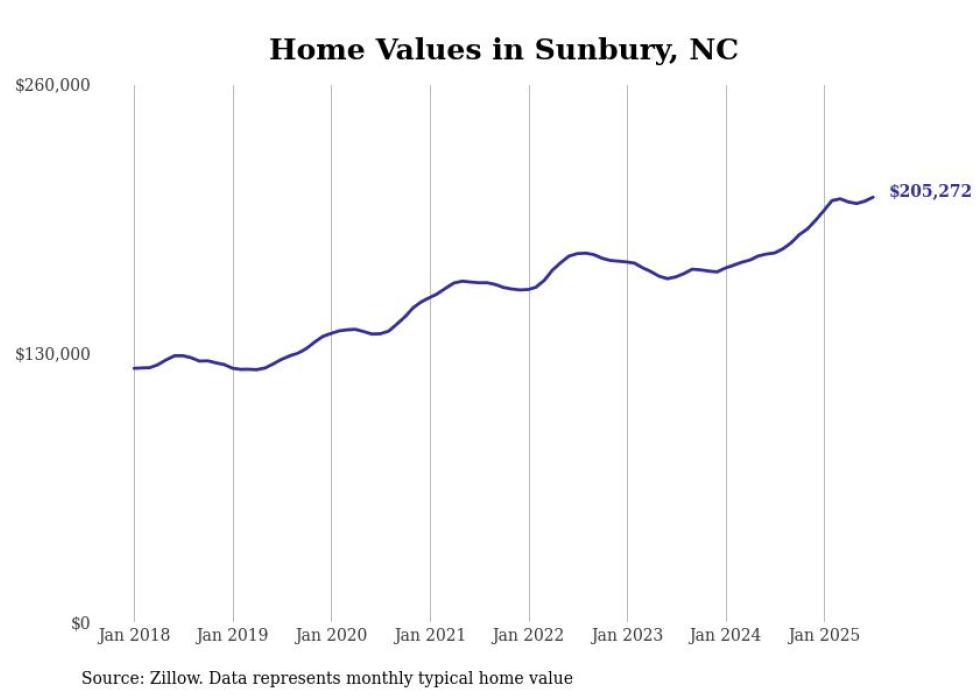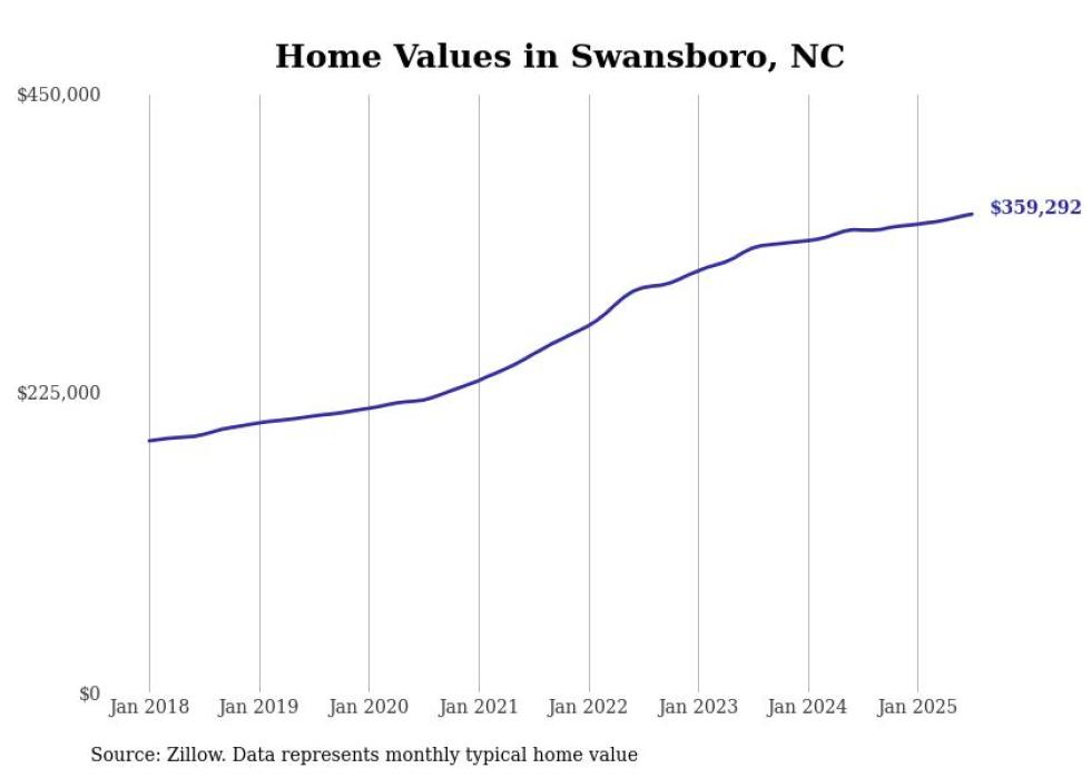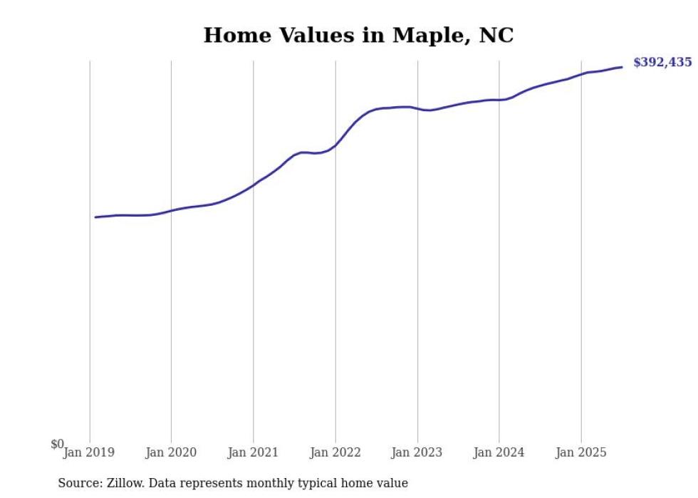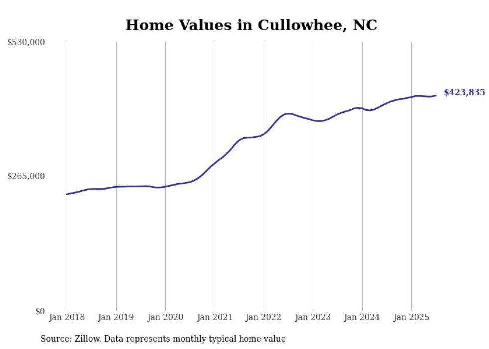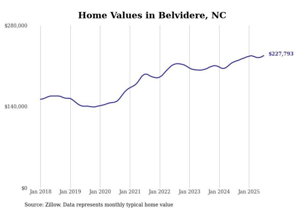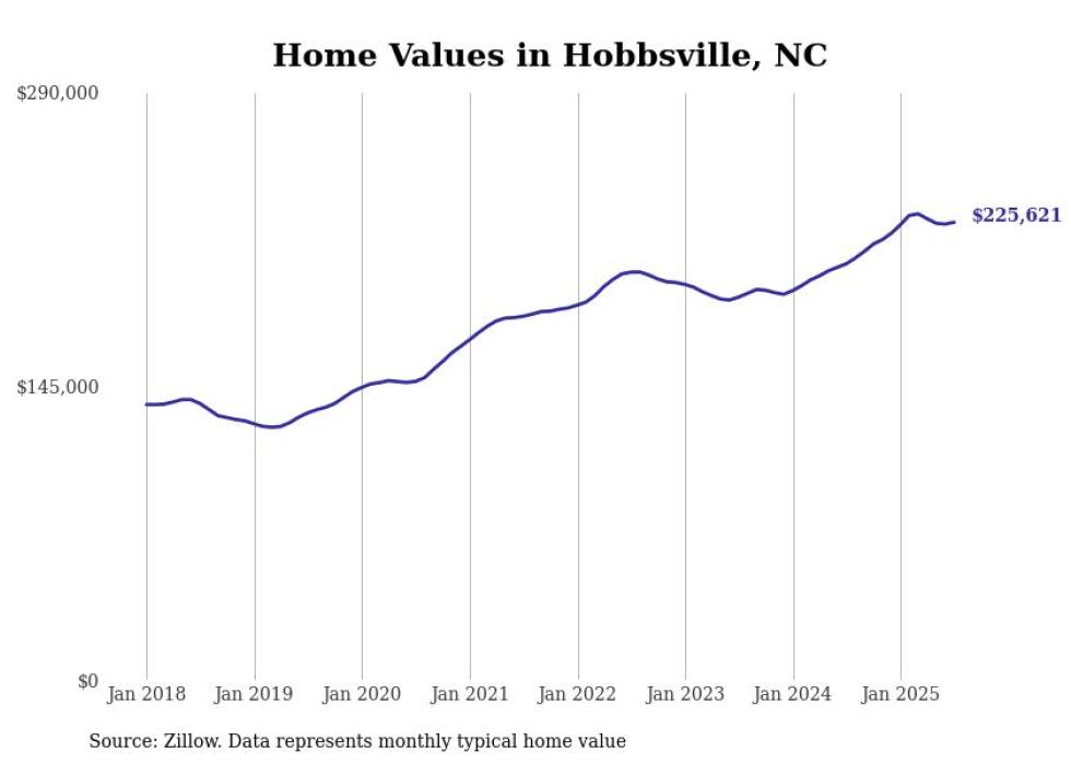 Stacker compiled a list of cities with the fastest-growing home prices in North Carolina using data from Zillow. Cities are ranked by the dollar change in the Zillow Home Values Index for all homes from the 12 months ending July 2025. The charts in this story were created automatically using Matplotlib. Data was available for 50 cities and towns in North Carolina.