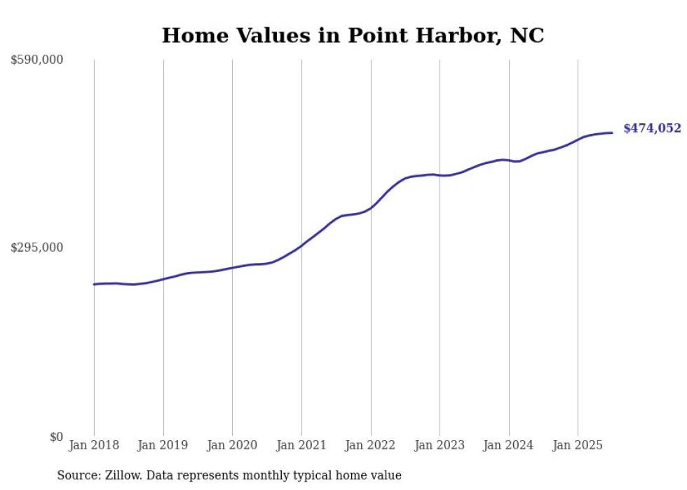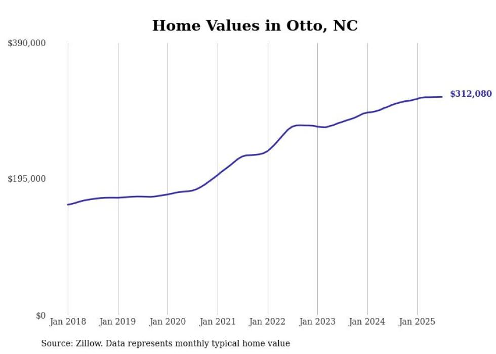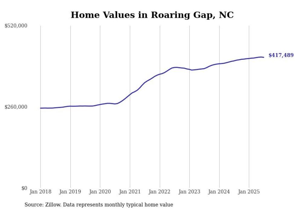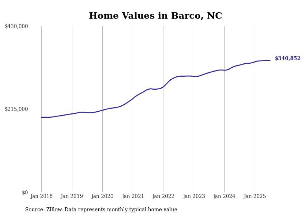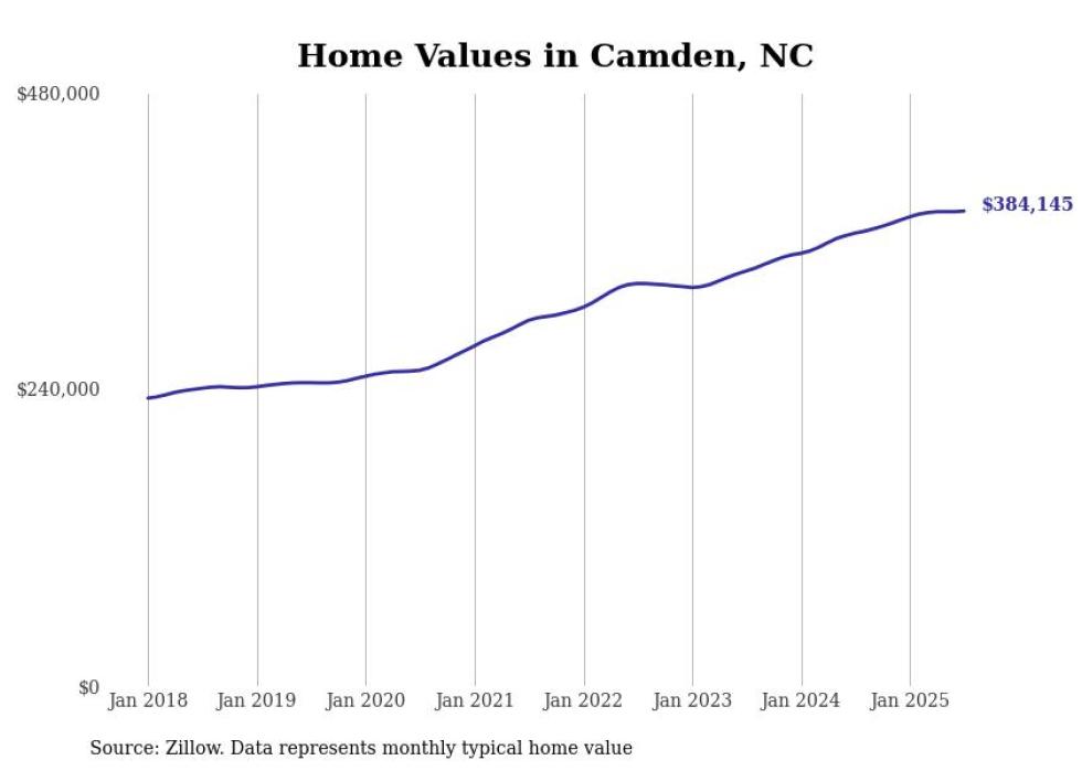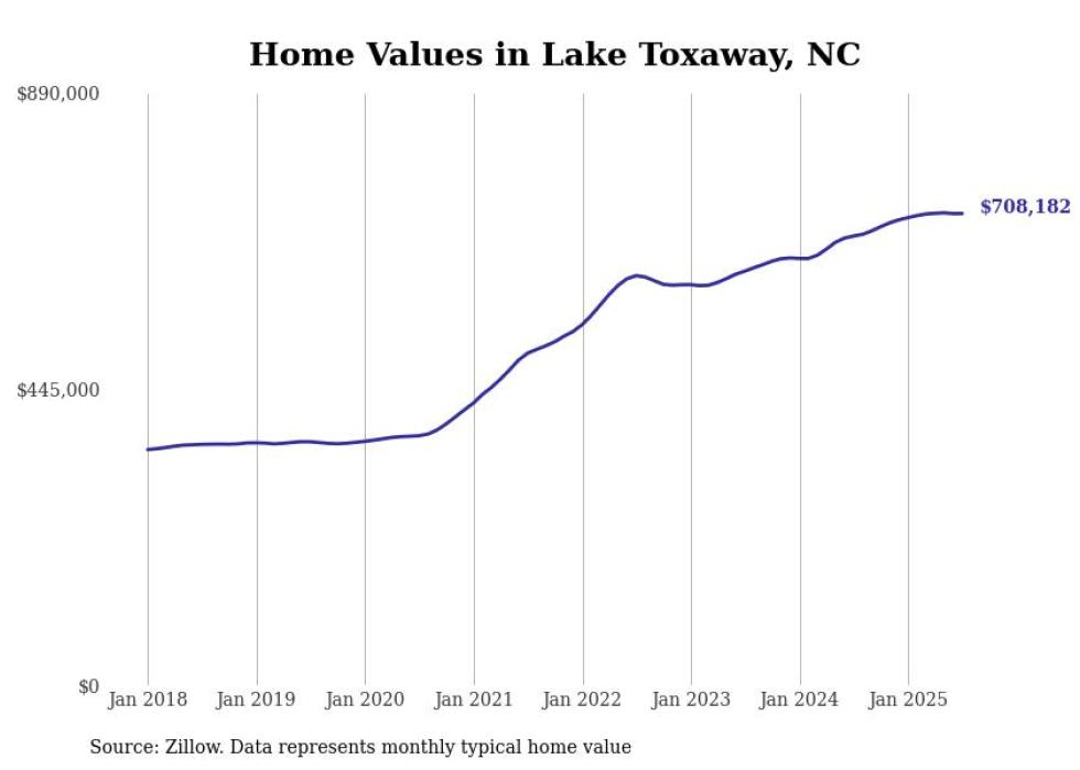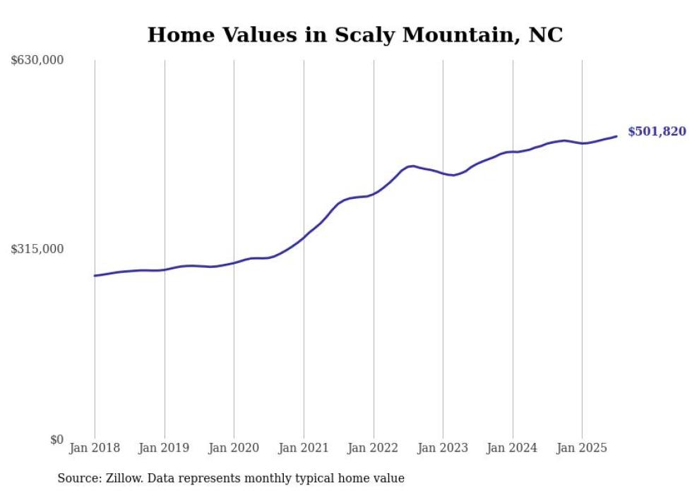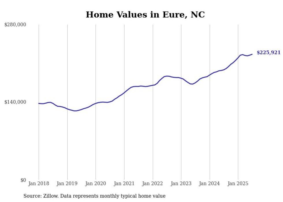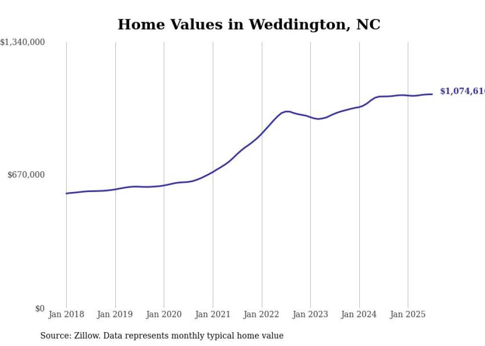 Stacker compiled a list of cities with the fastest-growing home prices in North Carolina using data from Zillow. Cities are ranked by the dollar change in the Zillow Home Values Index for all homes from the 12 months ending July 2025. The charts in this story were created automatically using Matplotlib. Data was available for 50 cities and towns in North Carolina.