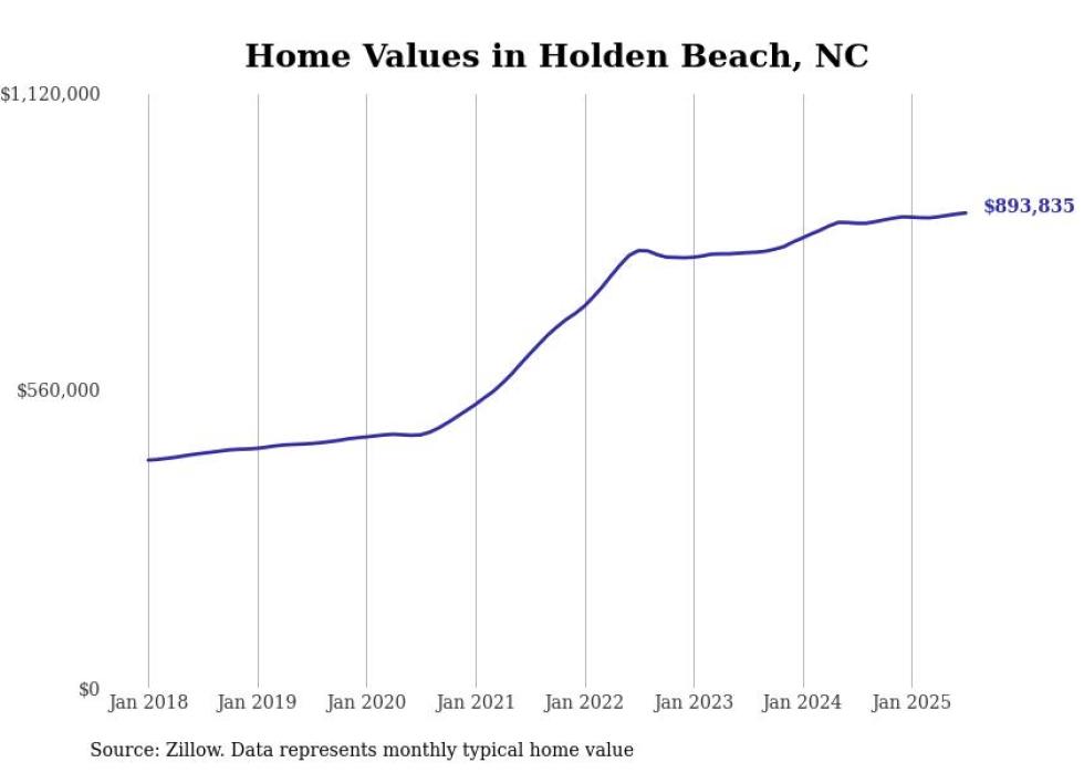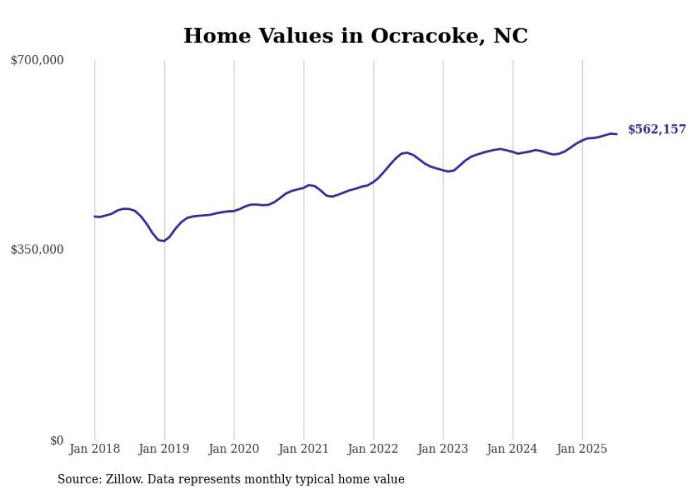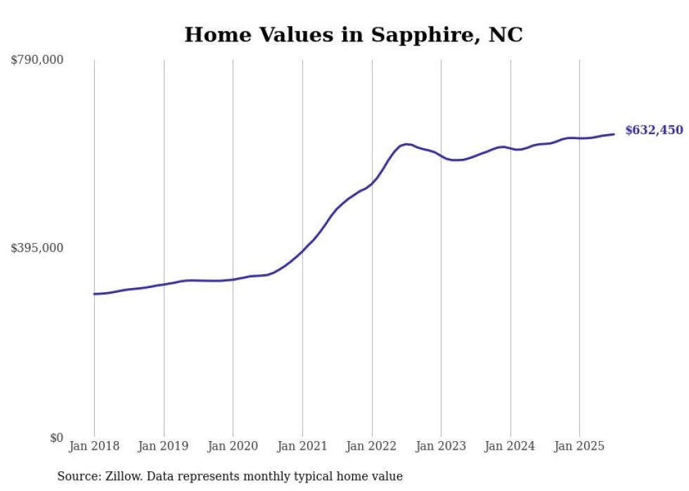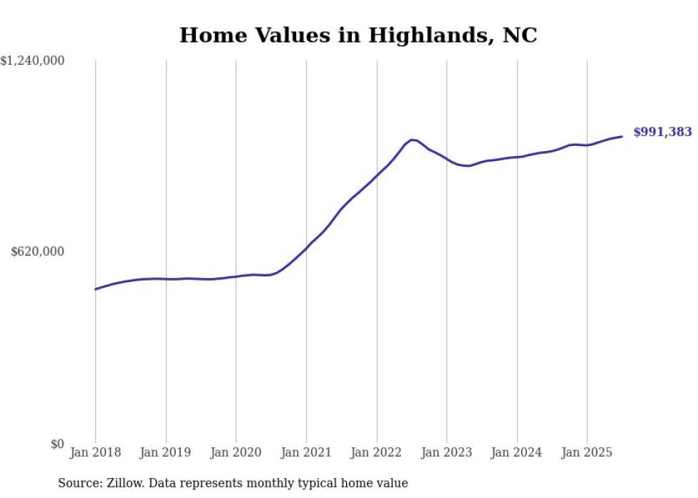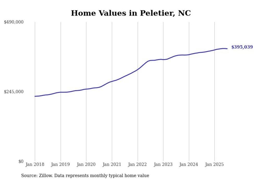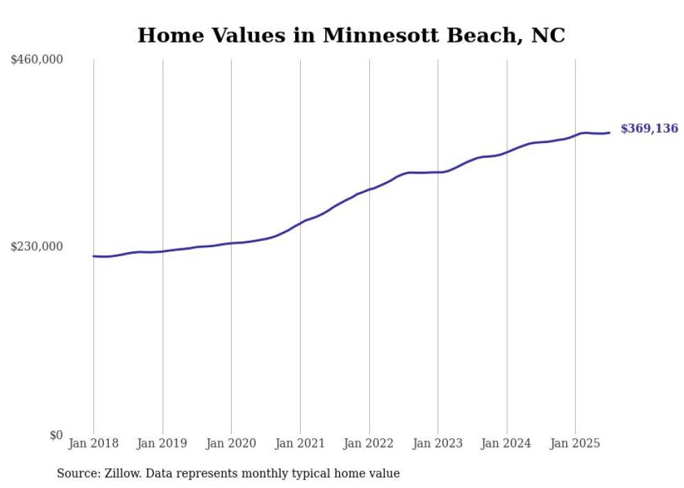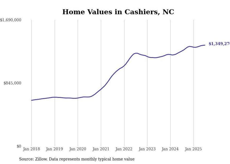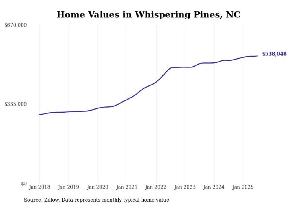 Stacker compiled a list of cities with the fastest-growing home prices in North Carolina using data from Zillow. Cities are ranked by the dollar change in the Zillow Home Values Index for all homes from the 12 months ending July 2025. The charts in this story were created automatically using Matplotlib. Data was available for 50 cities and towns in North Carolina.
