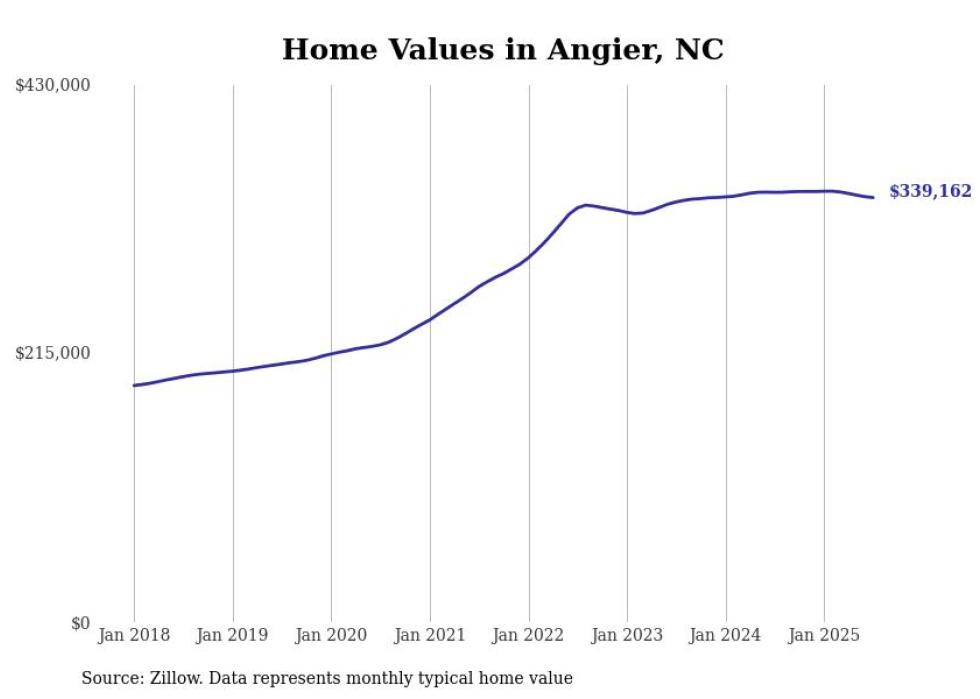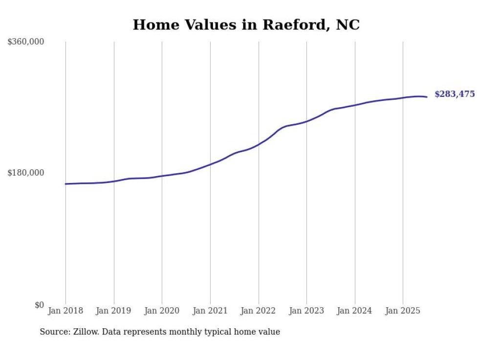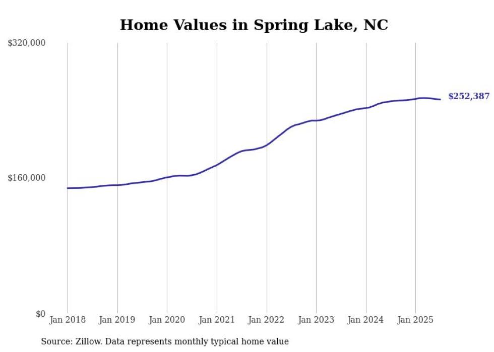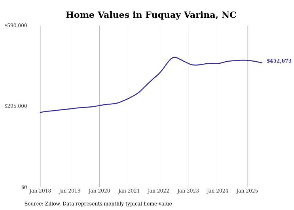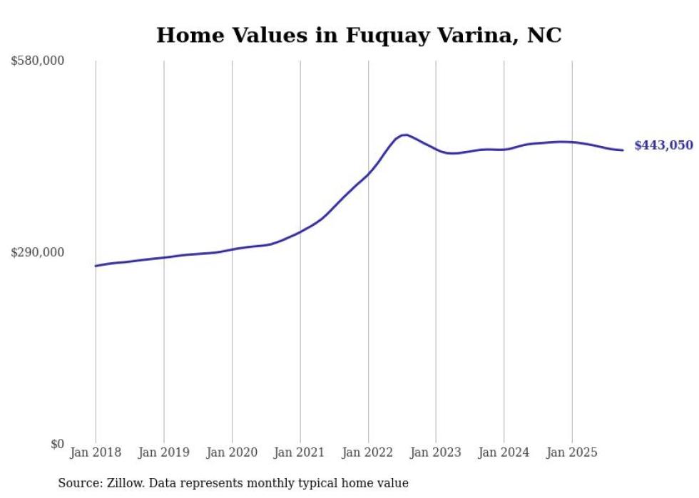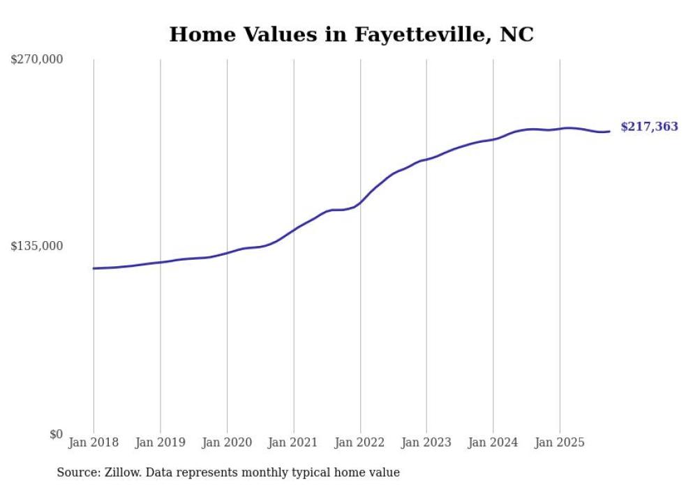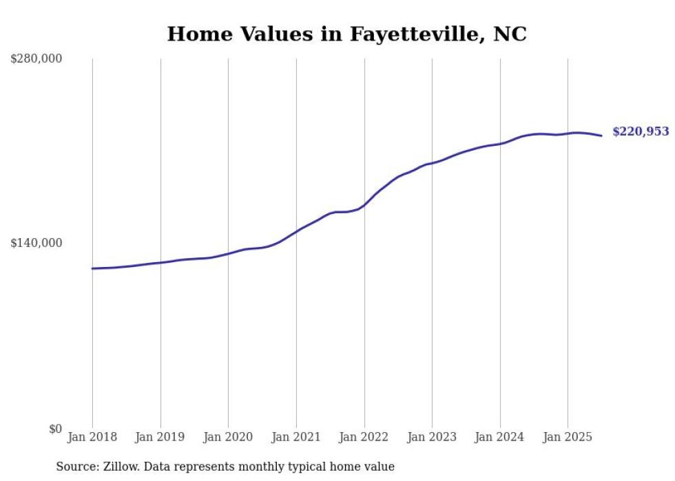 Stacker compiled a list of cities with the most expensive homes in the Fayetteville, North Carolina metro area using data from Zillow. Charts show the monthly typical home value since January 2018. All 20 cities and towns with data available were included in the list.