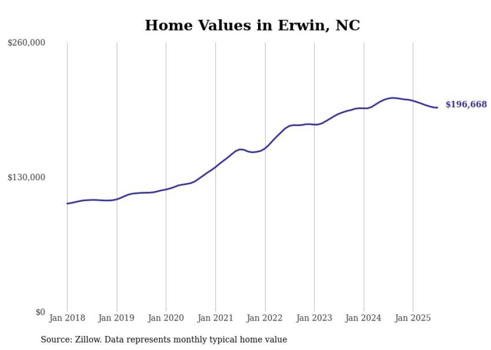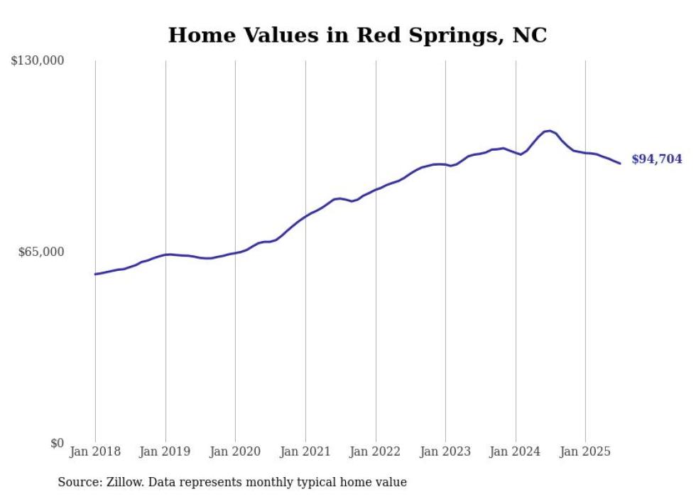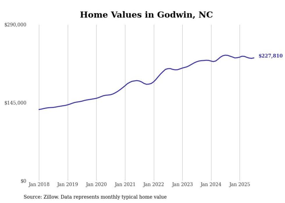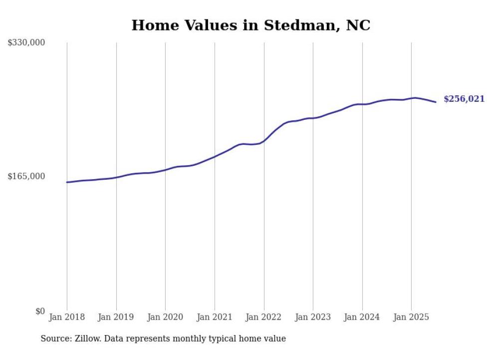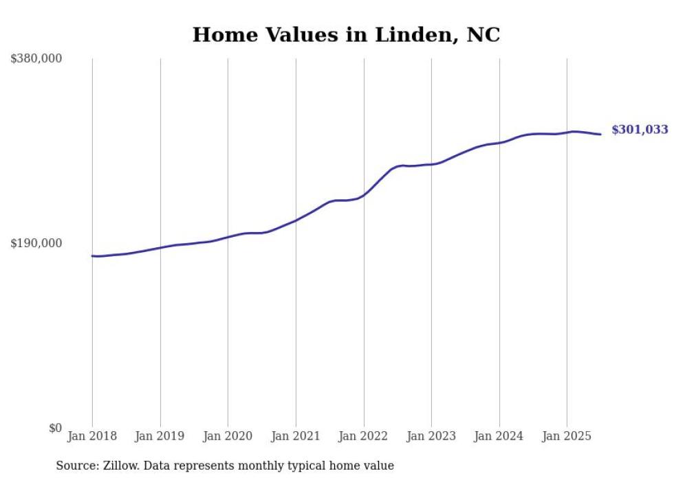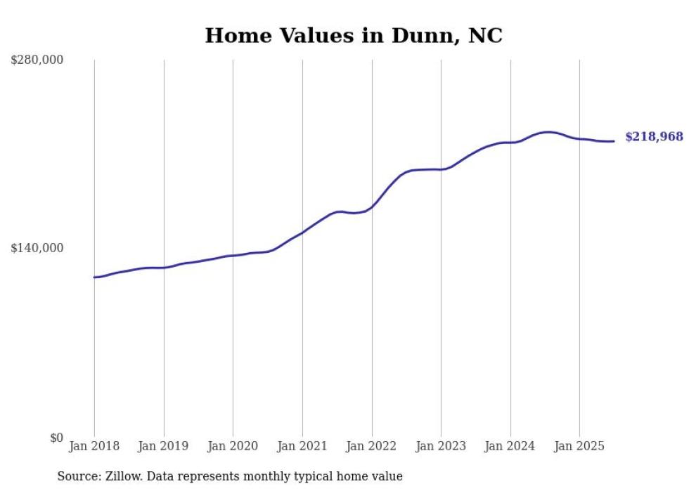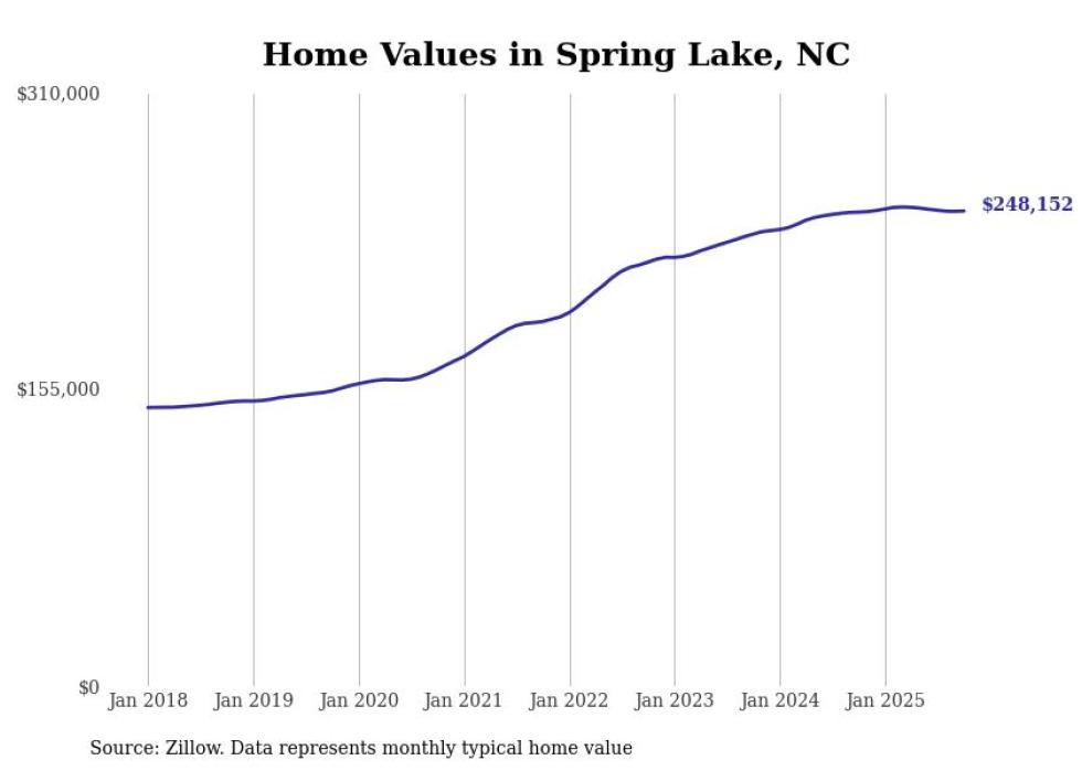 Stacker compiled a list of cities with the most expensive homes in the Fayetteville, North Carolina metro area using data from Zillow. Charts show the monthly typical home value since January 2018. All 20 cities and towns with data available were included in the list.