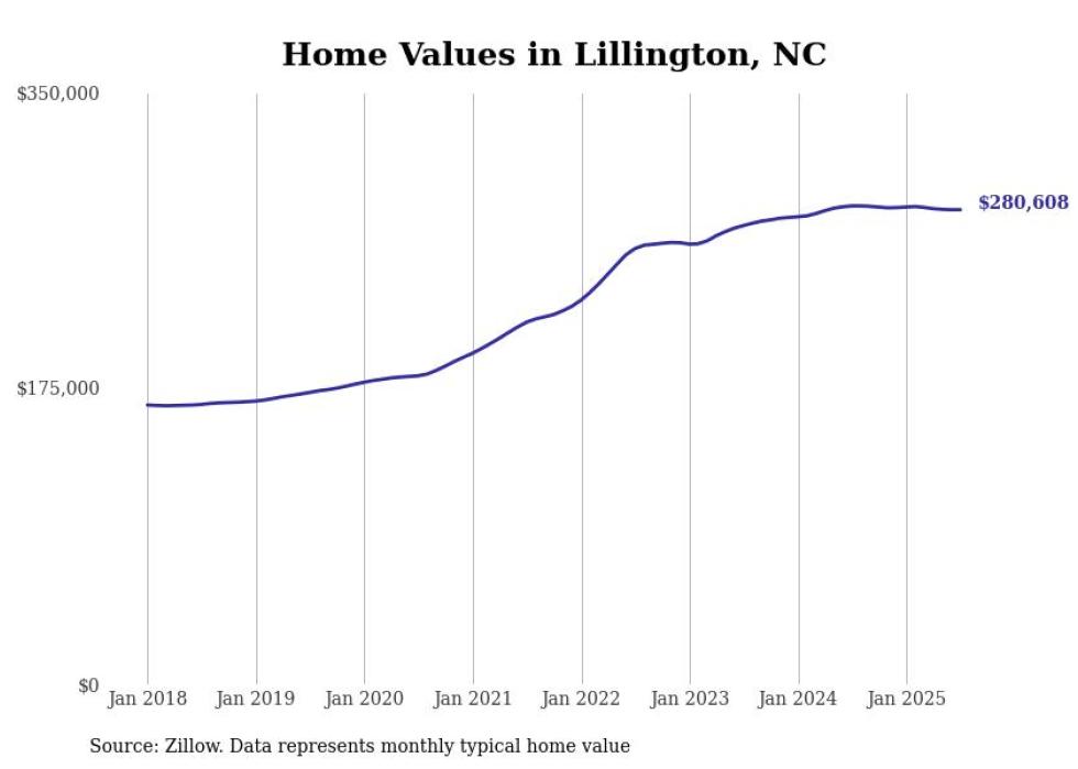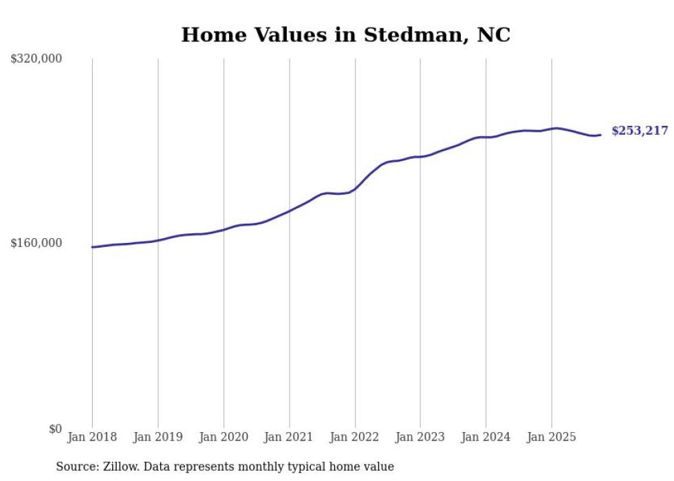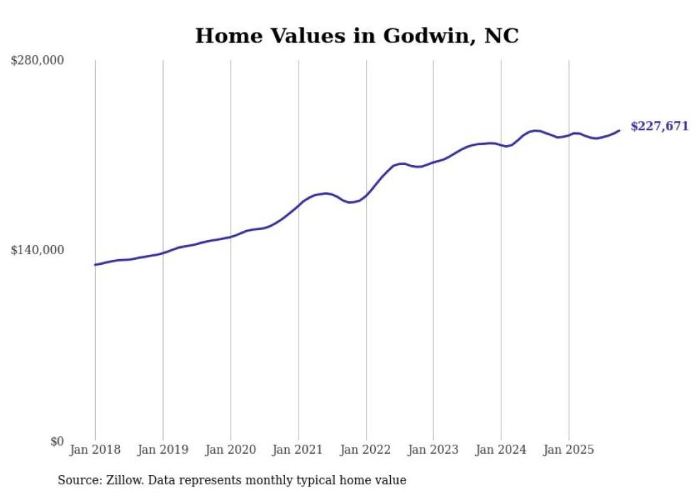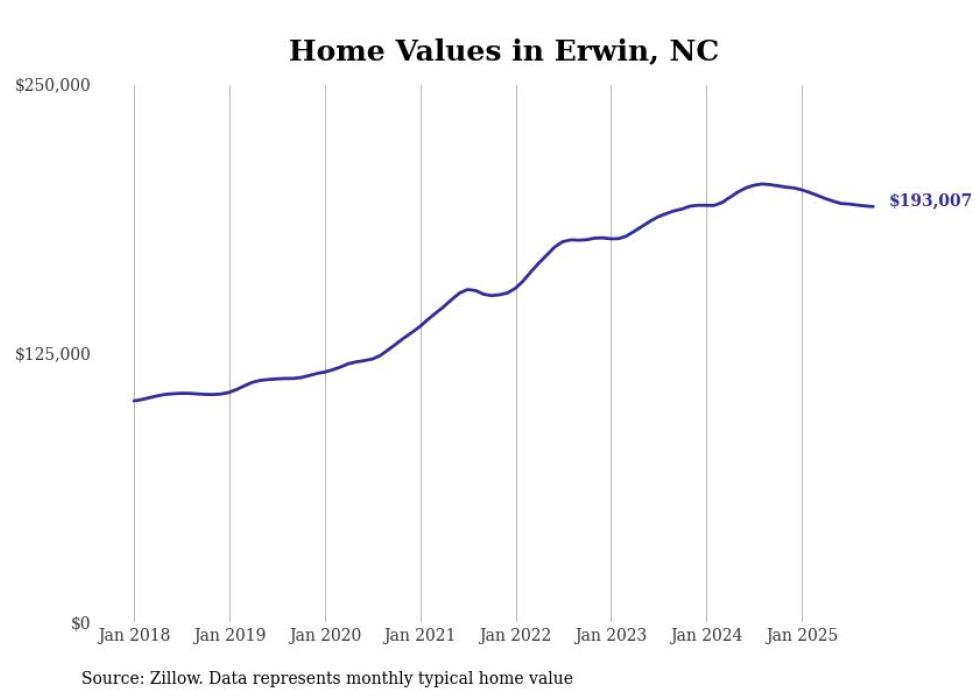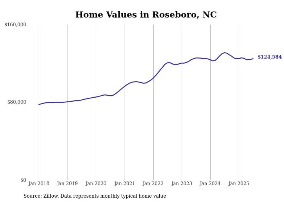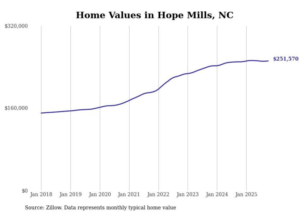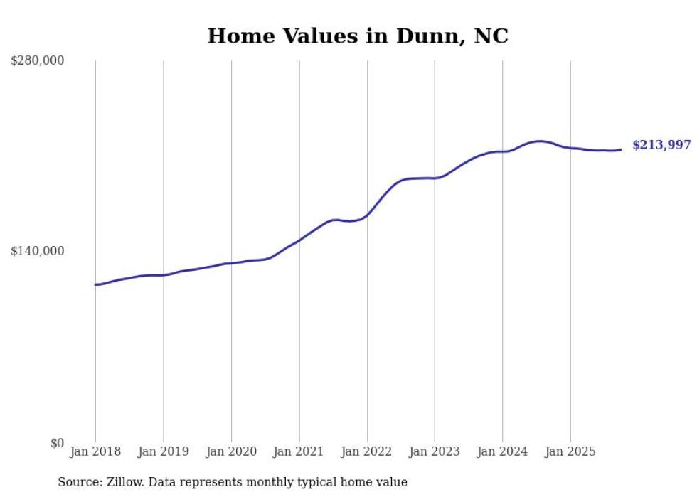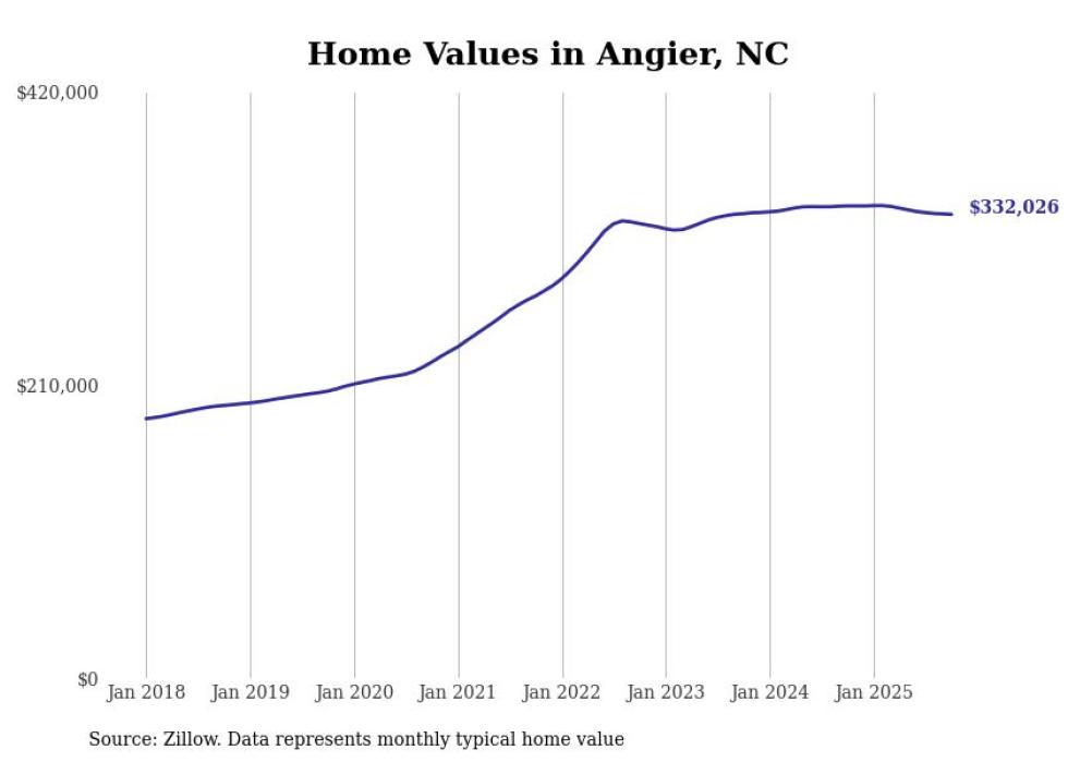 Stacker compiled a list of cities with the most expensive homes in the Fayetteville, North Carolina metro area using data from Zillow. Charts show the monthly typical home value since January 2018. All 20 cities and towns with data available were included in the list.