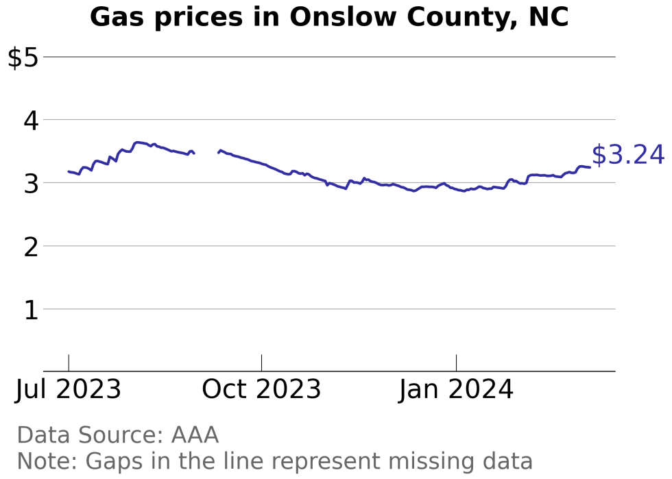 How gas prices have changed in Onslow County, North Carolina in the last week