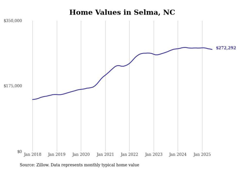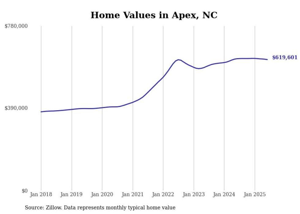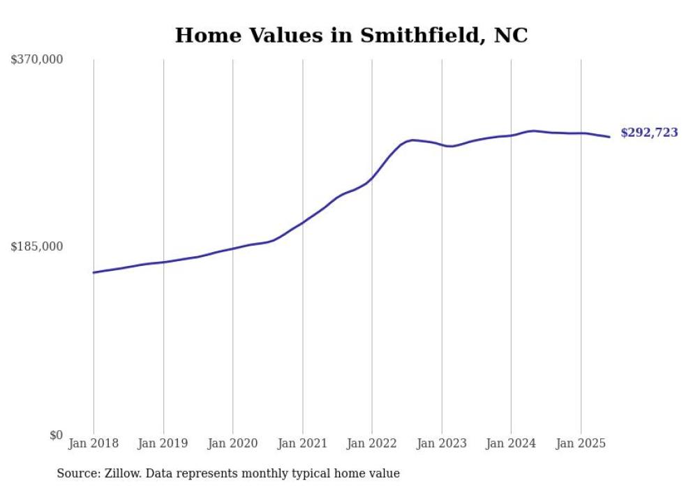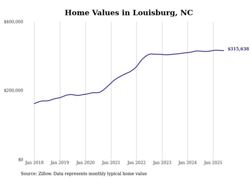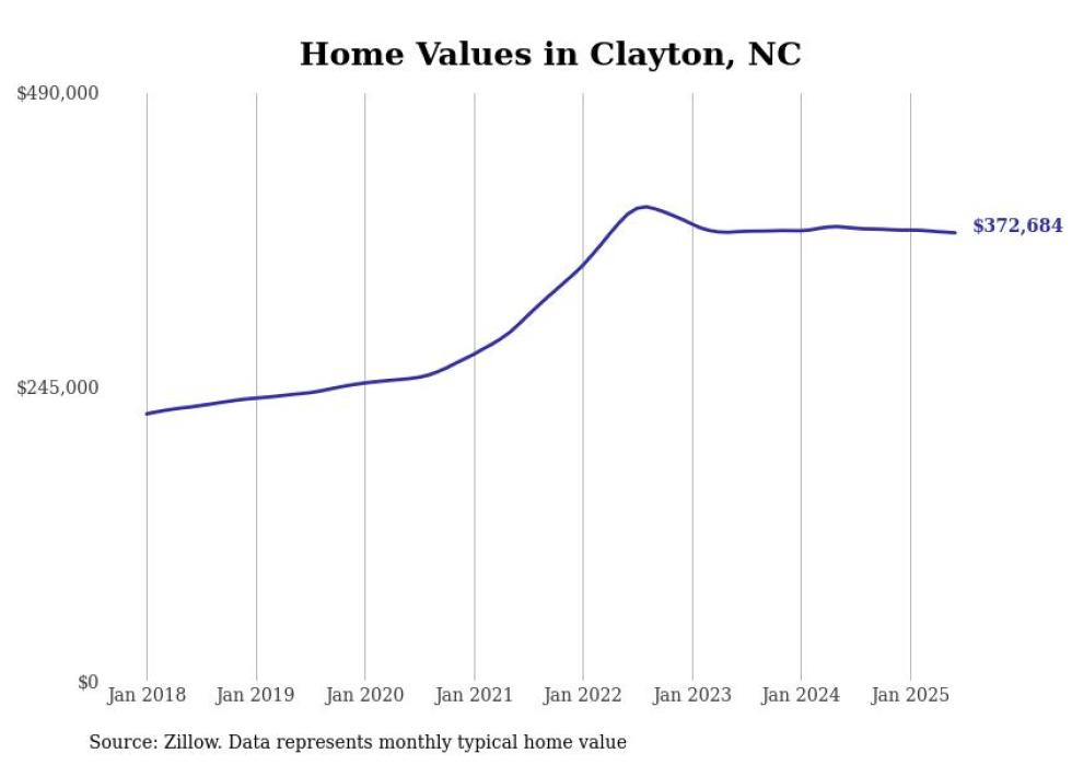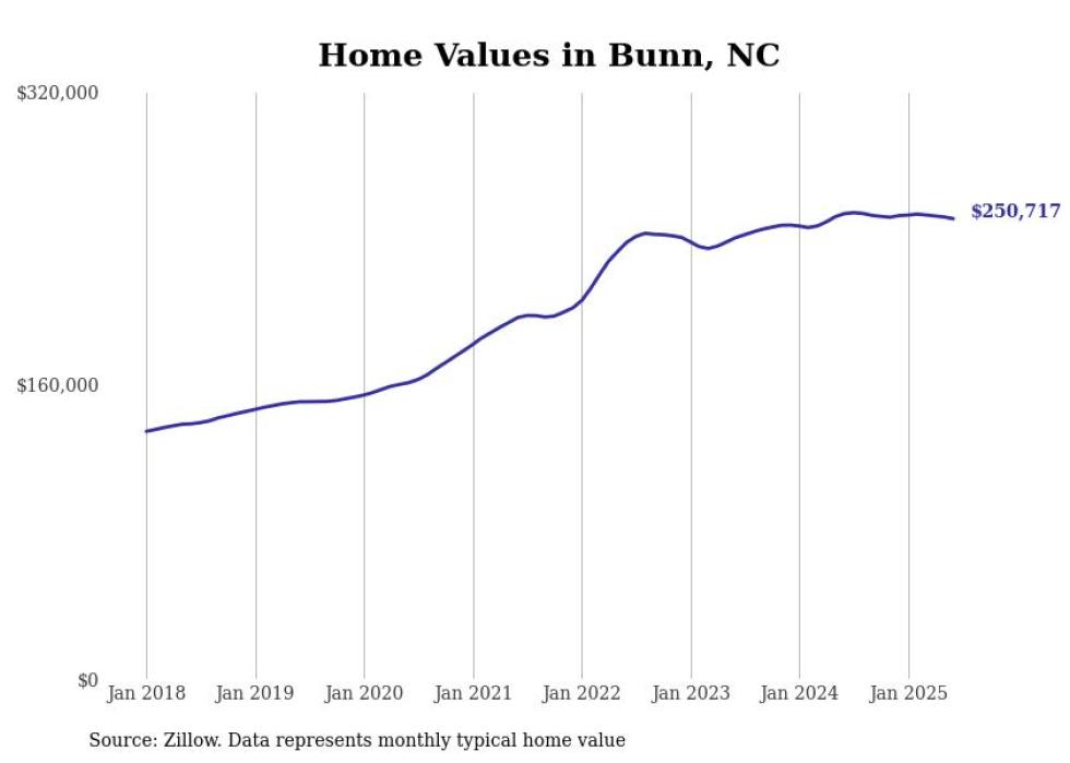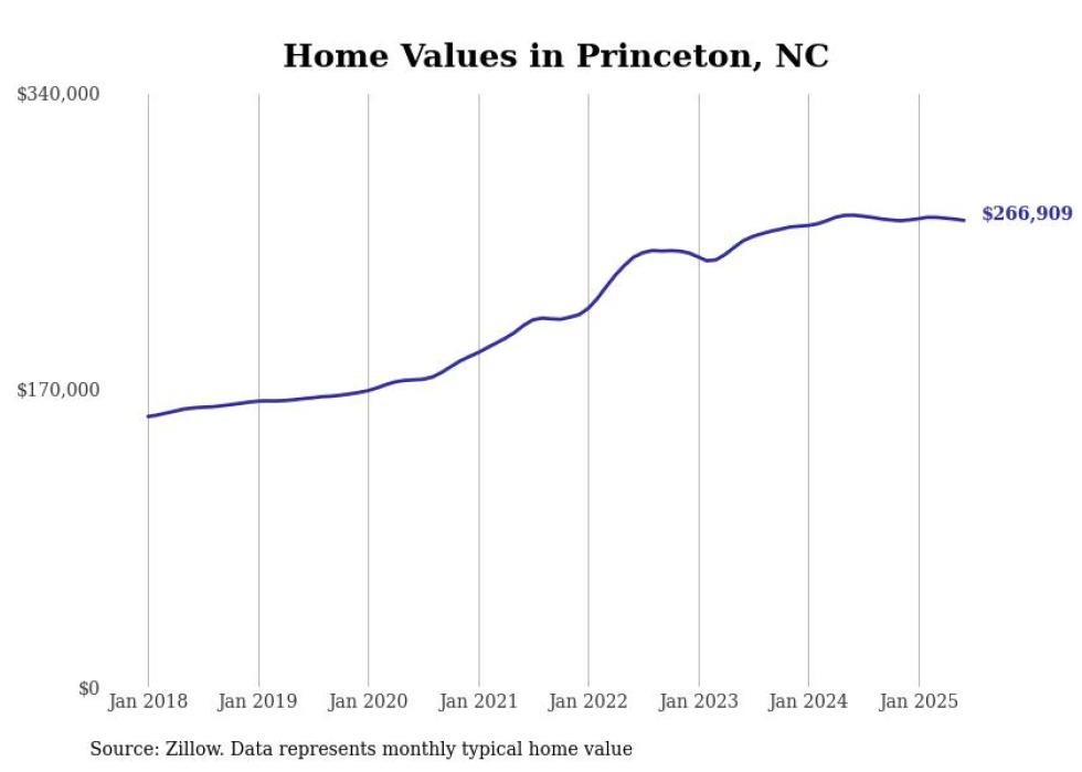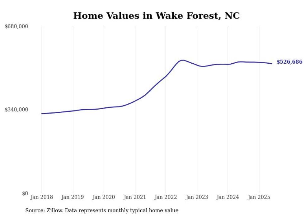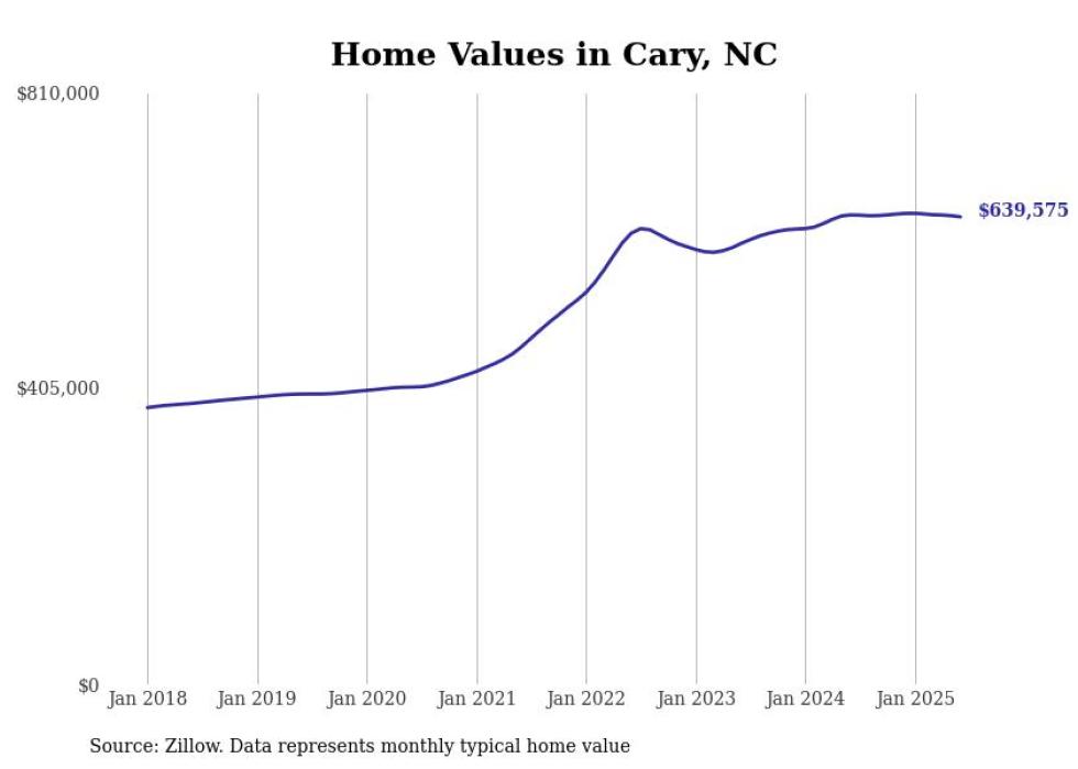 Stacker compiled a list of cities with the most expensive homes in the Raleigh-Cary, NC metro area using data from Zillow. Charts show the monthly typical home value since January 2018.
