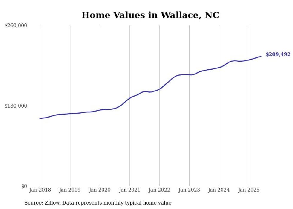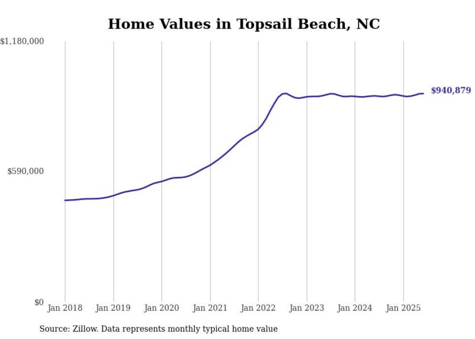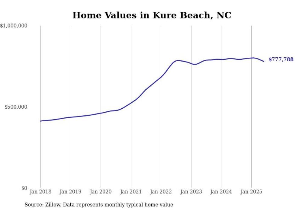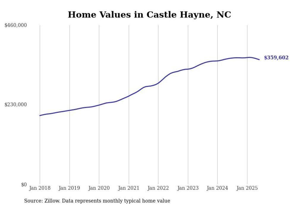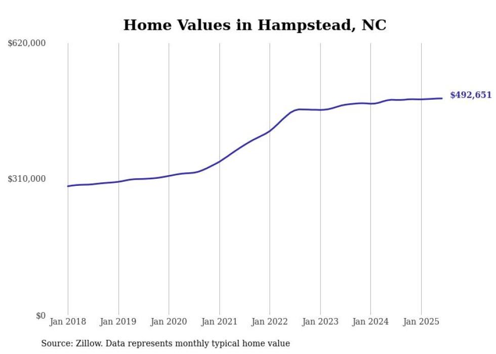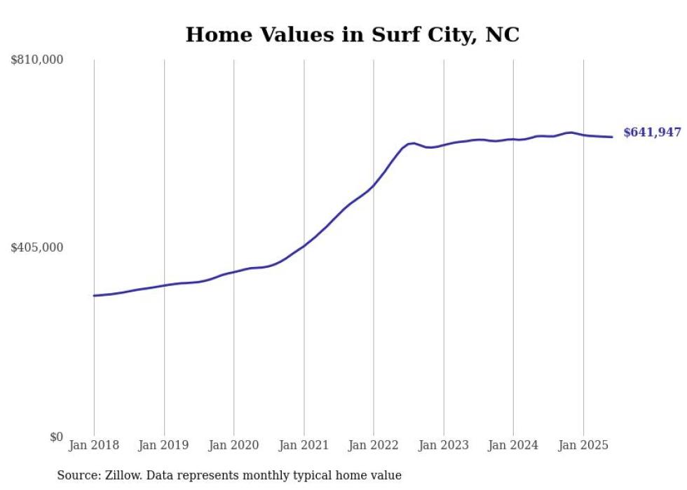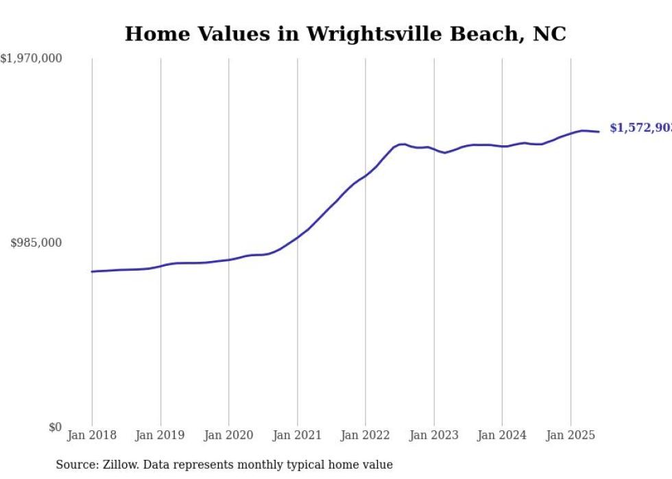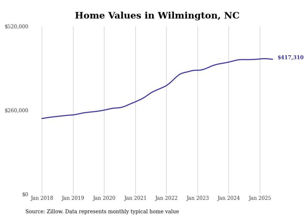 Stacker compiled a list of cities with the most expensive homes in the Wilmington, NC metro area using data from Zillow. Charts show the monthly typical home value since January 2018.