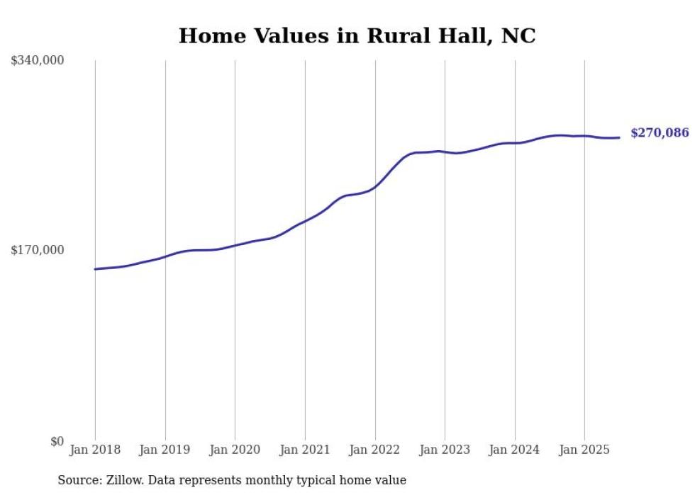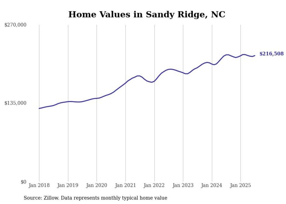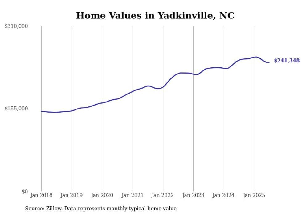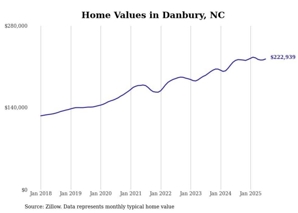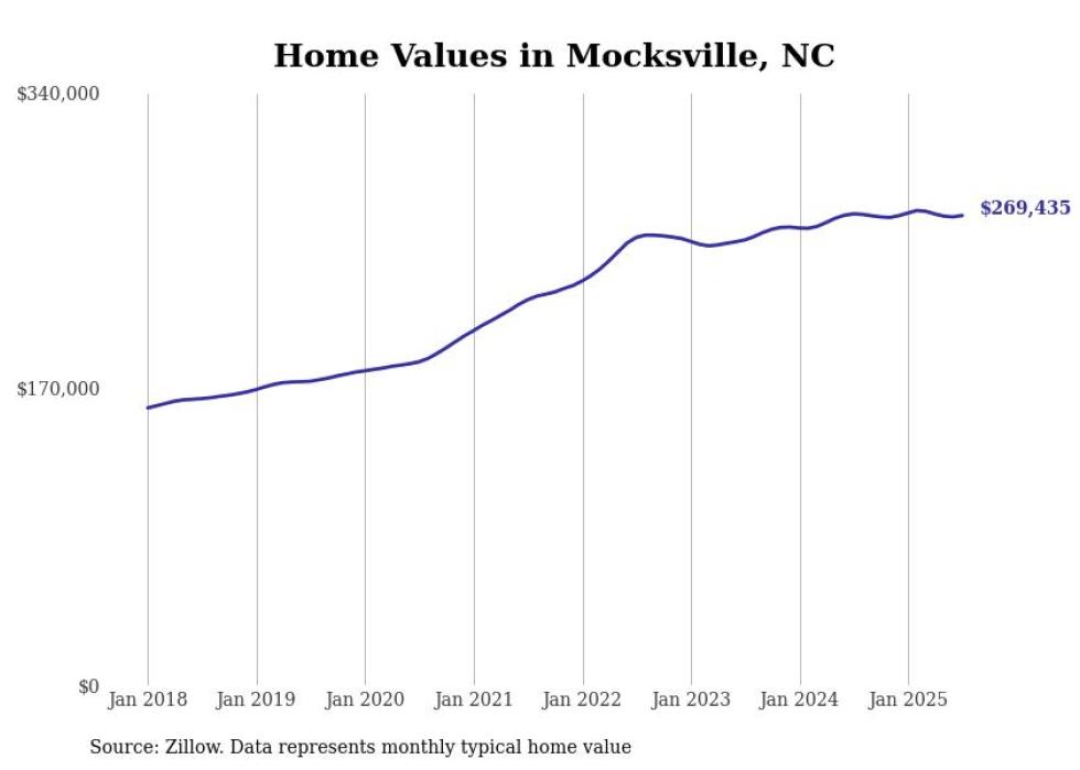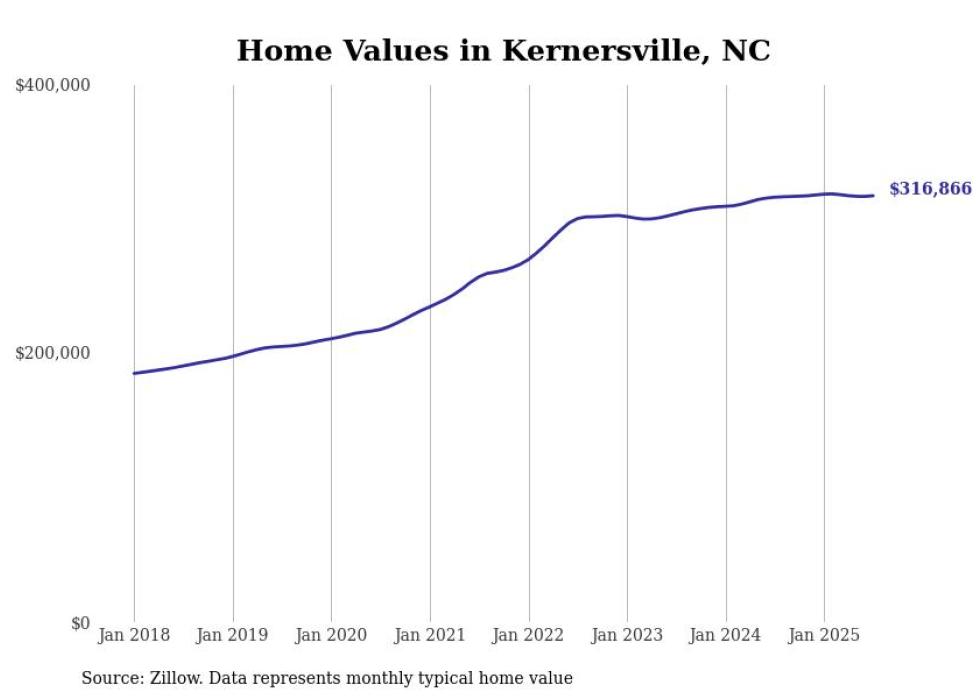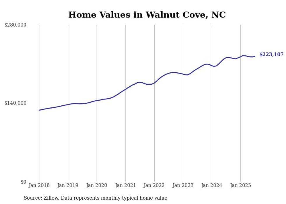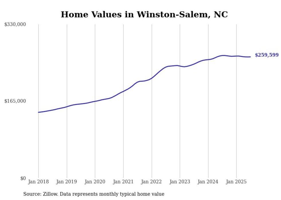Stacker compiled a list of cities with the most expensive homes in the Winston-Salem metro area using data from Zillow. Charts show the monthly typical home value since January 2018. All 28 cities and towns with data available were included in the list.