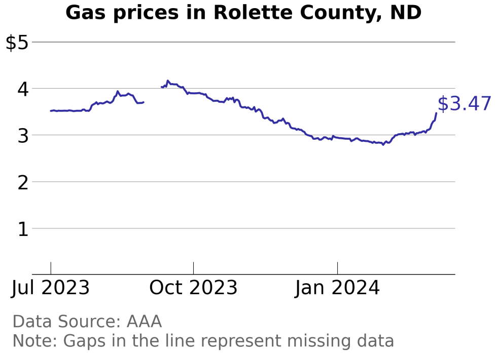 How gas prices have changed in Rolette County, North Dakota in the last week