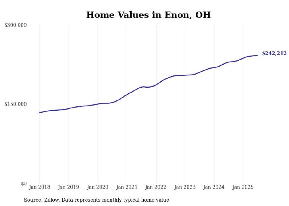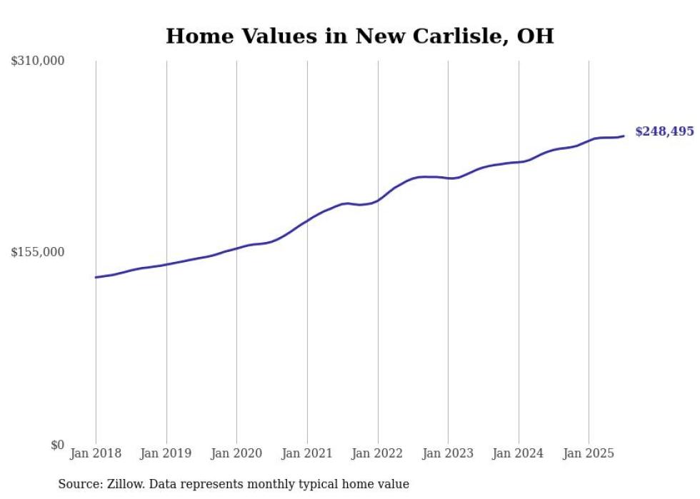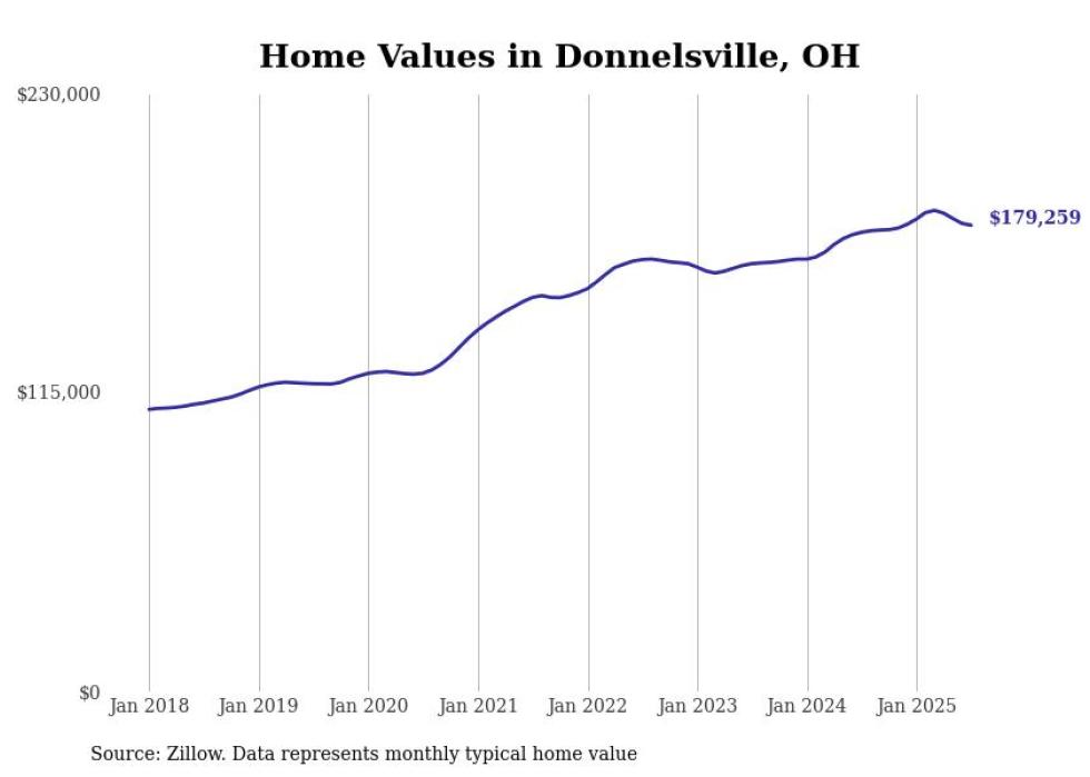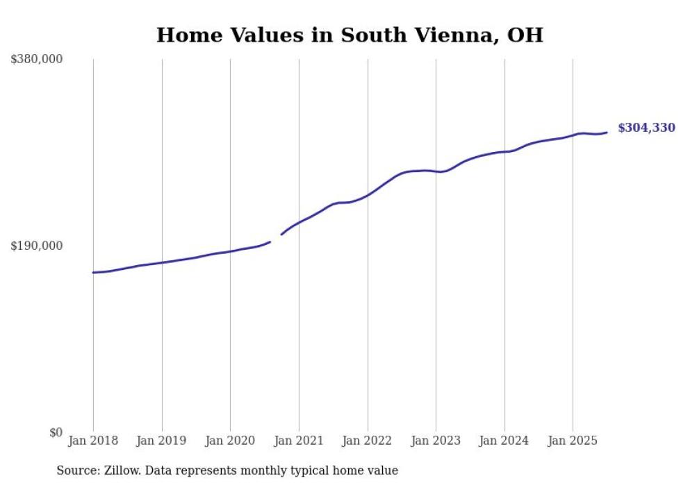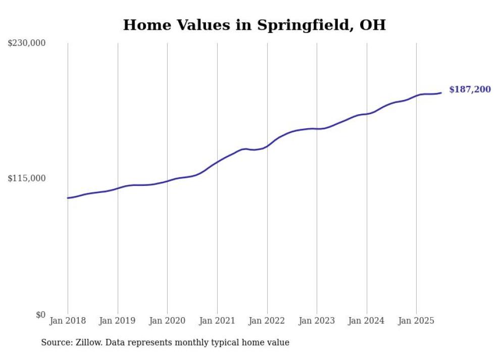 Stacker compiled a list of cities with the most expensive homes in the Springfield, Ohio metro area using data from Zillow. Charts show the monthly typical home value since January 2018. All 8 cities and towns with data available were included in the list.