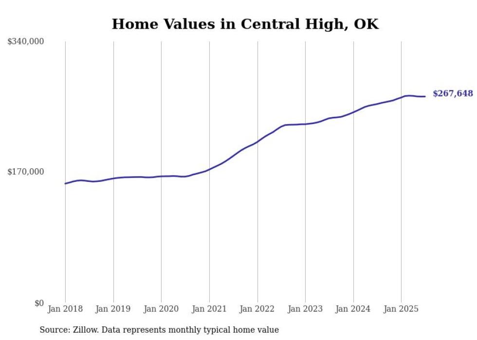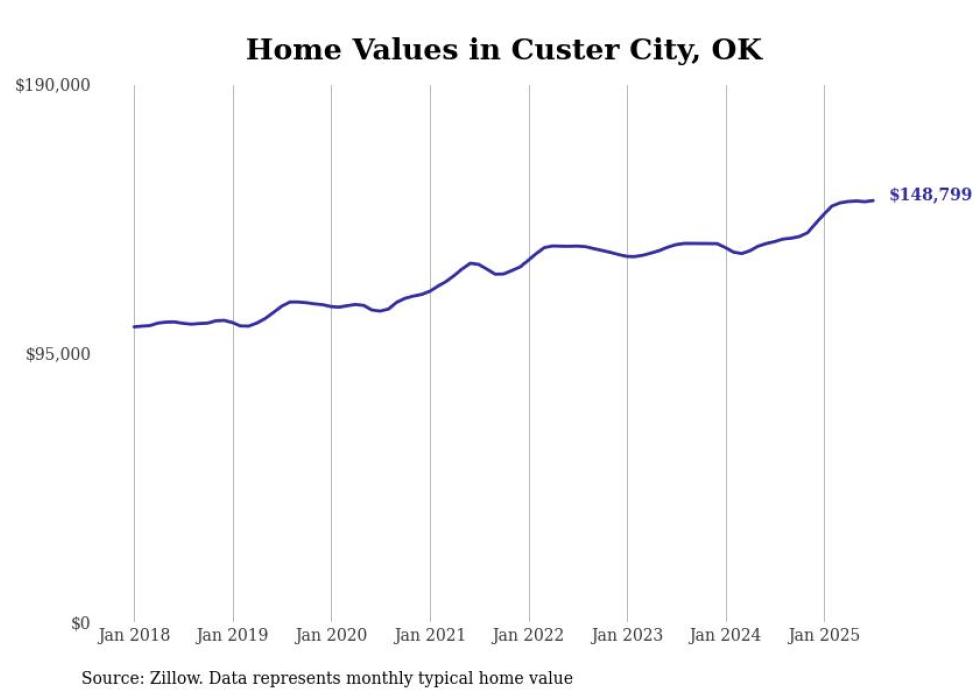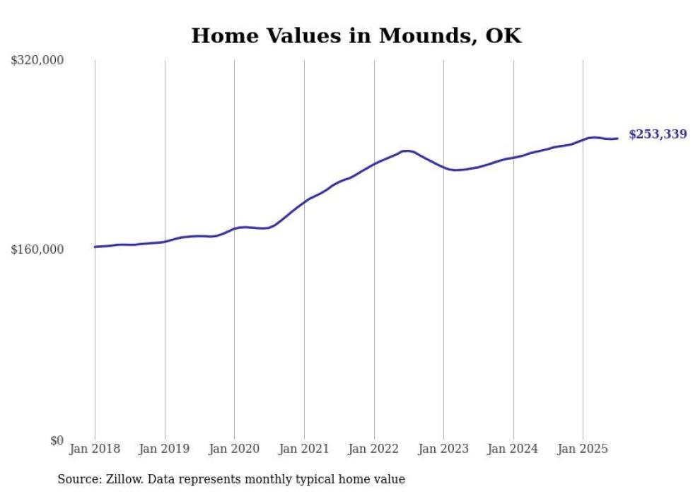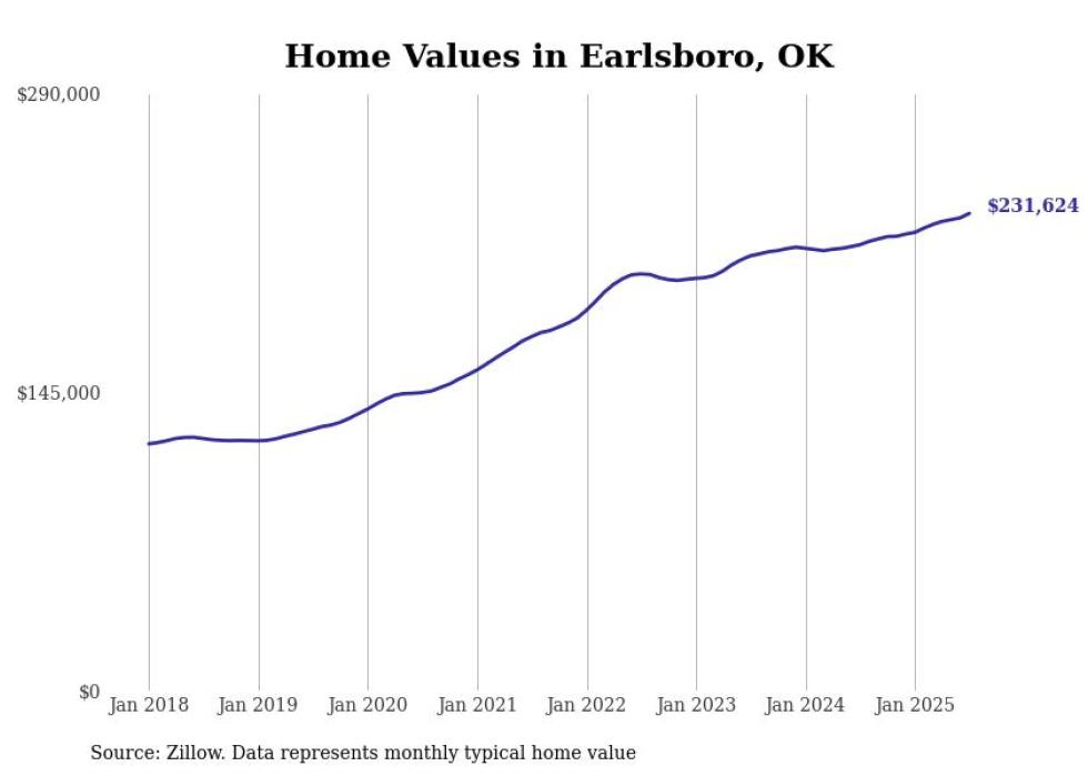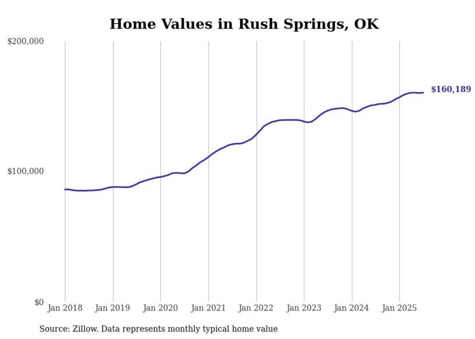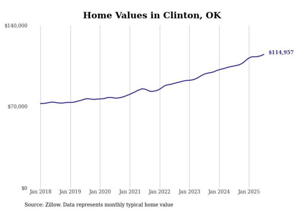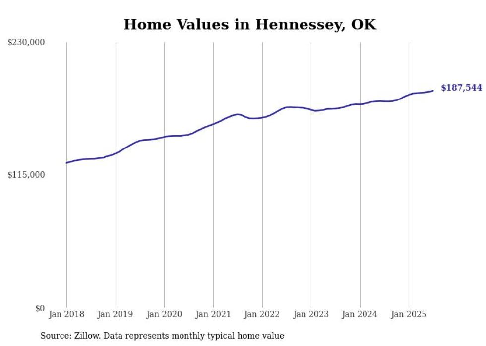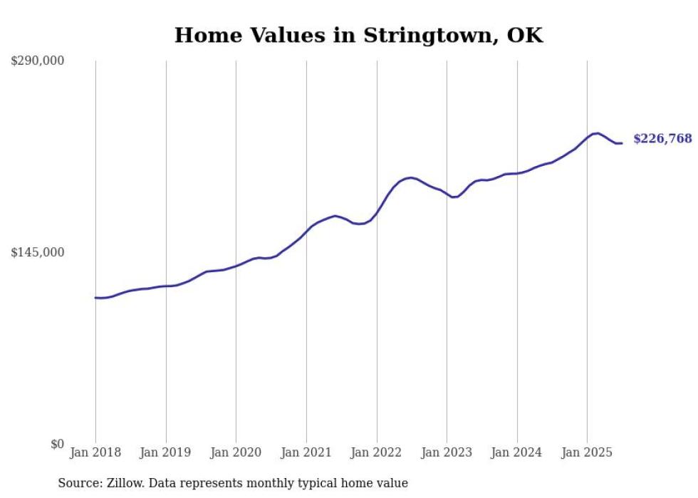 Stacker compiled a list of cities with the fastest-growing home prices in Oklahoma using data from Zillow. Cities are ranked by the dollar change in the Zillow Home Values Index for all homes from the 12 months ending July 2025. The charts in this story were created automatically using Matplotlib. Data was available for 50 cities and towns in Oklahoma.