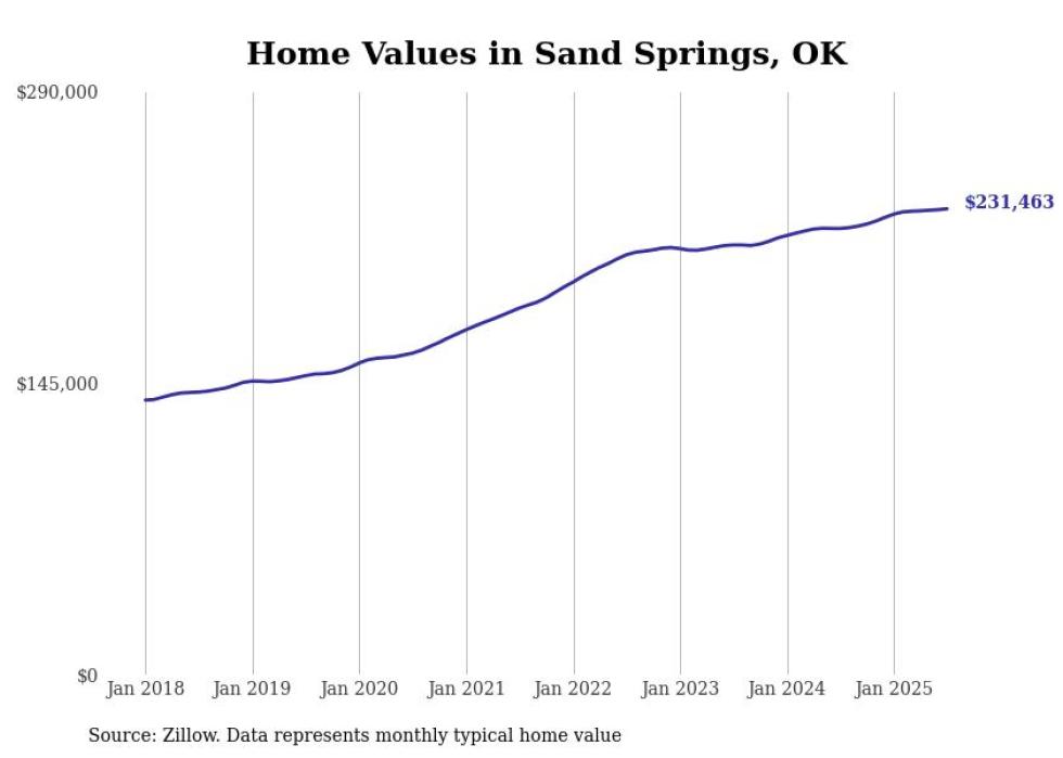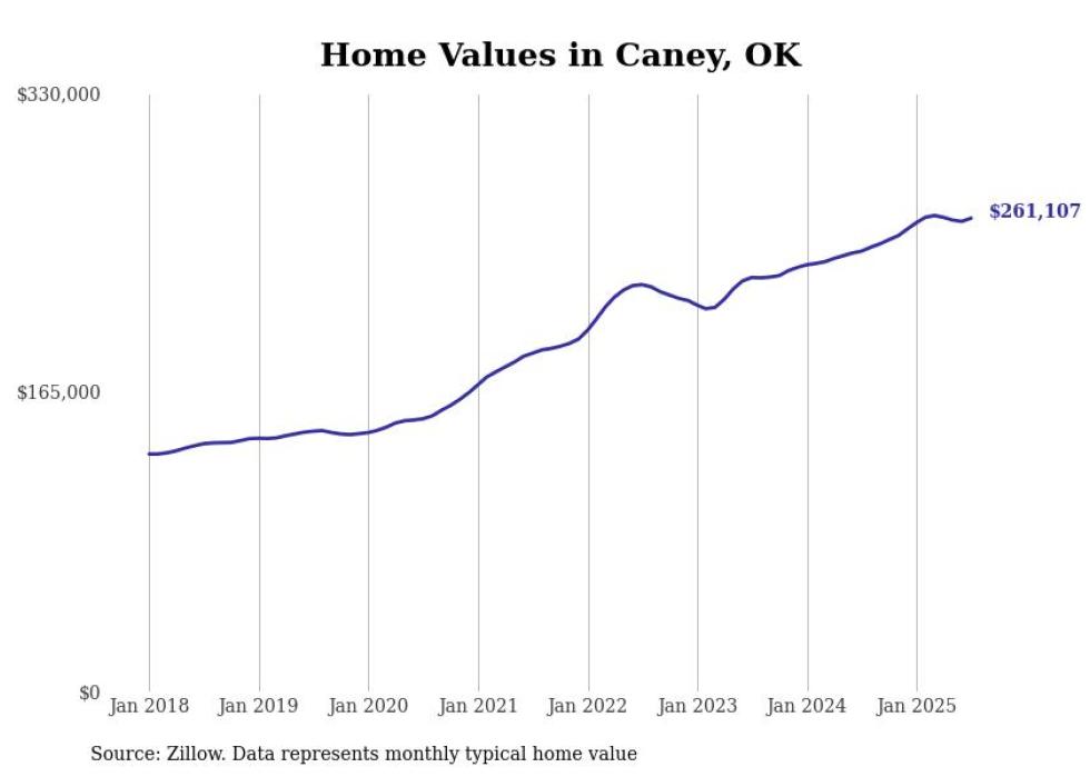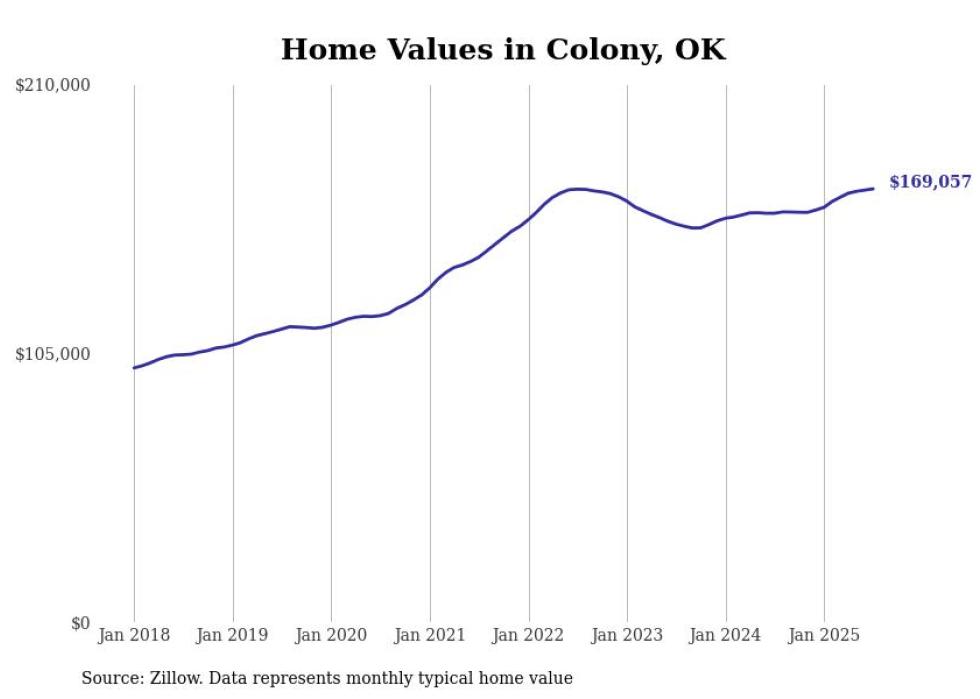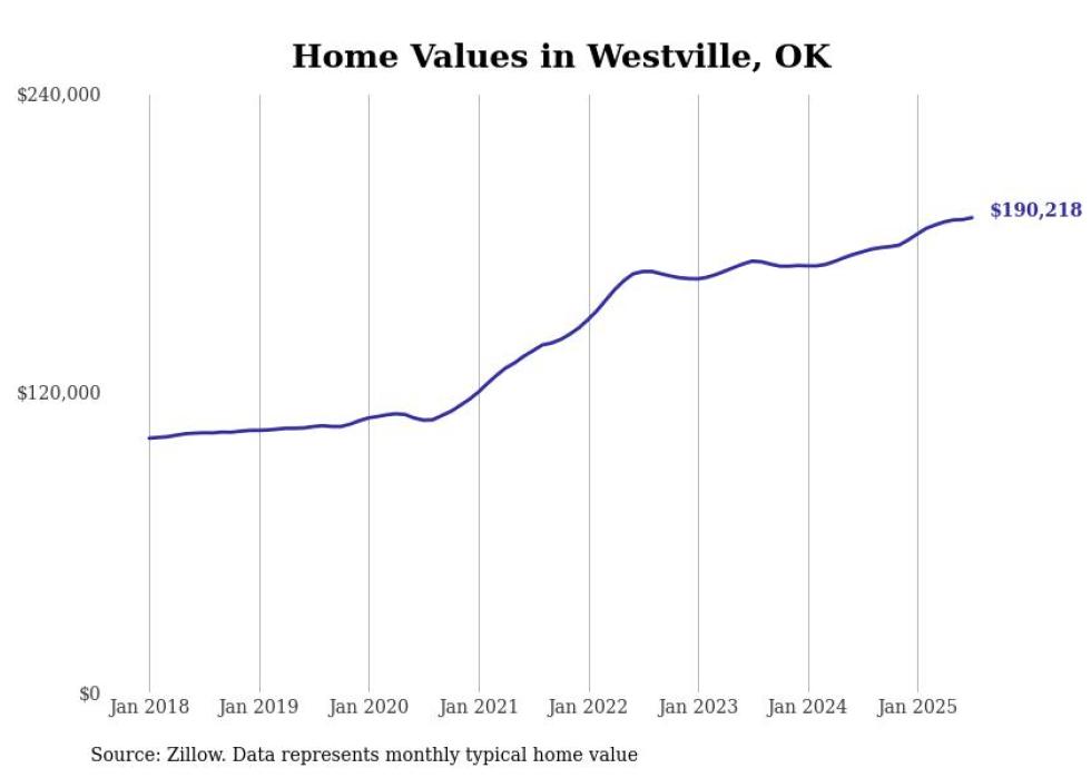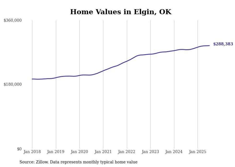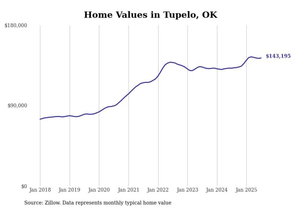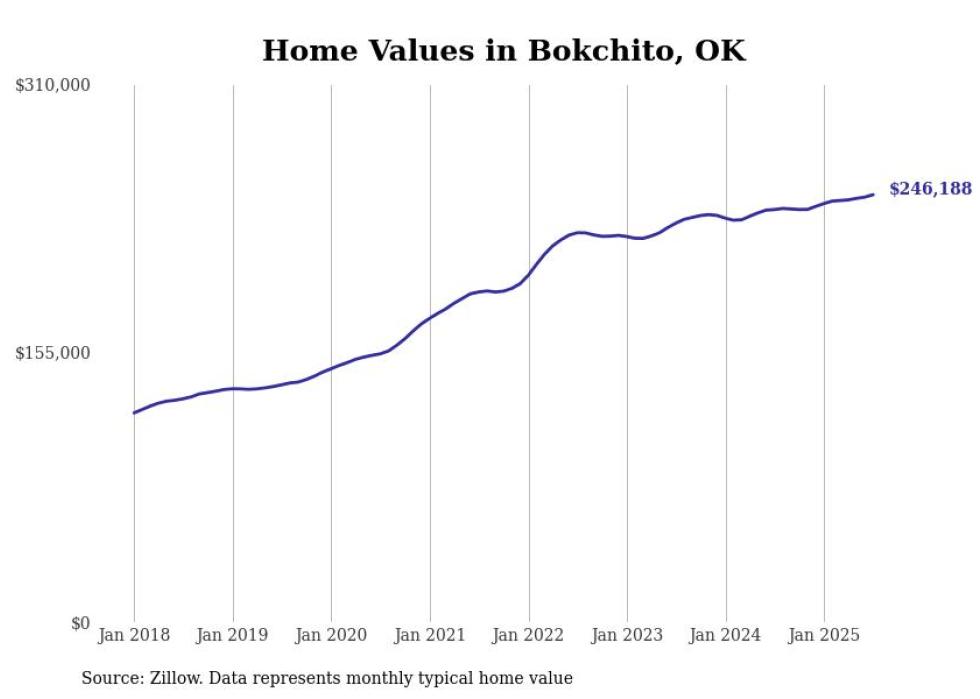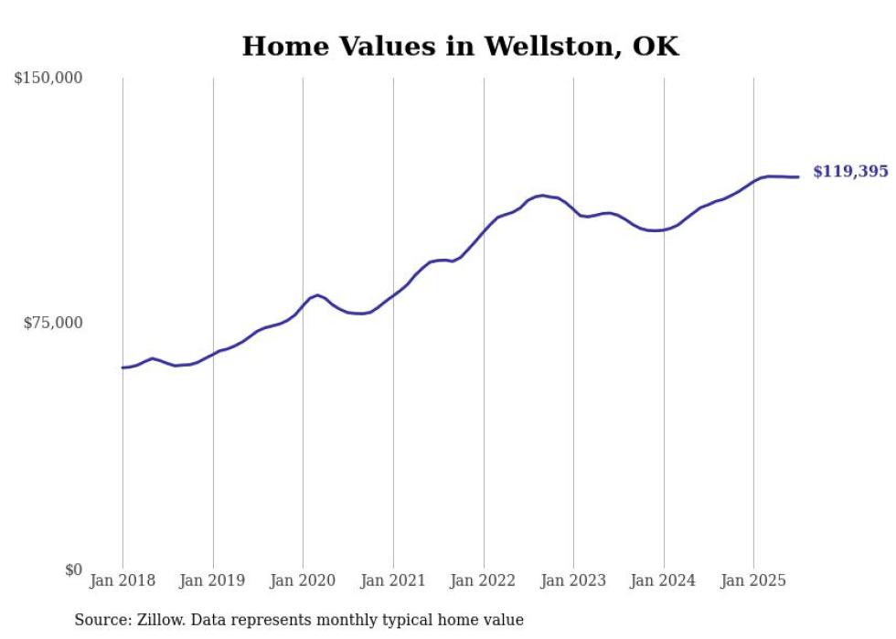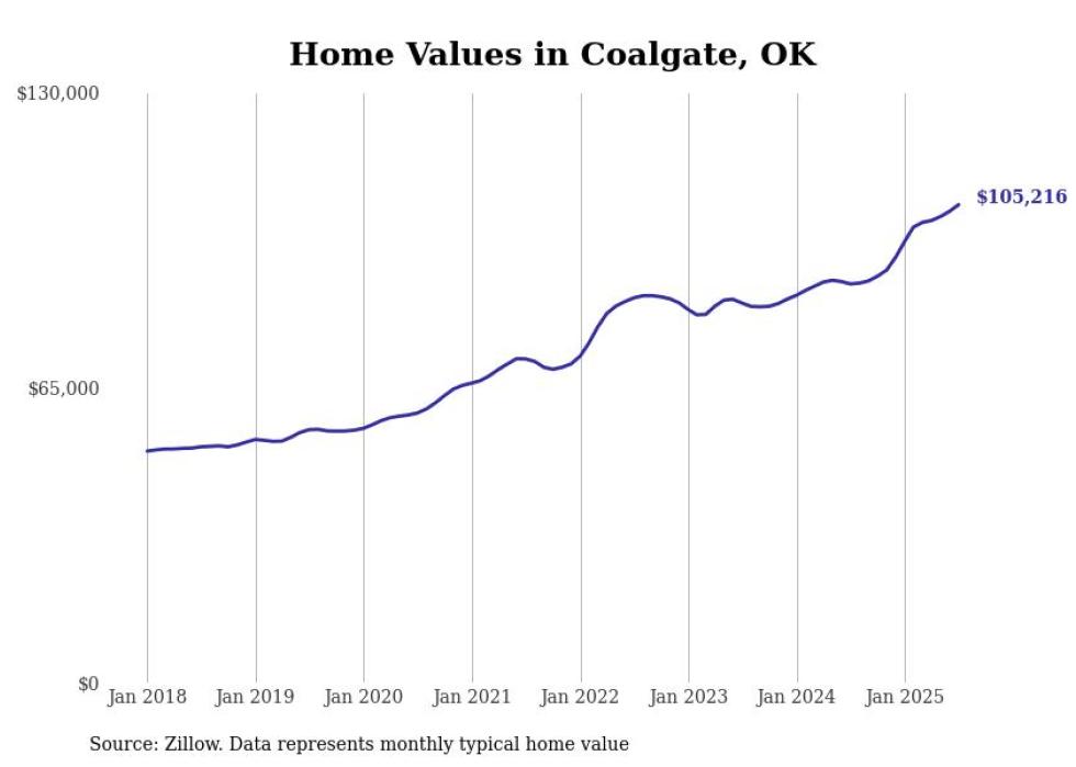 Stacker compiled a list of cities with the fastest-growing home prices in Oklahoma using data from Zillow. Cities are ranked by the dollar change in the Zillow Home Values Index for all homes from the 12 months ending July 2025. The charts in this story were created automatically using Matplotlib. Data was available for 50 cities and towns in Oklahoma.