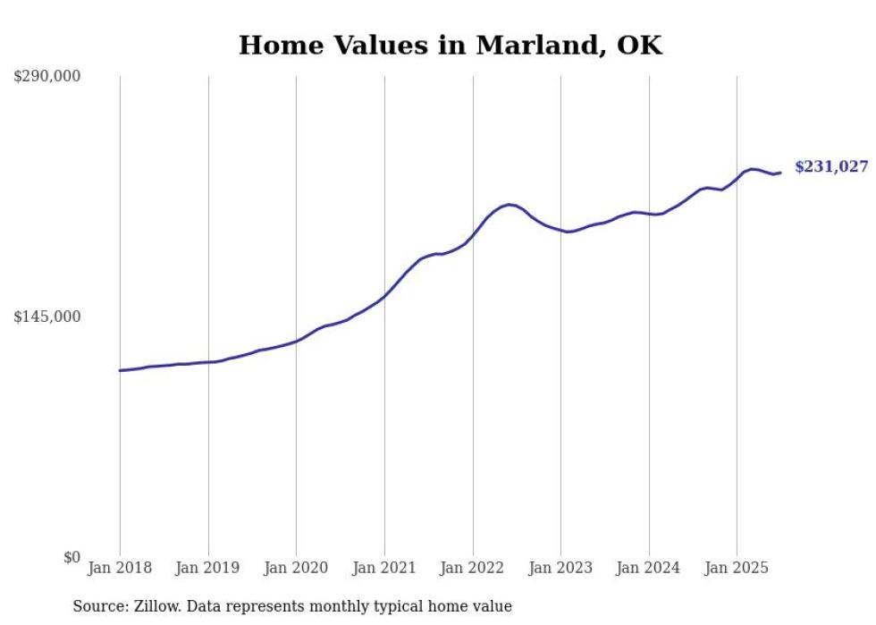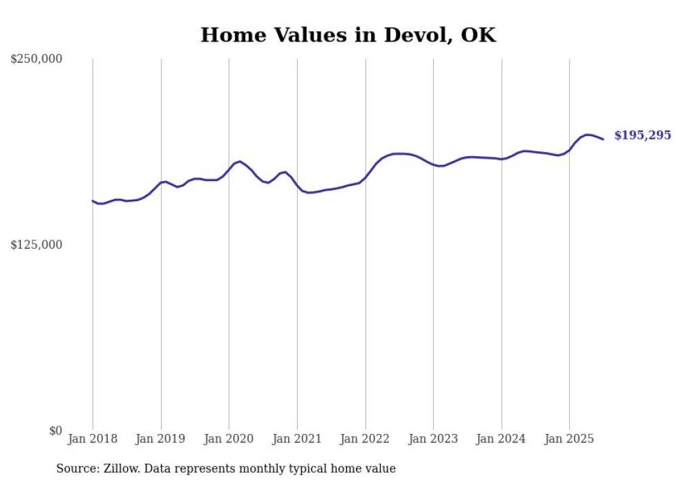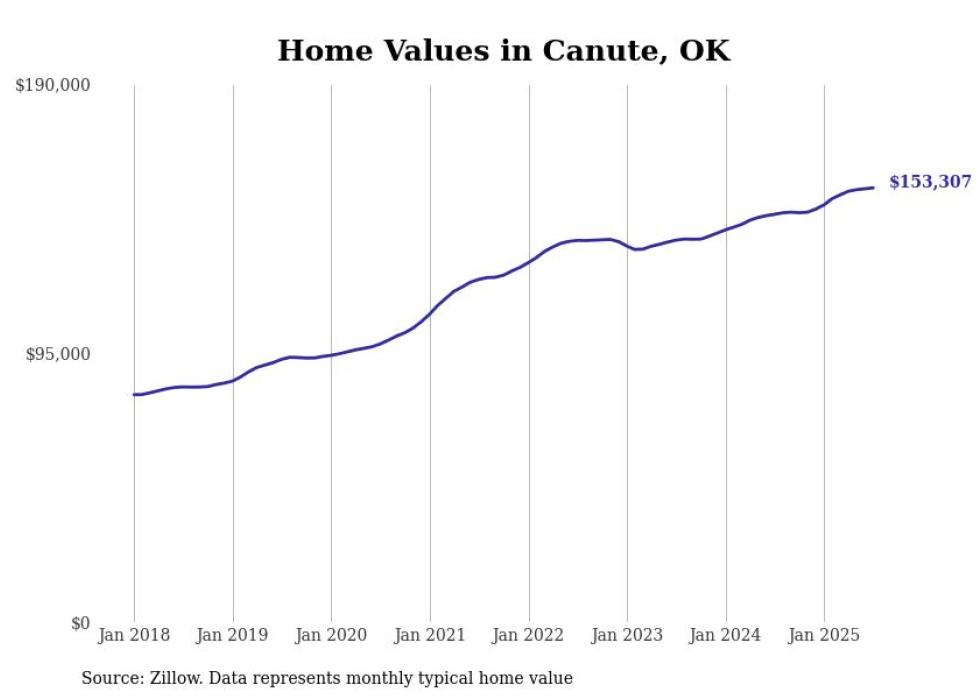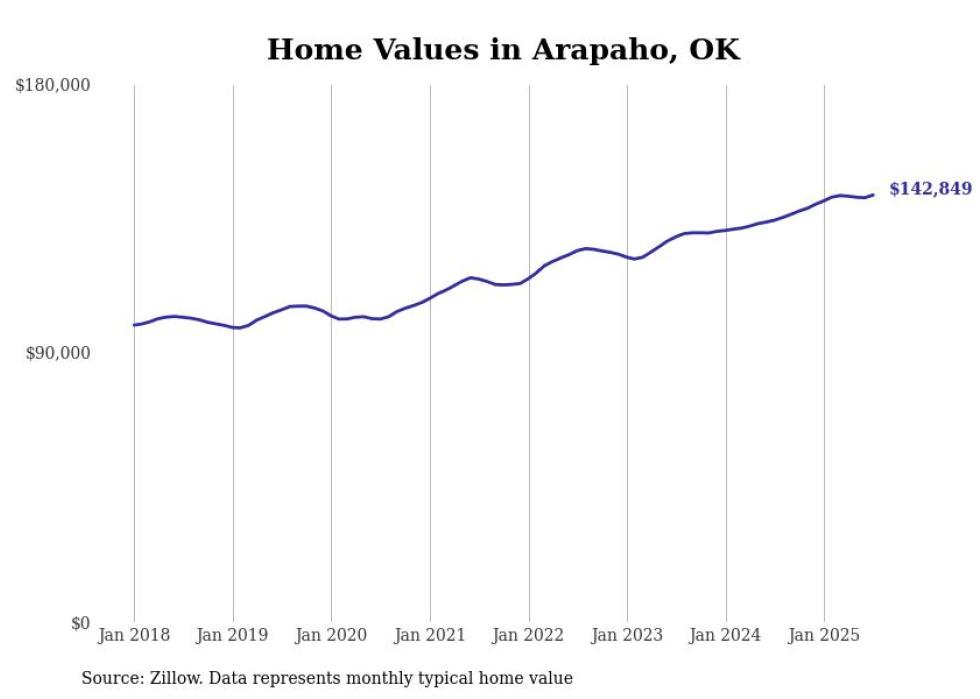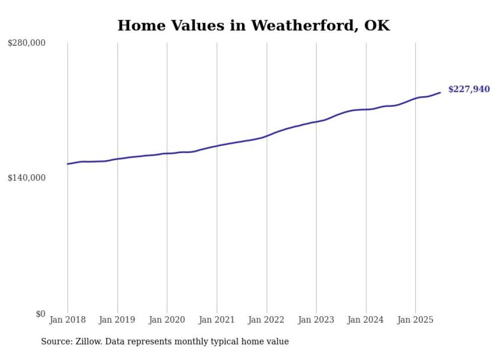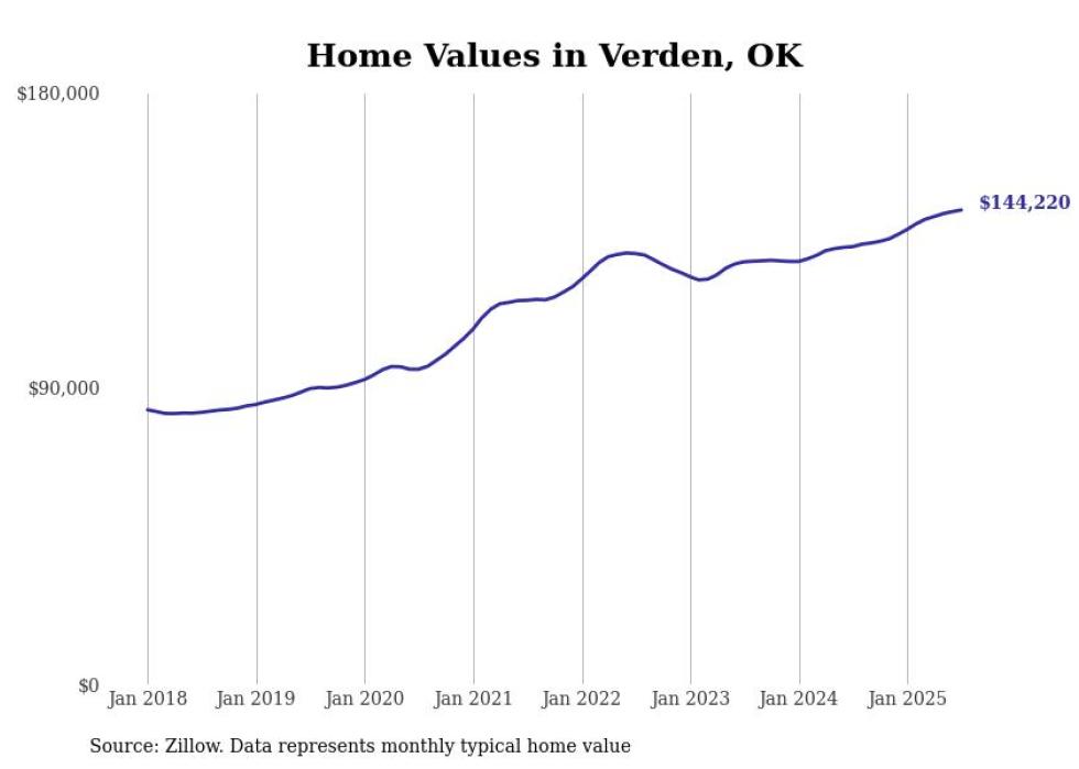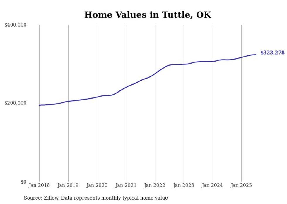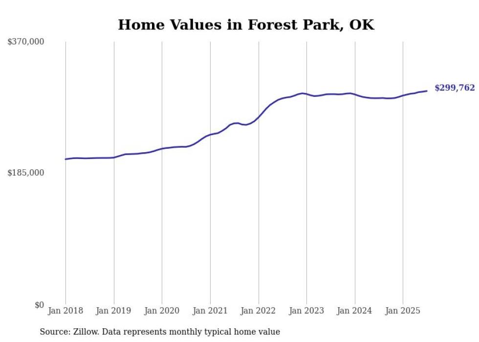 Stacker compiled a list of cities with the fastest-growing home prices in Oklahoma using data from Zillow. Cities are ranked by the dollar change in the Zillow Home Values Index for all homes from the 12 months ending July 2025. The charts in this story were created automatically using Matplotlib. Data was available for 50 cities and towns in Oklahoma.