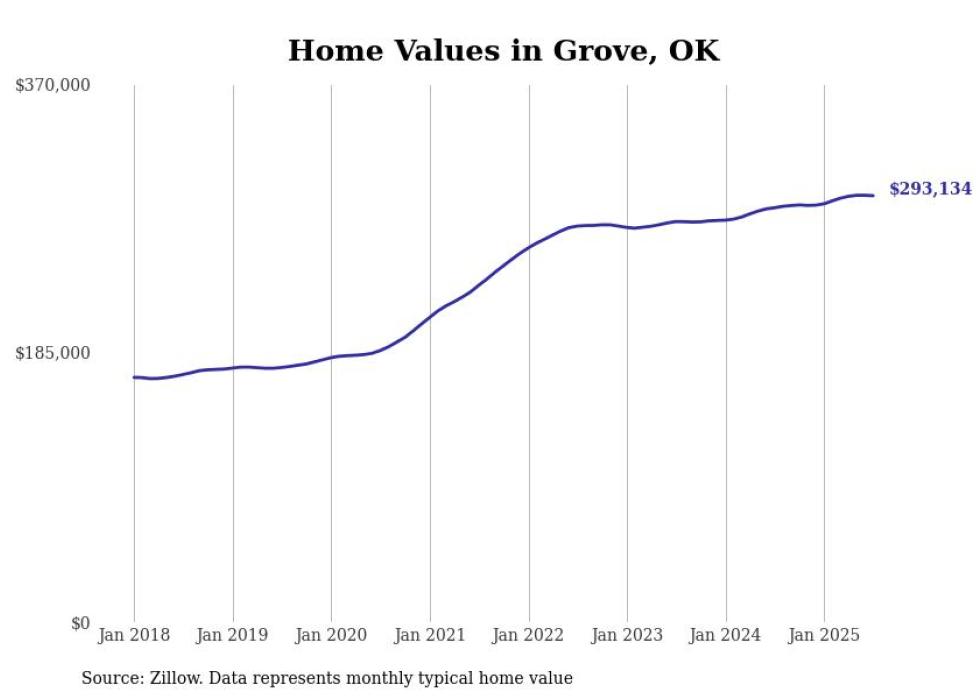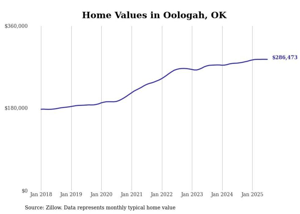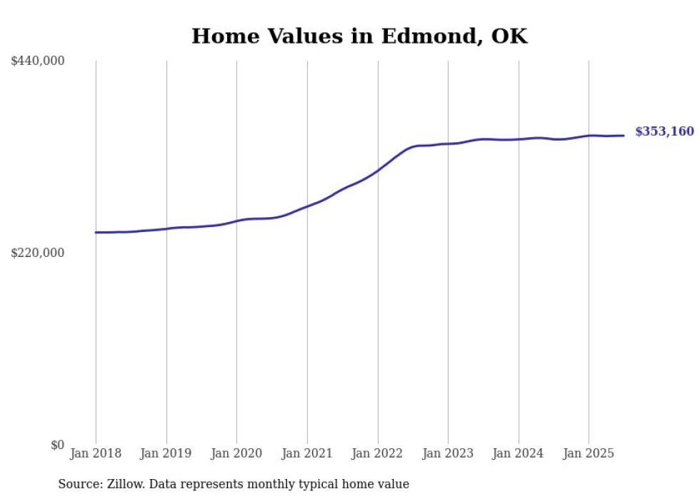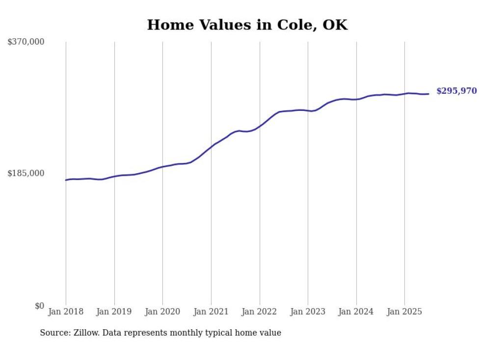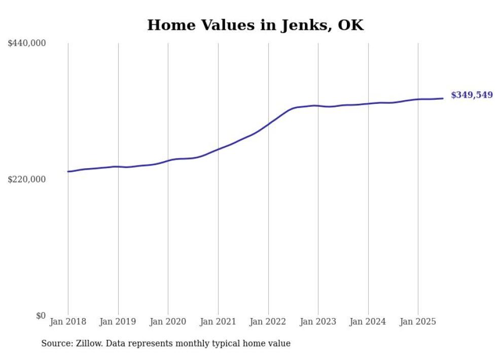 Stacker compiled a list of cities with the most expensive homes in Oklahoma using data from Zillow. Cities are ranked by the Zillow Home Values Index for all homes as of July 2025. The charts in this story were created automatically using Matplotlib.