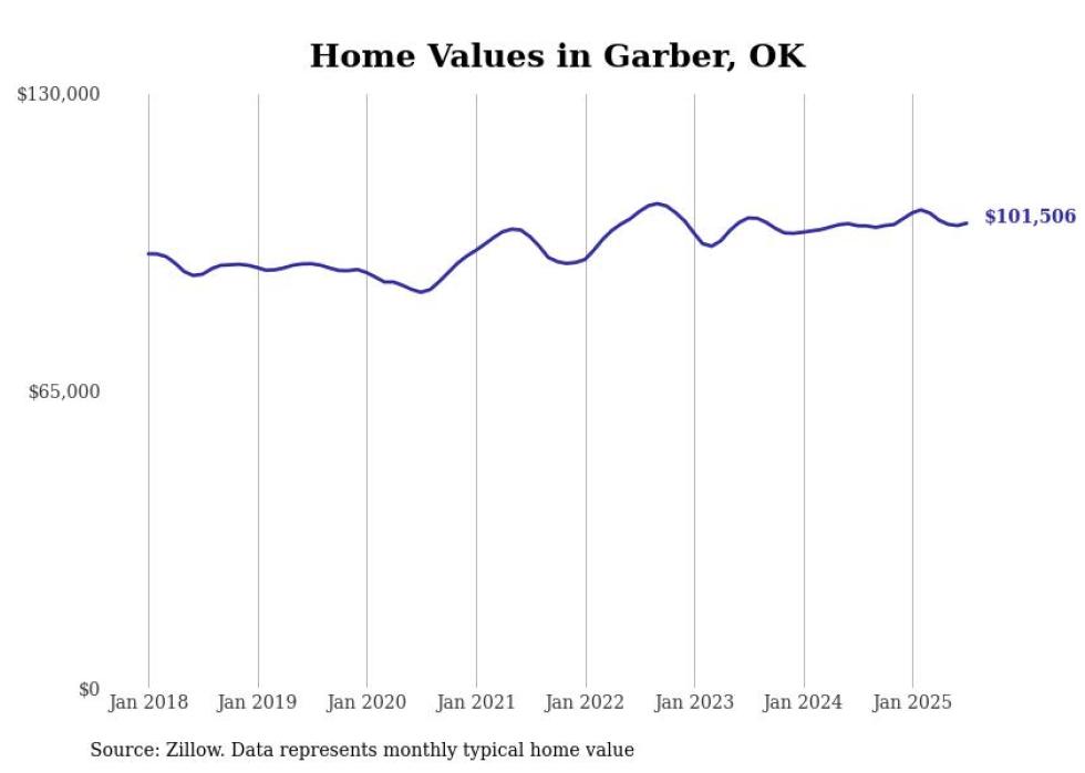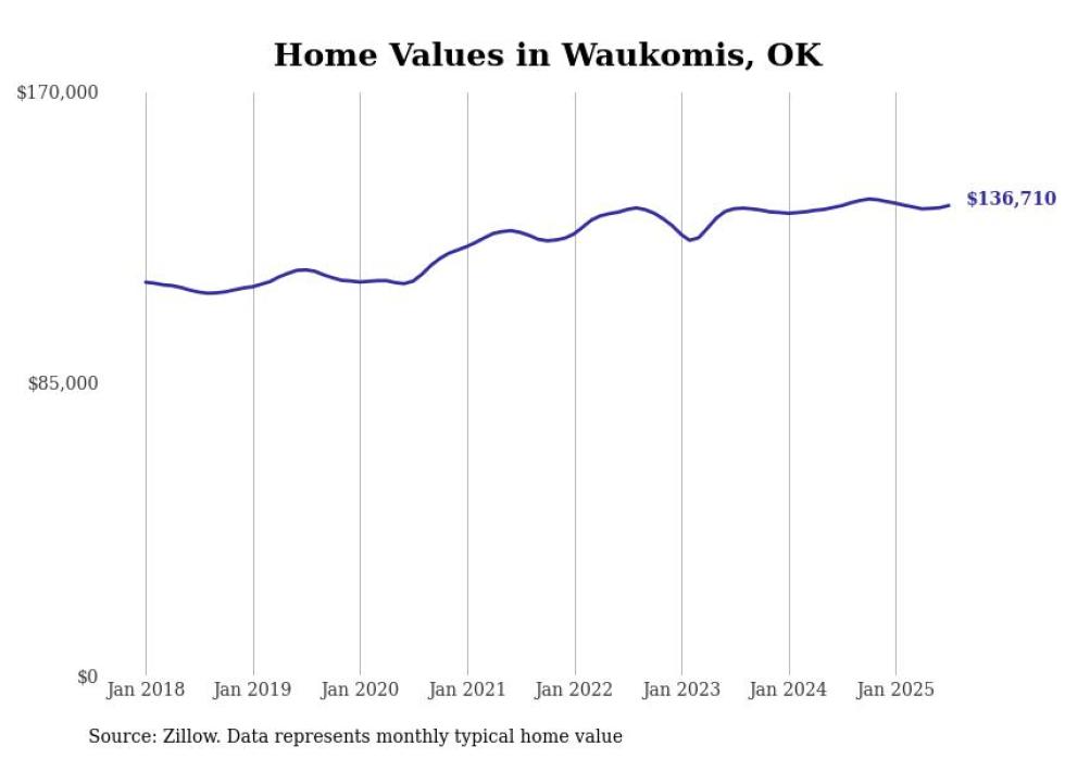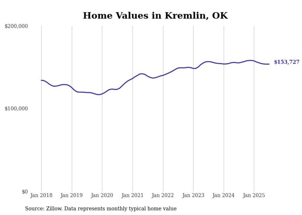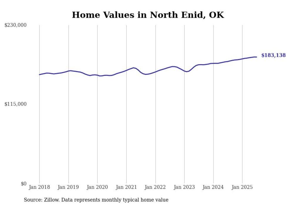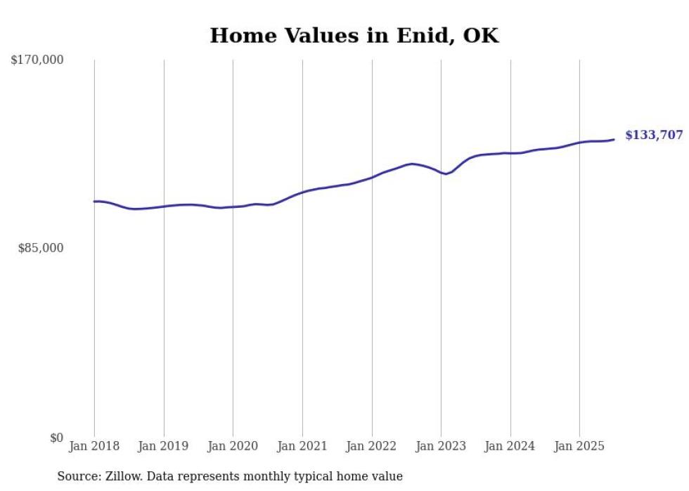Stacker compiled a list of cities with the most expensive homes in the Enid metro area using data from Zillow. Charts show the monthly typical home value since January 2018. All 11 cities and towns with data available were included in the list.