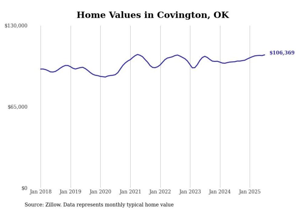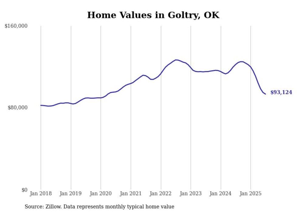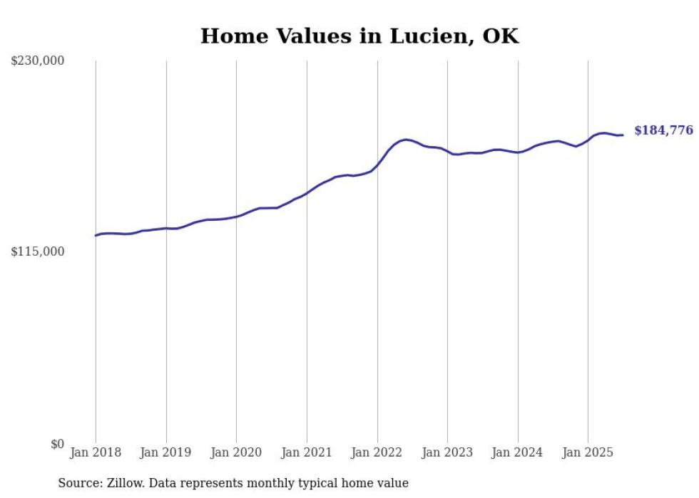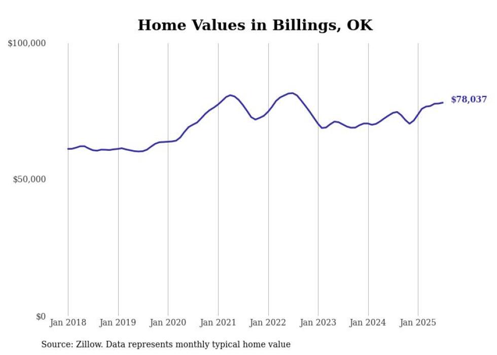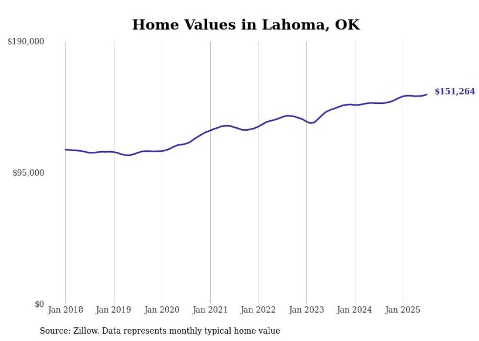 Stacker compiled a list of cities with the most expensive homes in the Enid metro area using data from Zillow. Charts show the monthly typical home value since January 2018. All 11 cities and towns with data available were included in the list.