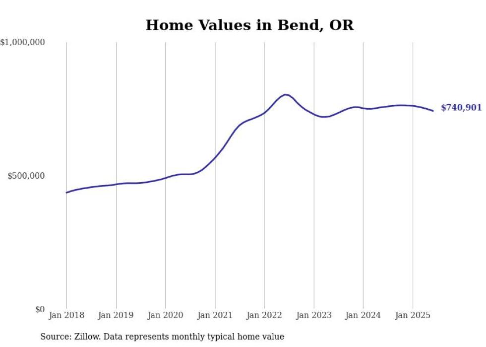 Stacker compiled a list of cities with the most expensive homes in the Bend, OR metro area using data from Zillow. Charts show the monthly typical home value since January 2018.