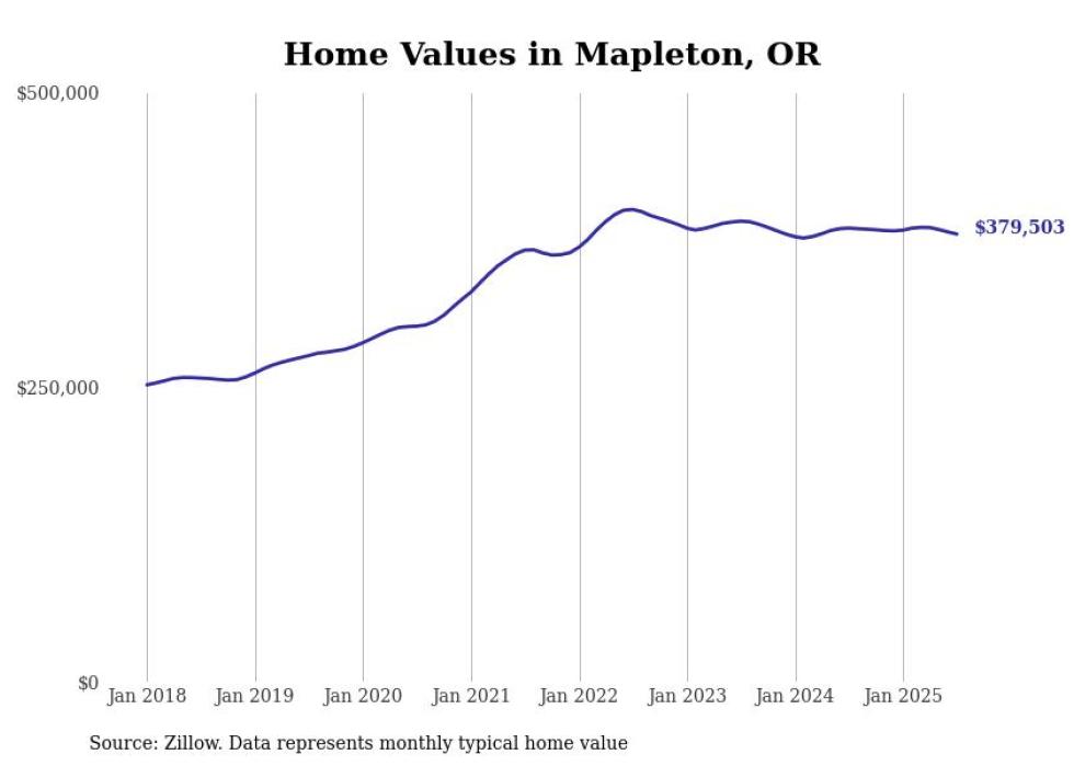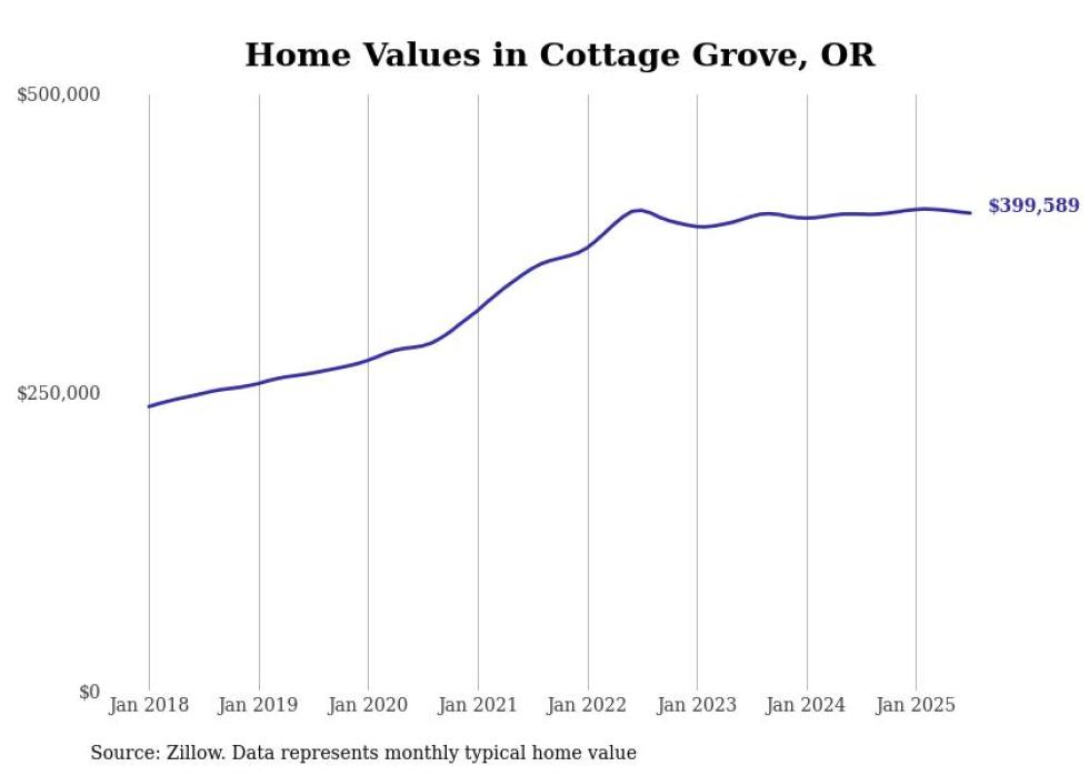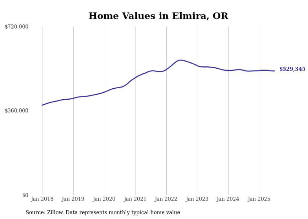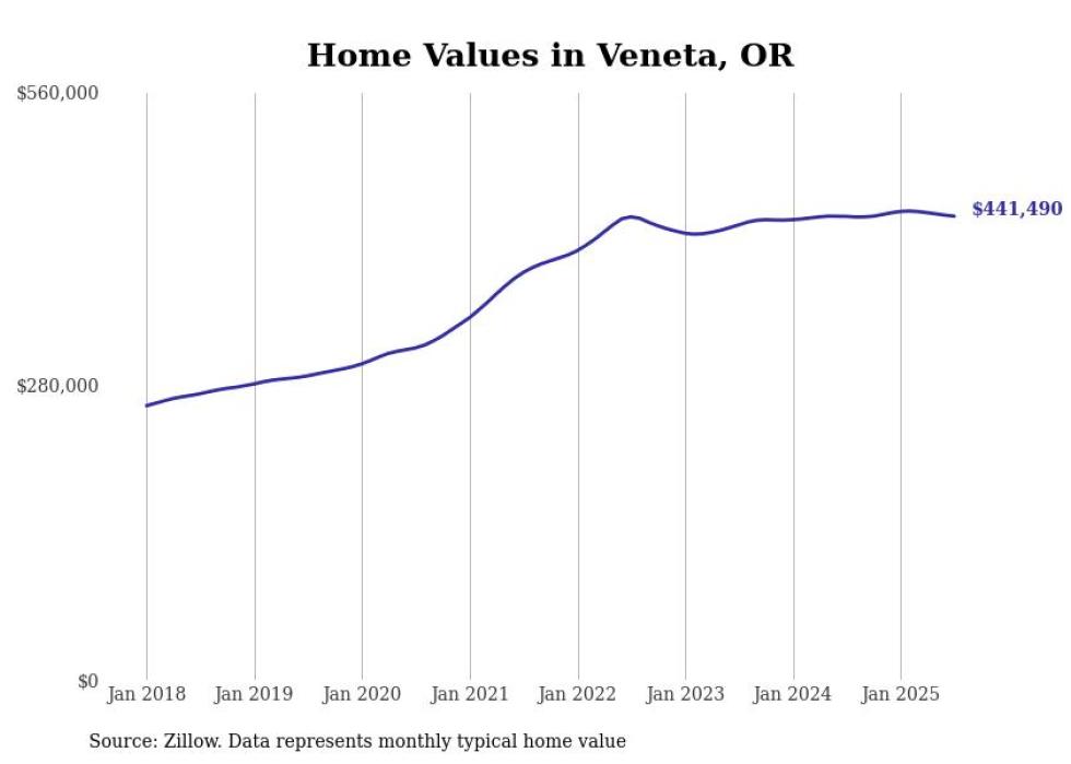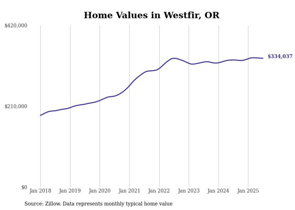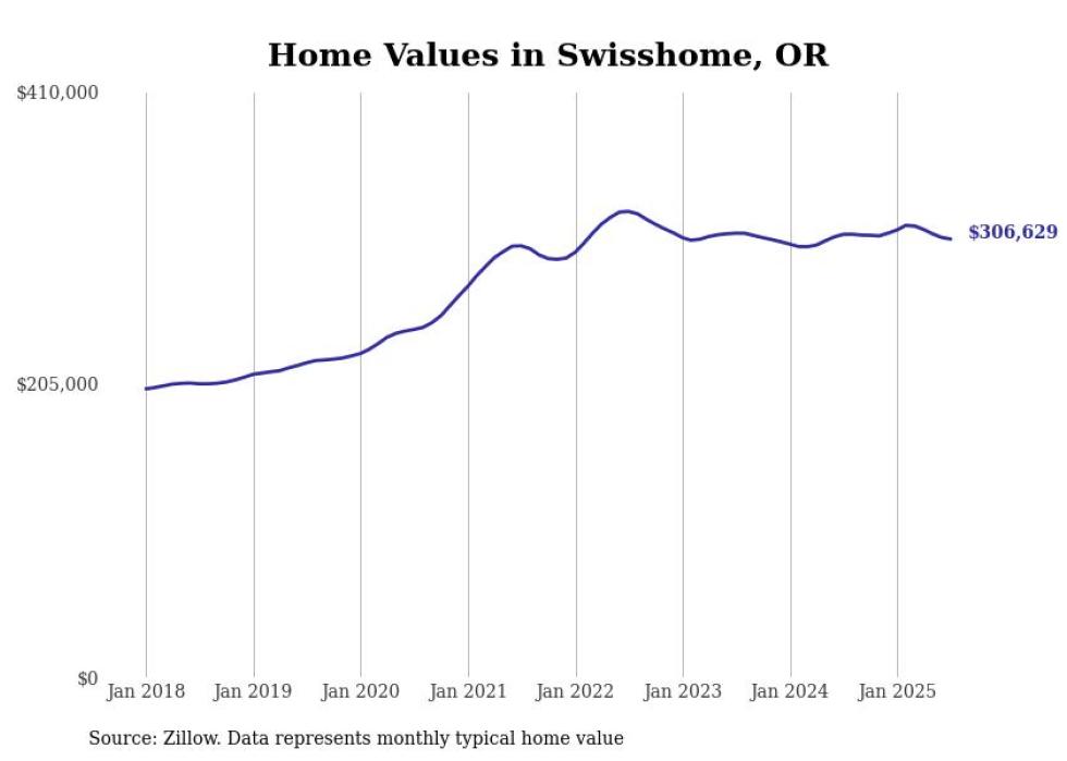 Stacker compiled a list of cities with the most expensive homes in the Eugene metro area using data from Zillow. Charts show the monthly typical home value since January 2018. All 25 cities and towns with data available were included in the list.