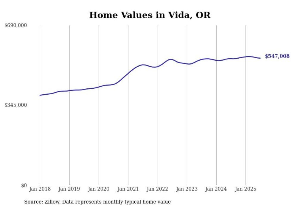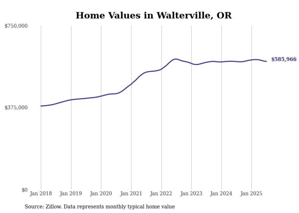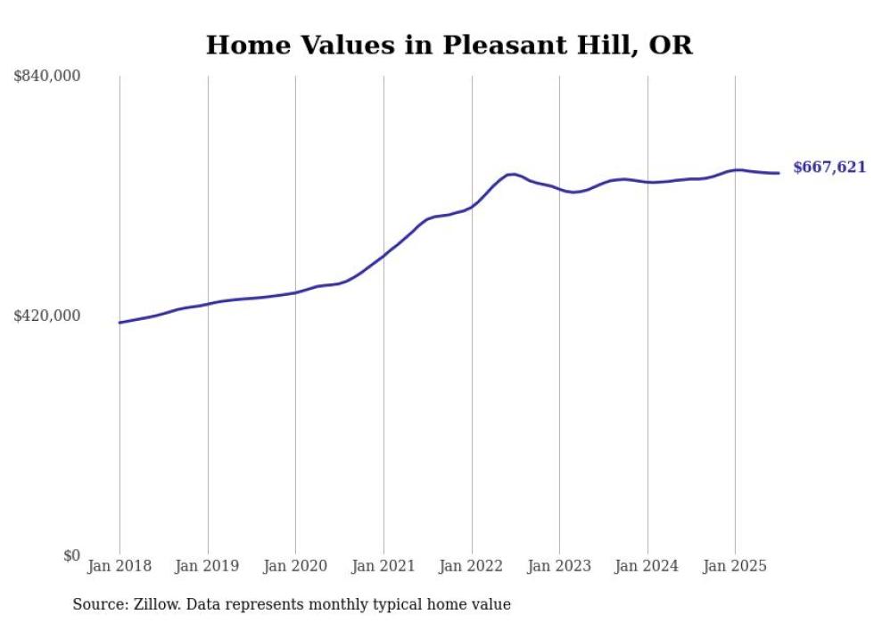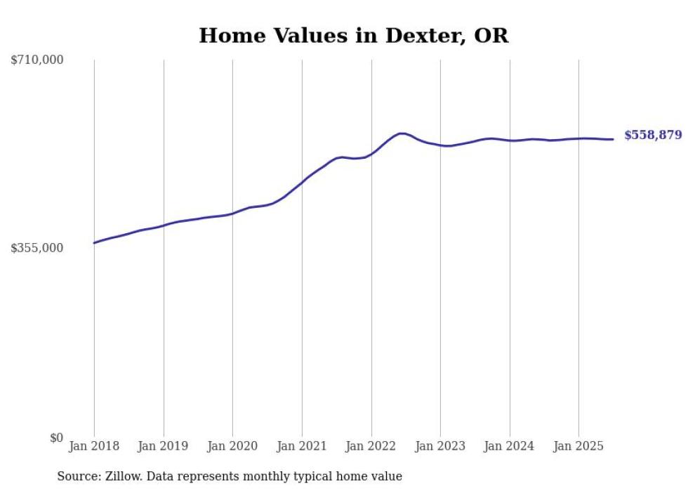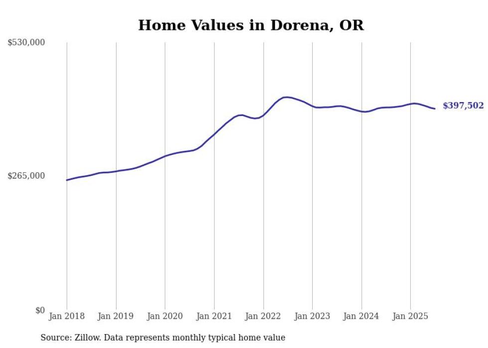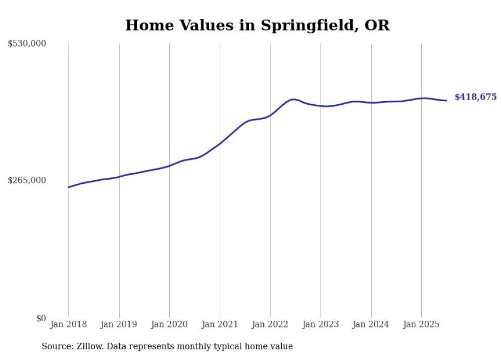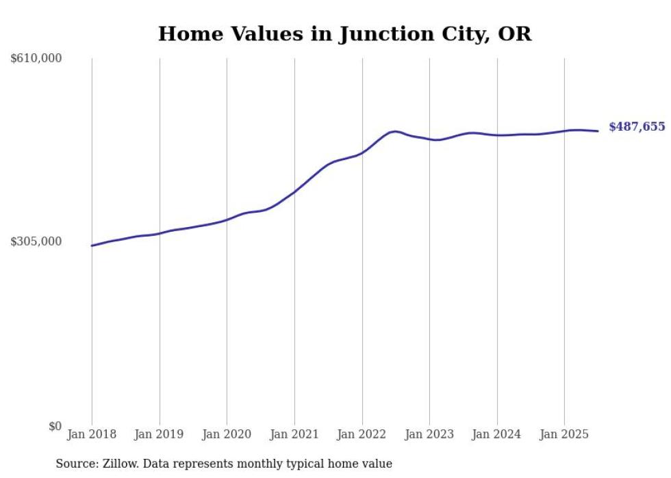 Stacker compiled a list of cities with the most expensive homes in the Eugene metro area using data from Zillow. Charts show the monthly typical home value since January 2018. All 25 cities and towns with data available were included in the list.