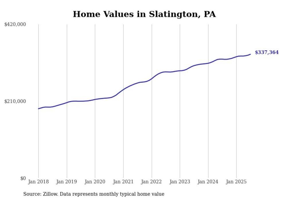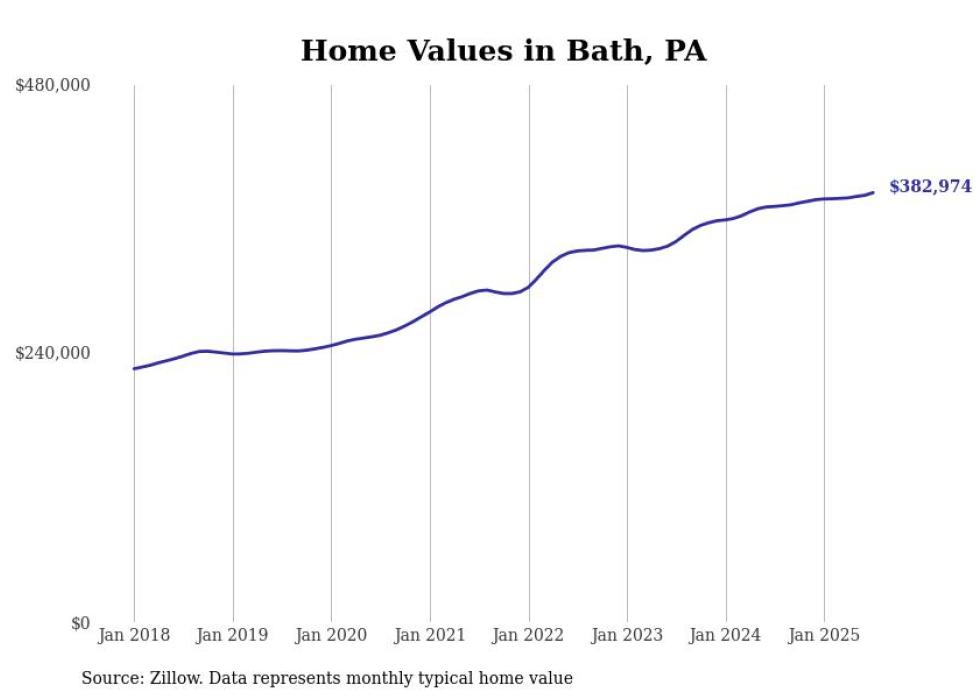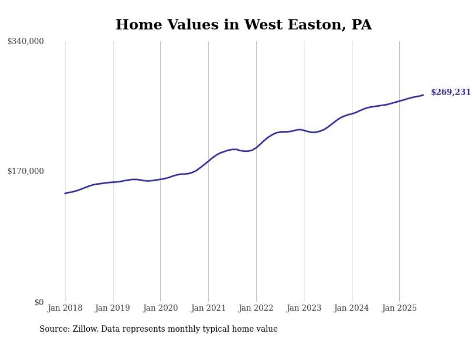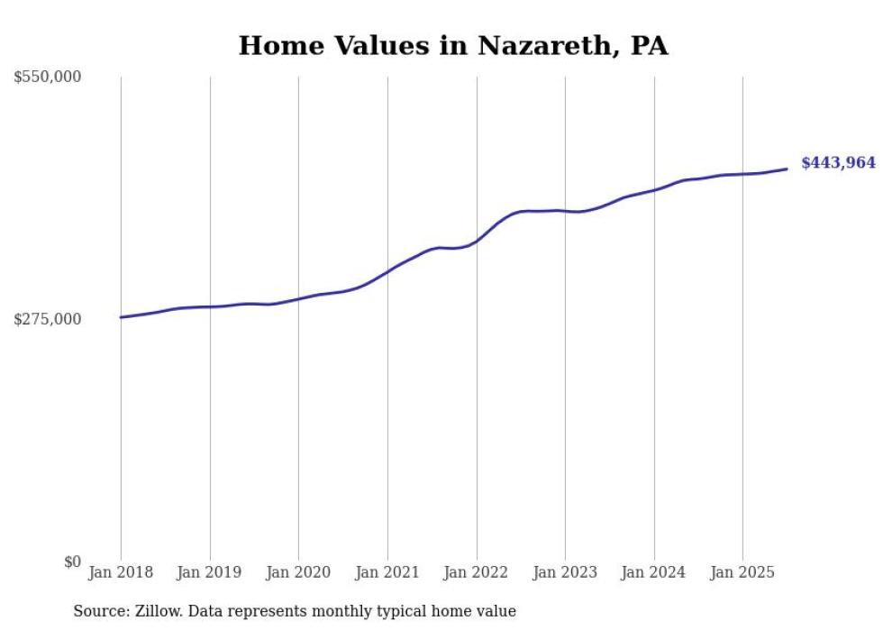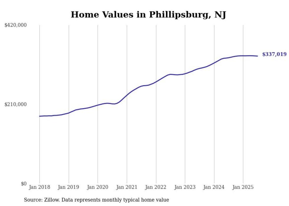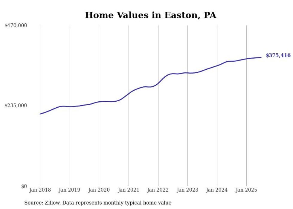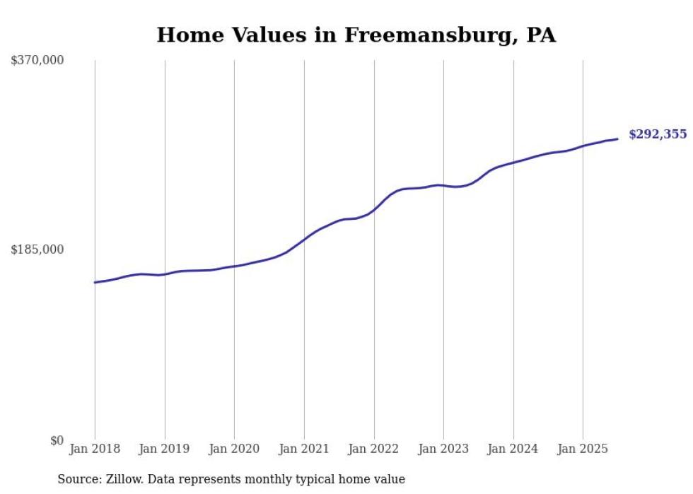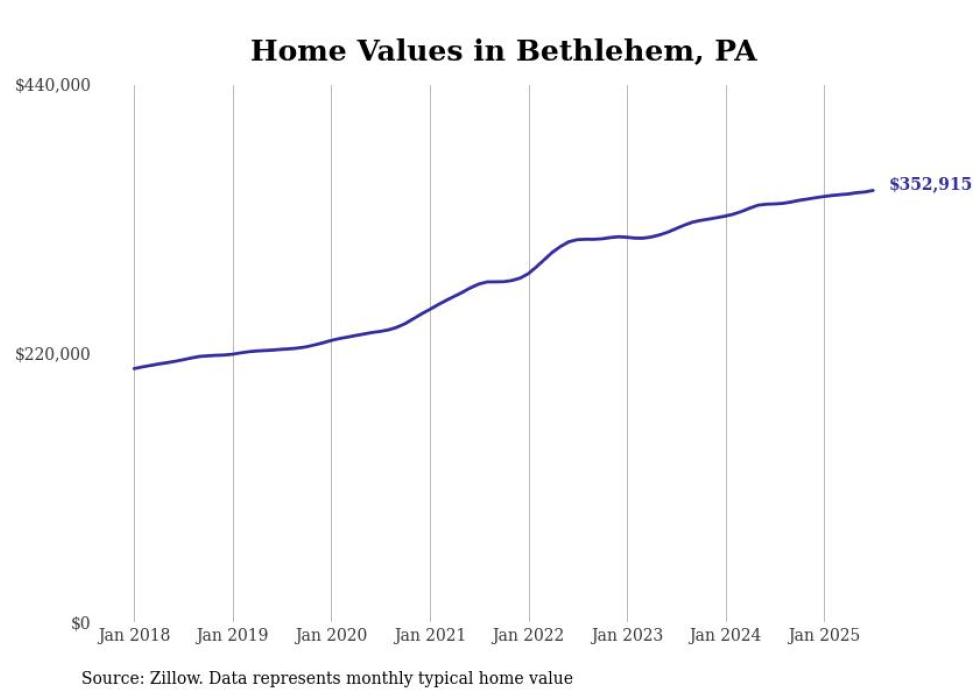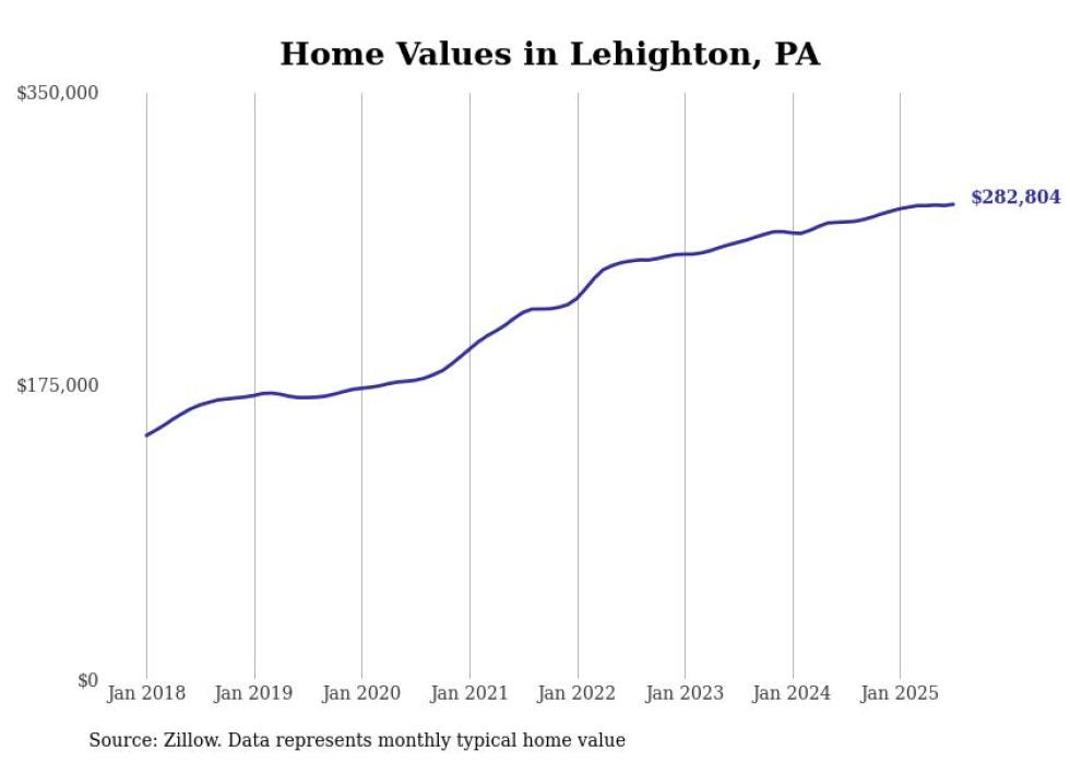 Stacker compiled a list of cities with the most expensive homes in the Allentown metro area using data from Zillow. Charts show the monthly typical home value since January 2018. Data was available for 42 cities and towns.