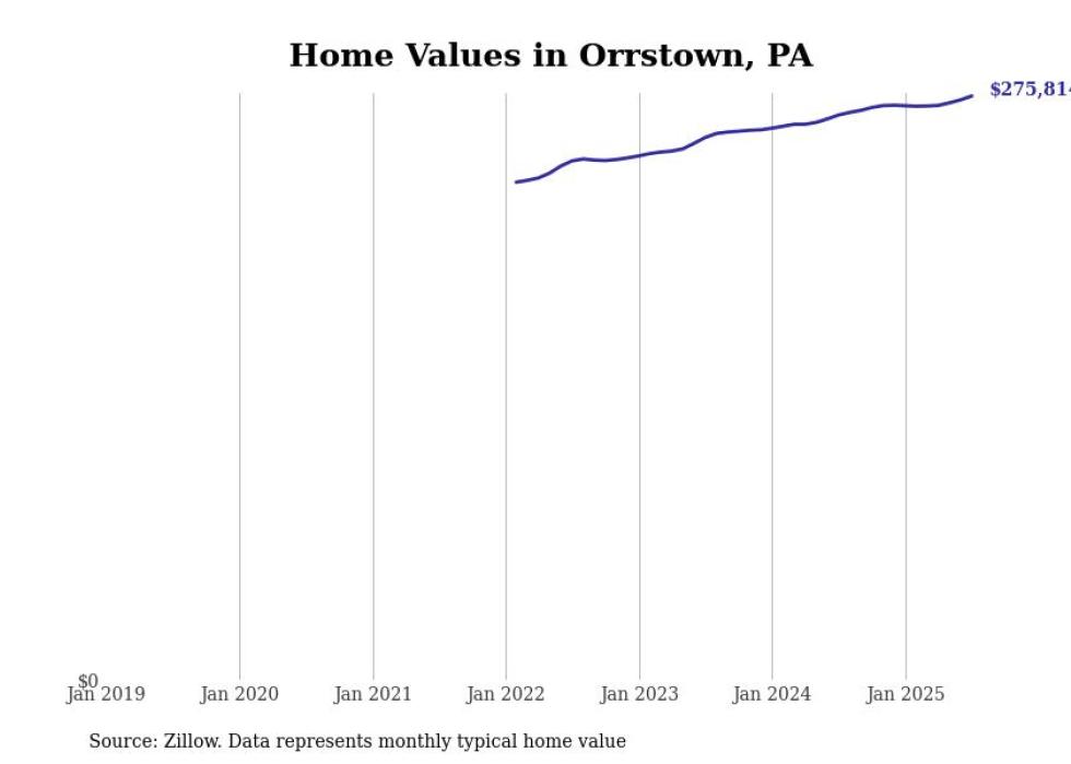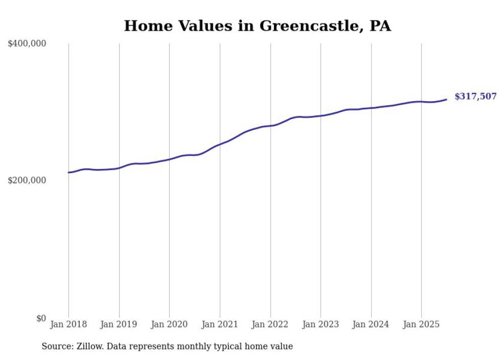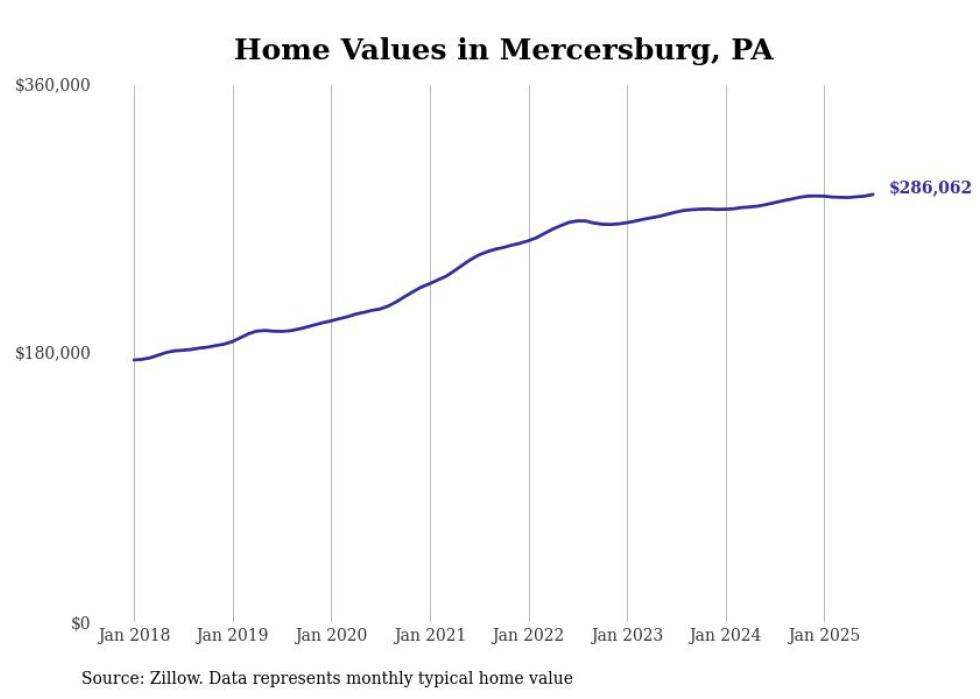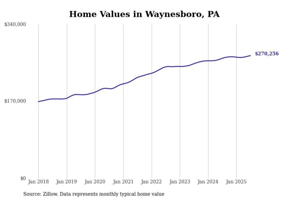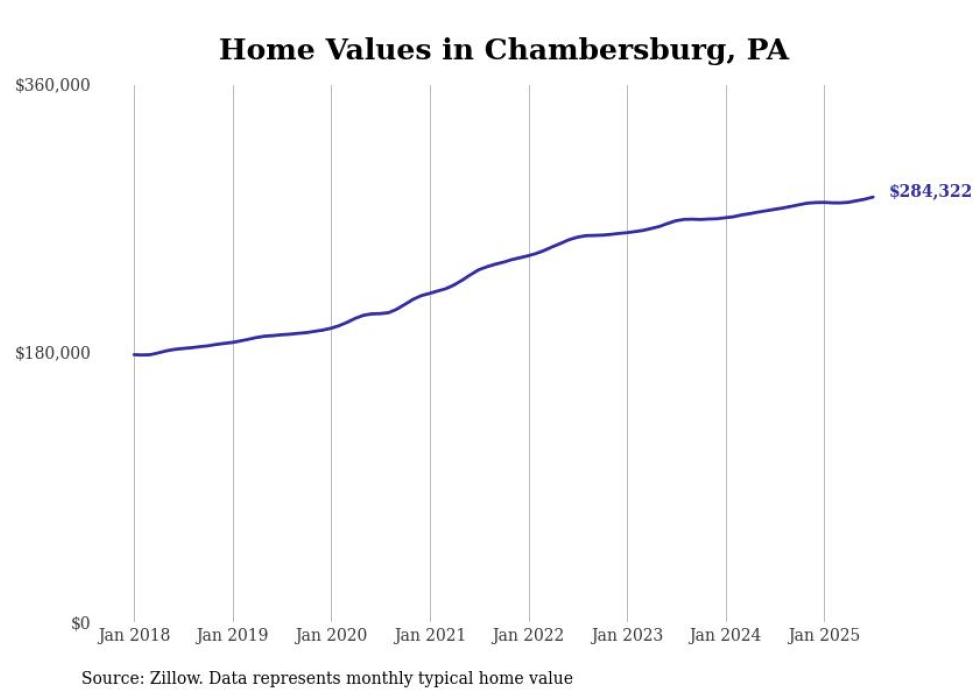 Stacker compiled a list of cities with the most expensive homes in the Chambersburg metro area using data from Zillow. Charts show the monthly typical home value since January 2018. All 7 cities and towns with data available were included in the list.