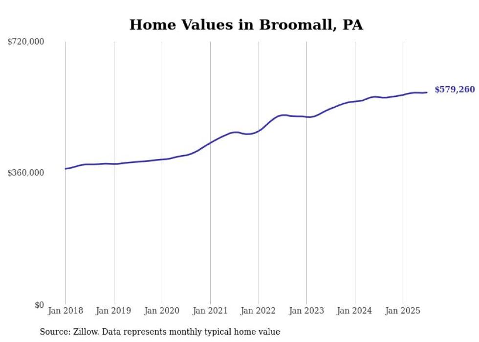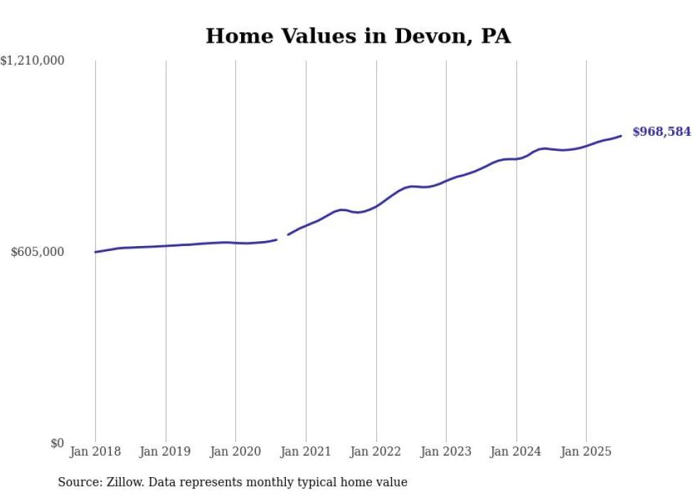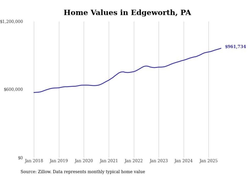 Stacker compiled a list of cities with the most expensive homes in Pennsylvania using data from Zillow. Cities are ranked by the Zillow Home Values Index for all homes as of July 2025. The charts in this story were created automatically using Matplotlib.