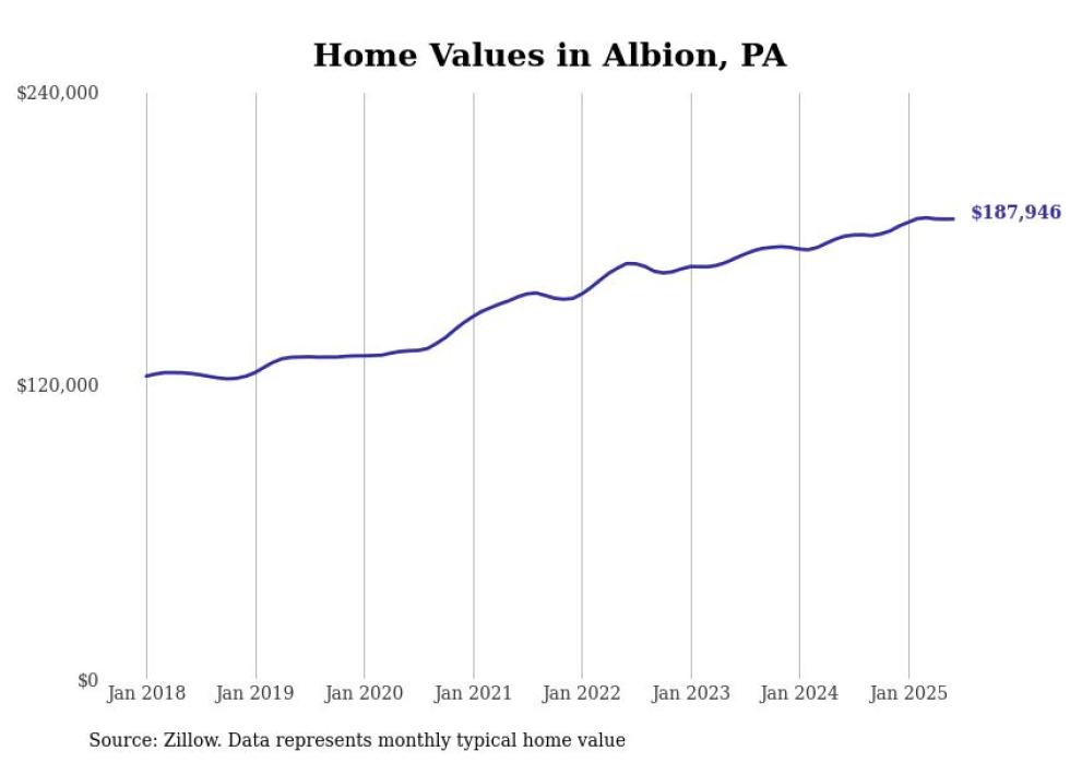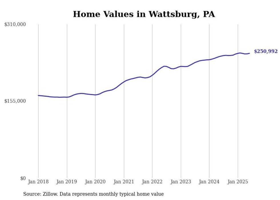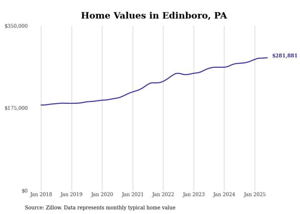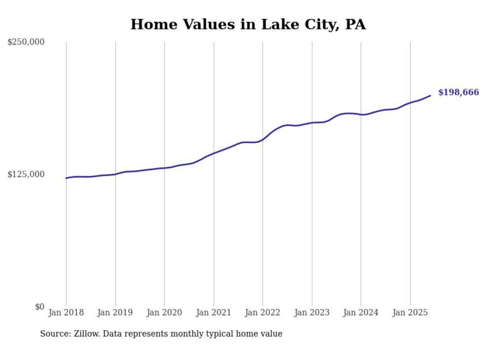 Stacker compiled a list of cities with the most expensive homes in the Erie, PA metro area using data from Zillow. Charts show the monthly typical home value since January 2018.