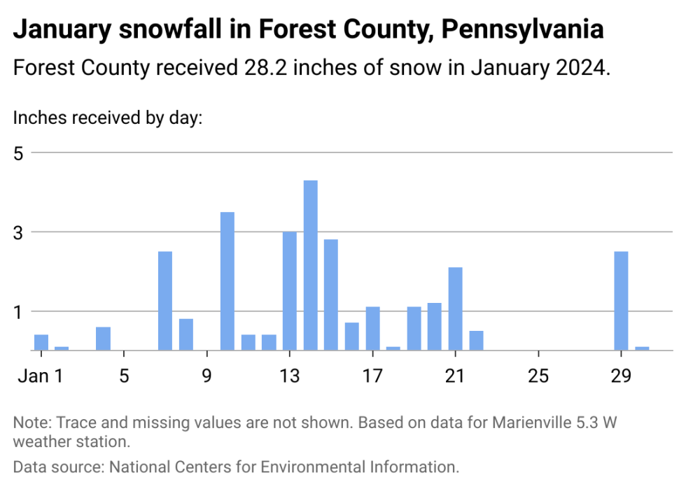 The snowfall total is based on the weather station in Forest County, Pennsylvania that recorded the most snow and also had no more than nine missing days of data. Since this data is only for one weather station, it may not reflect the snowfall patterns across the entire county. On some days, stations report trace snowfall, which is included as a data point but not as part of the overall total for the month. Supplementary data on the average temperature in January 2024 is also included.