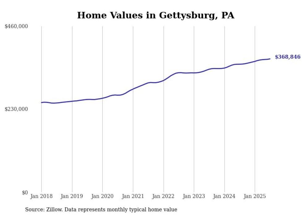 Stacker compiled a list of cities with the most expensive homes in the Gettysburg metro area using data from Zillow. Charts show the monthly typical home value since January 2018. All 10 cities and towns with data available were included in the list.
