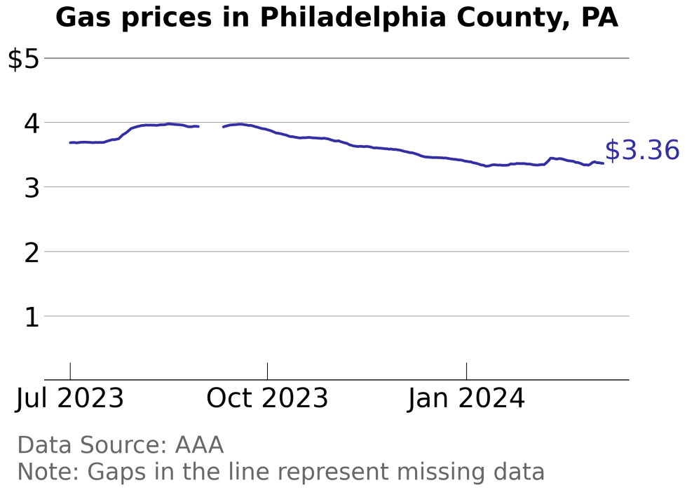 Stacker compiled statistics on gas prices in Philadelphia County using data from AAA. Gas prices are current as of March 11.